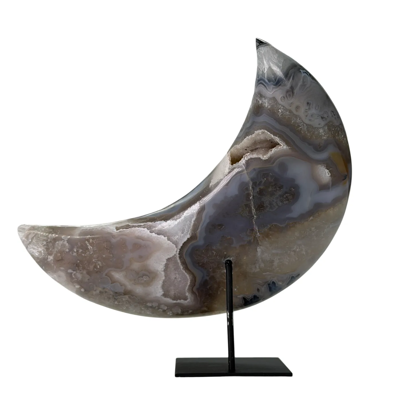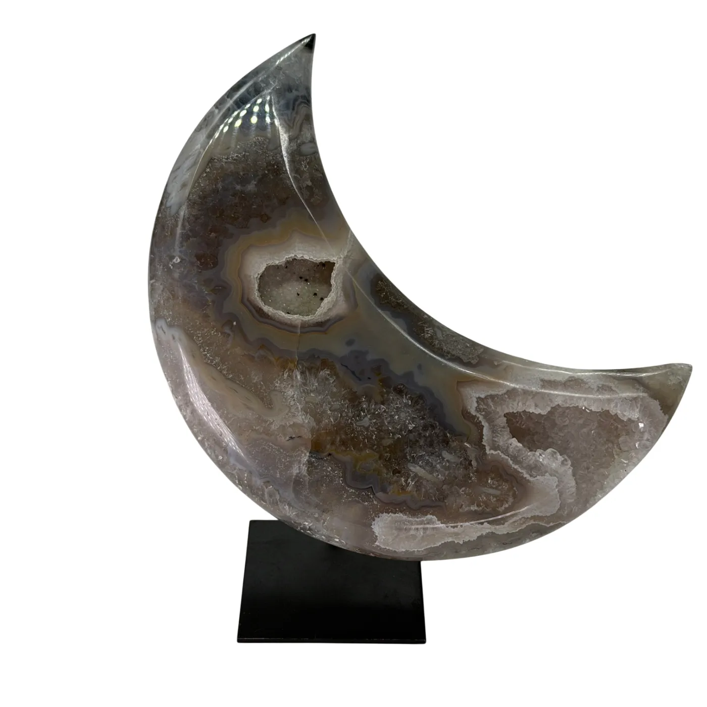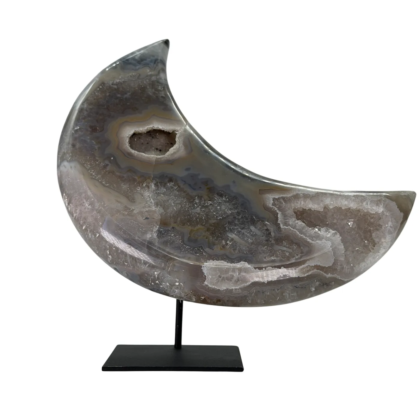 In het midden van de maan bevindt zich een kleine opening met schitterende natuurlijke druzy kristallen, wat dit stuk extra bijzonder maakt. Met zijn unieke vorm en verfijnde uitstraling is deze agaat maan een echte eyecatcher voor elk interieur, kantoor of spirituele ruimte.