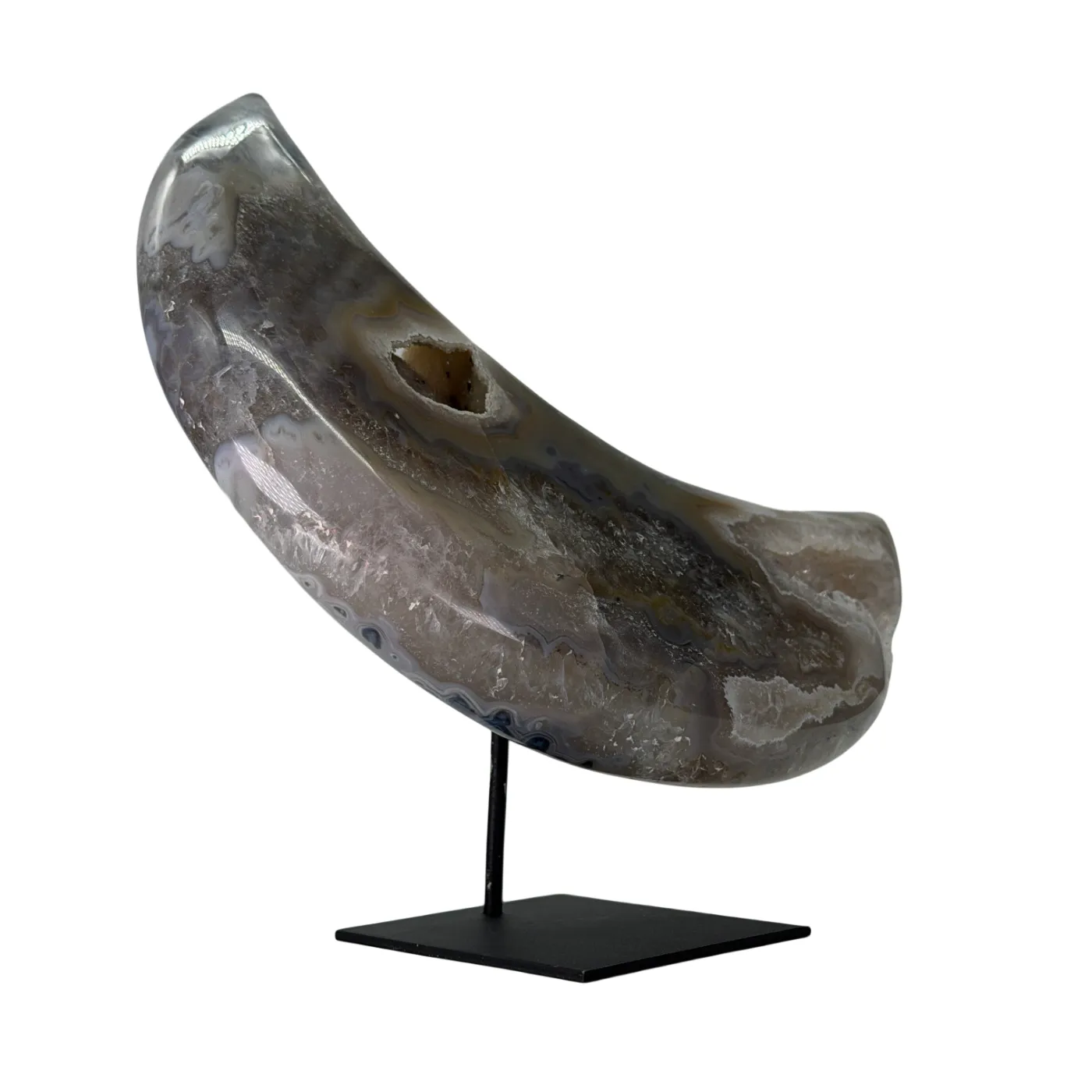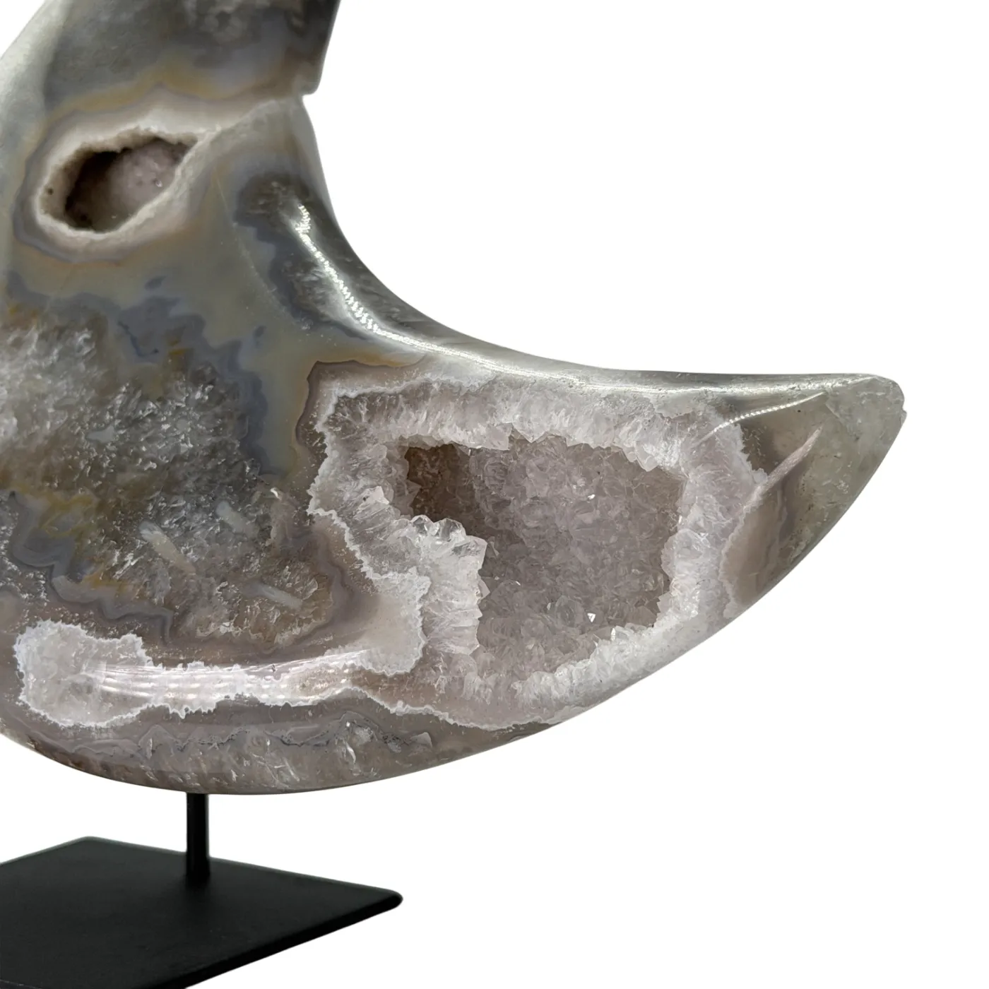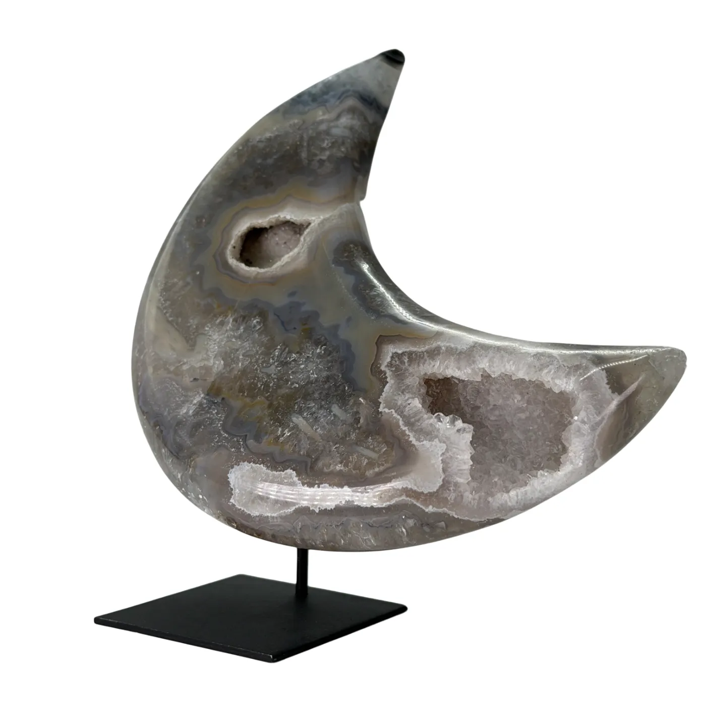 In het midden van de maan bevindt zich een kleine opening met schitterende natuurlijke druzy kristallen, wat dit stuk extra bijzonder maakt. Met zijn unieke vorm en verfijnde uitstraling is deze agaat maan een echte eyecatcher voor elk interieur, kantoor of spirituele ruimte.