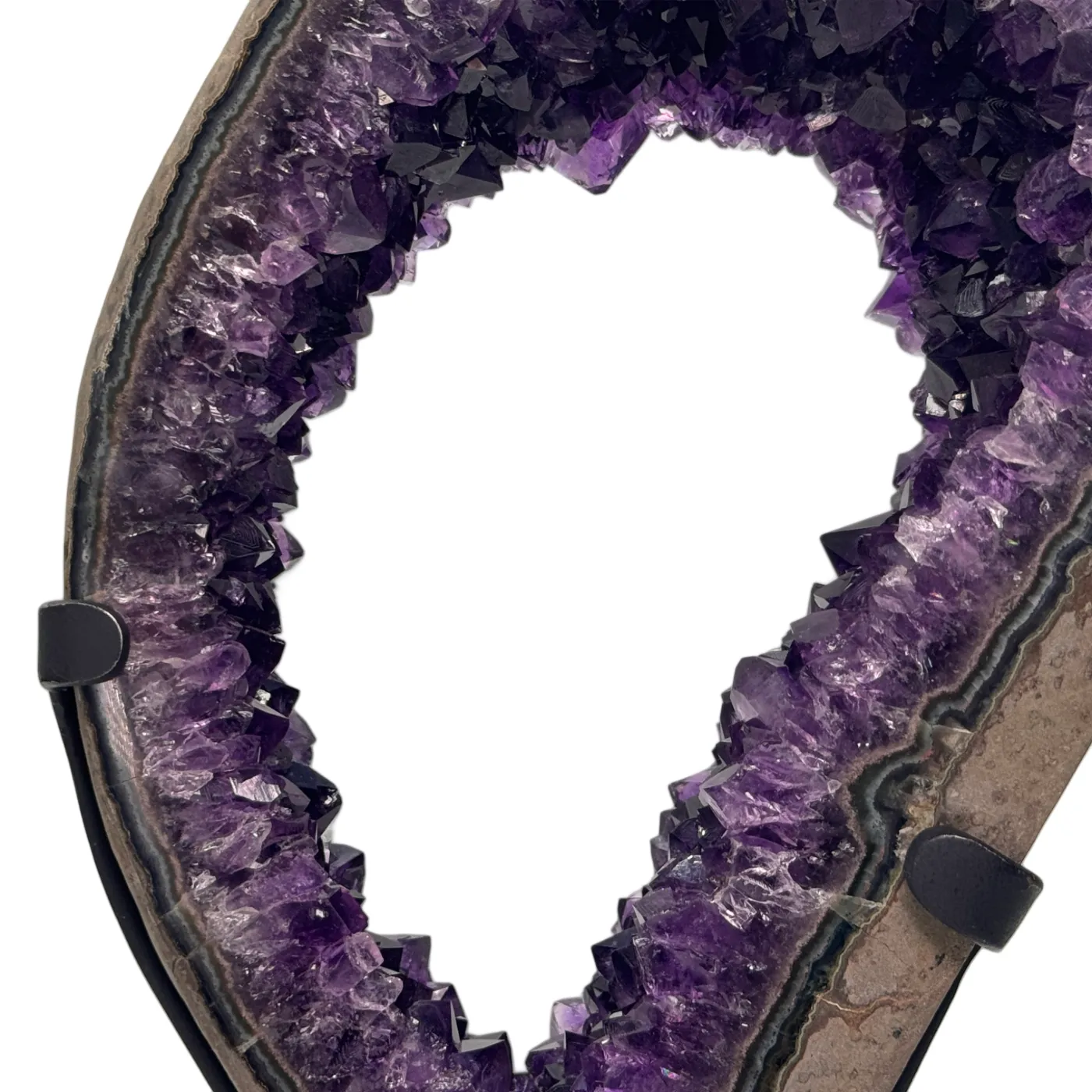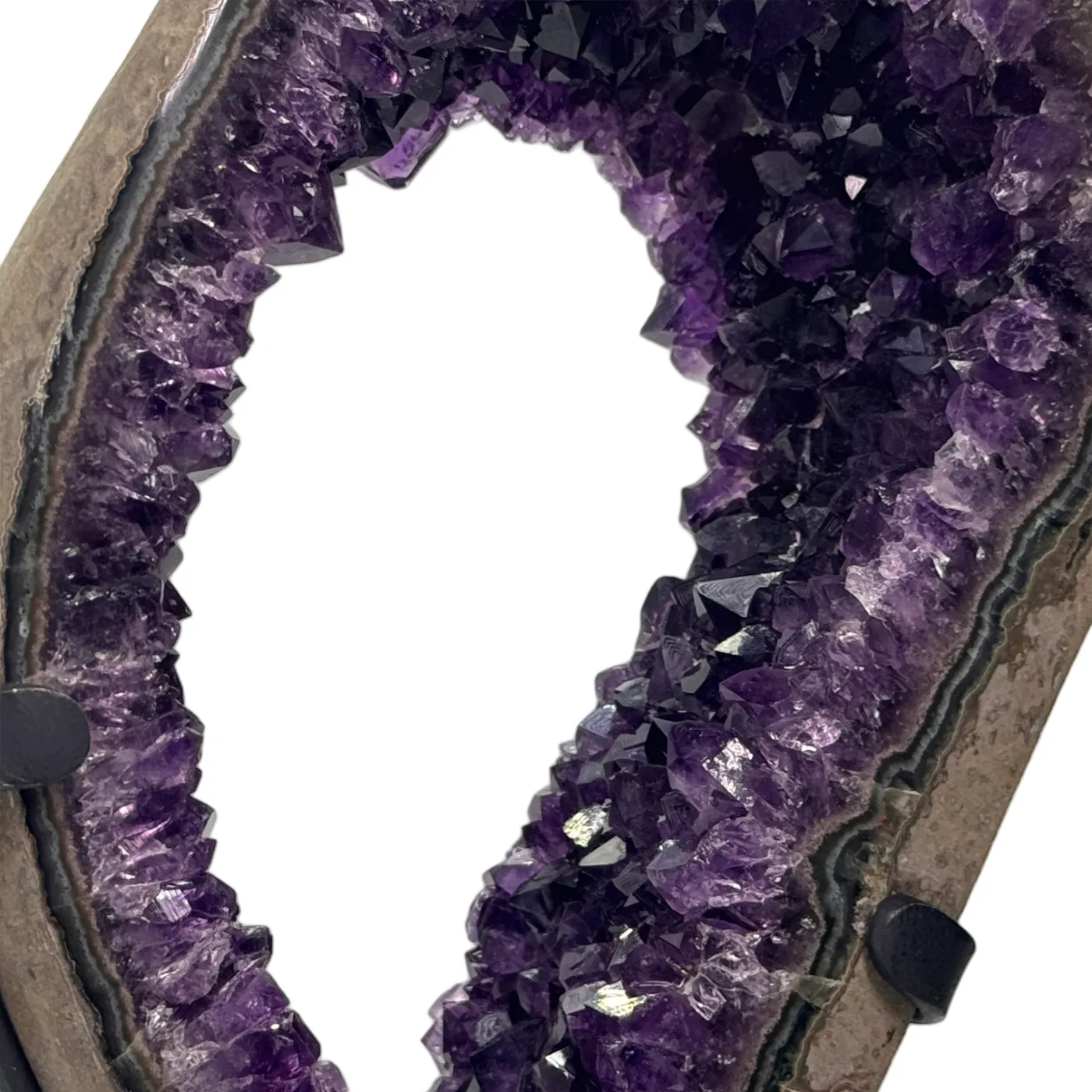 Deze prachtige amethist portaal van hoge kwaliteit komt rechtstreeks uit Uruguay en heeft een diepe, donkerpaarse kleur die meteen opvalt. De amethist is gepolijst in een elegante ovalen vorm, waardoor de kristalstructuren en kleurintensiteit schitterend zichtbaar worden.