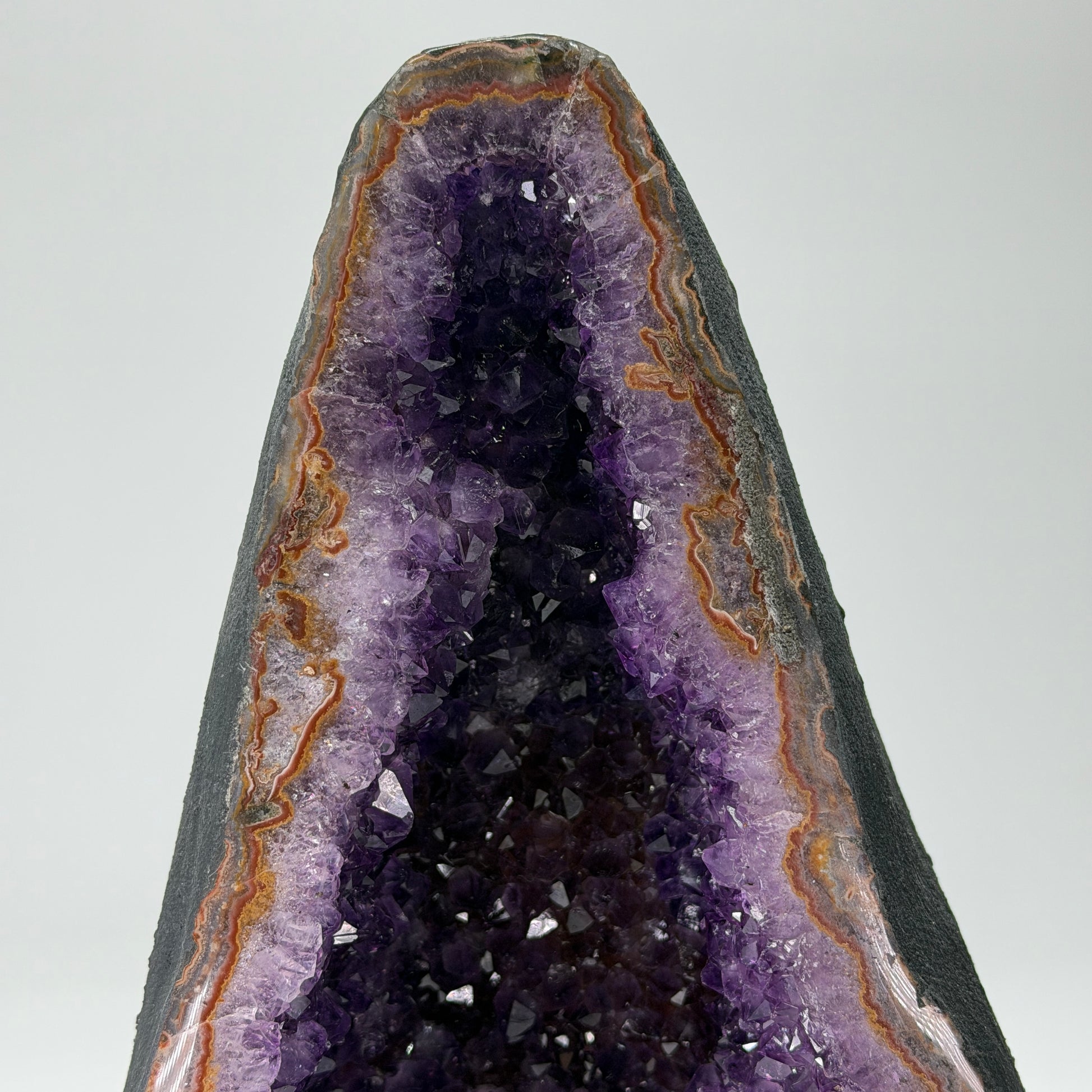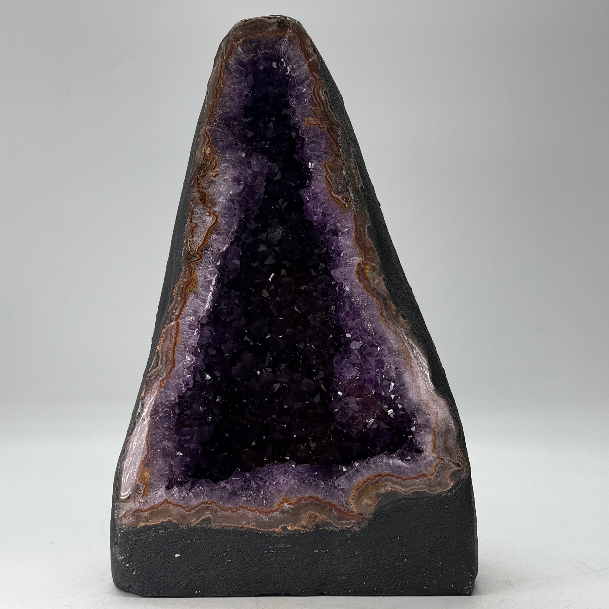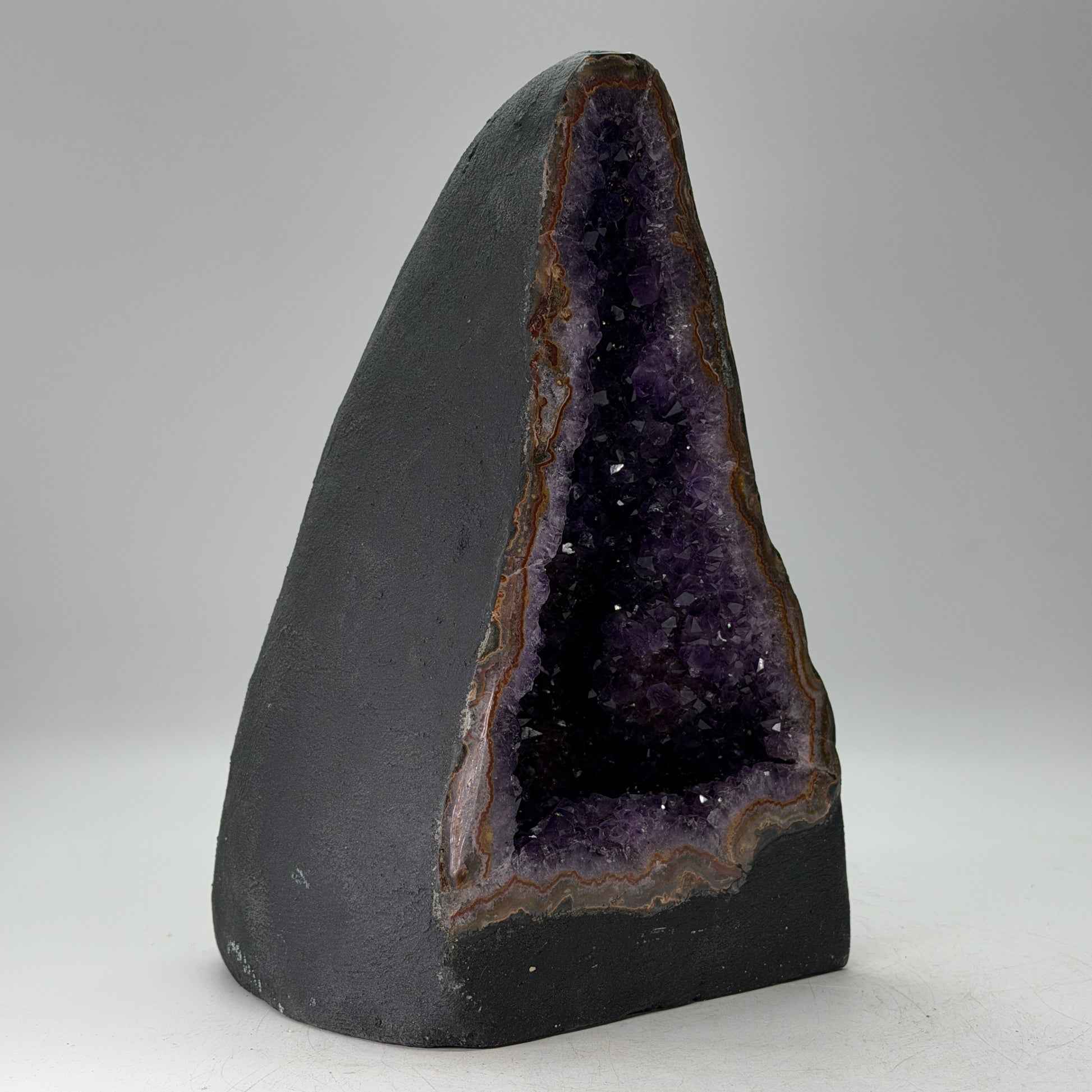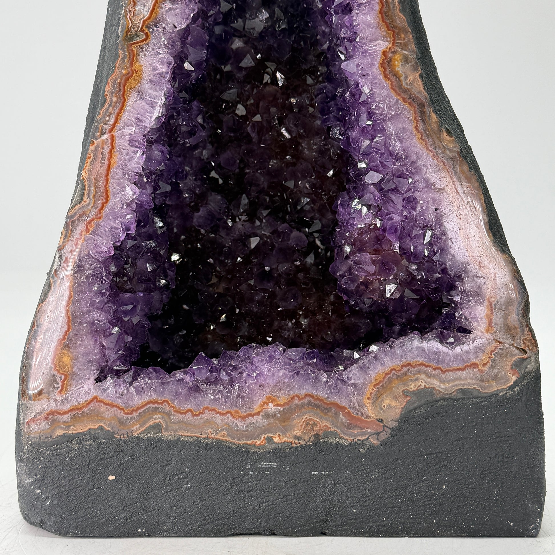 Deze prachtige donkerpaarse amethist kathedraal is van hoge kwaliteit en bestaat uit dicht opeengepakte, kleine amethistkristallen met een diepe paarse kleur. Dankzij deze intense kleur en mooie kristalvorming is dit stuk een echte eyecatcher die direct de aandacht trekt.
