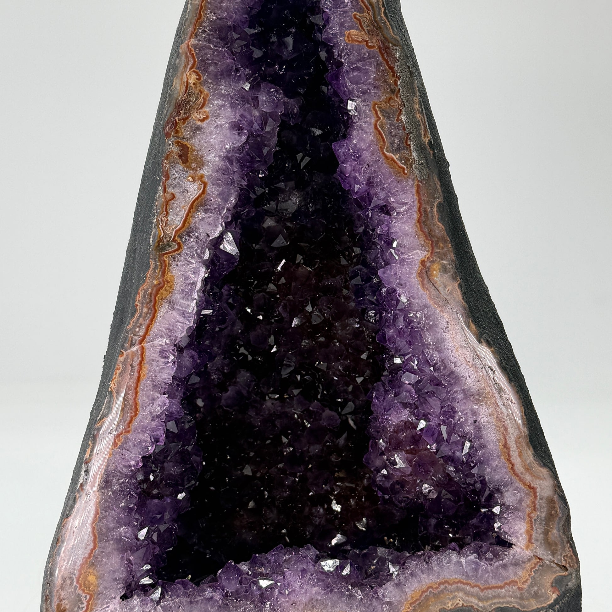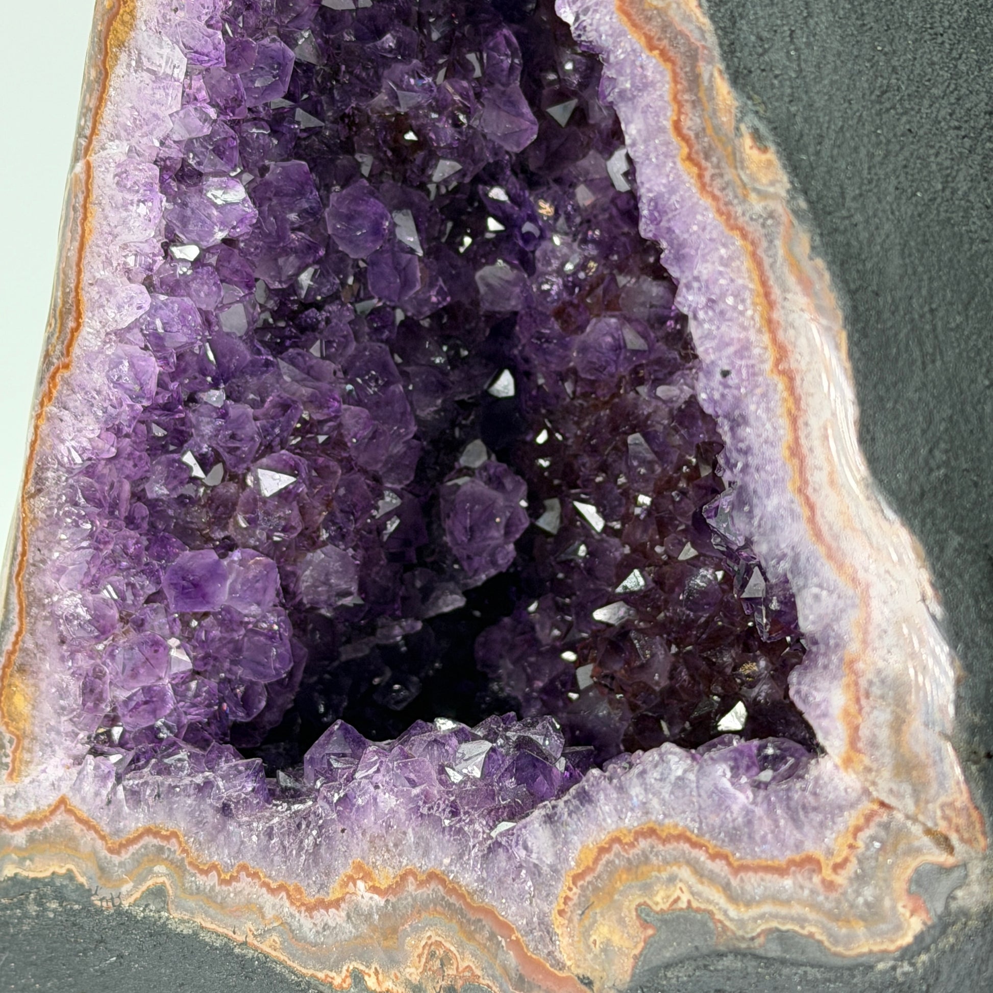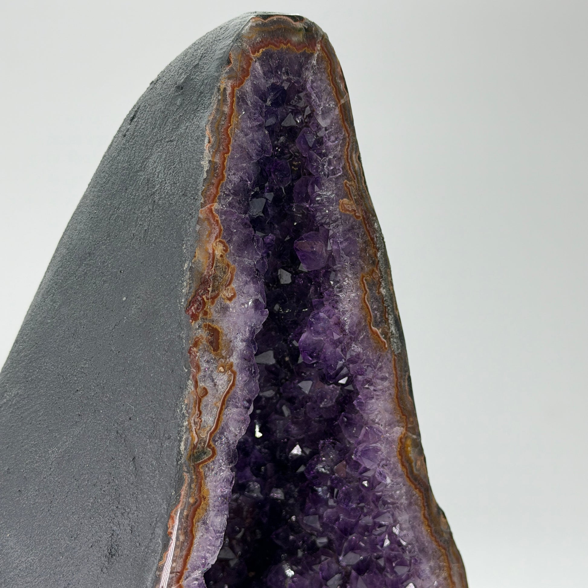 Deze prachtige donkerpaarse amethist kathedraal is van hoge kwaliteit en bestaat uit dicht opeengepakte, kleine amethistkristallen met een diepe paarse kleur. Dankzij deze intense kleur en mooie kristalvorming is dit stuk een echte eyecatcher die direct de aandacht trekt.