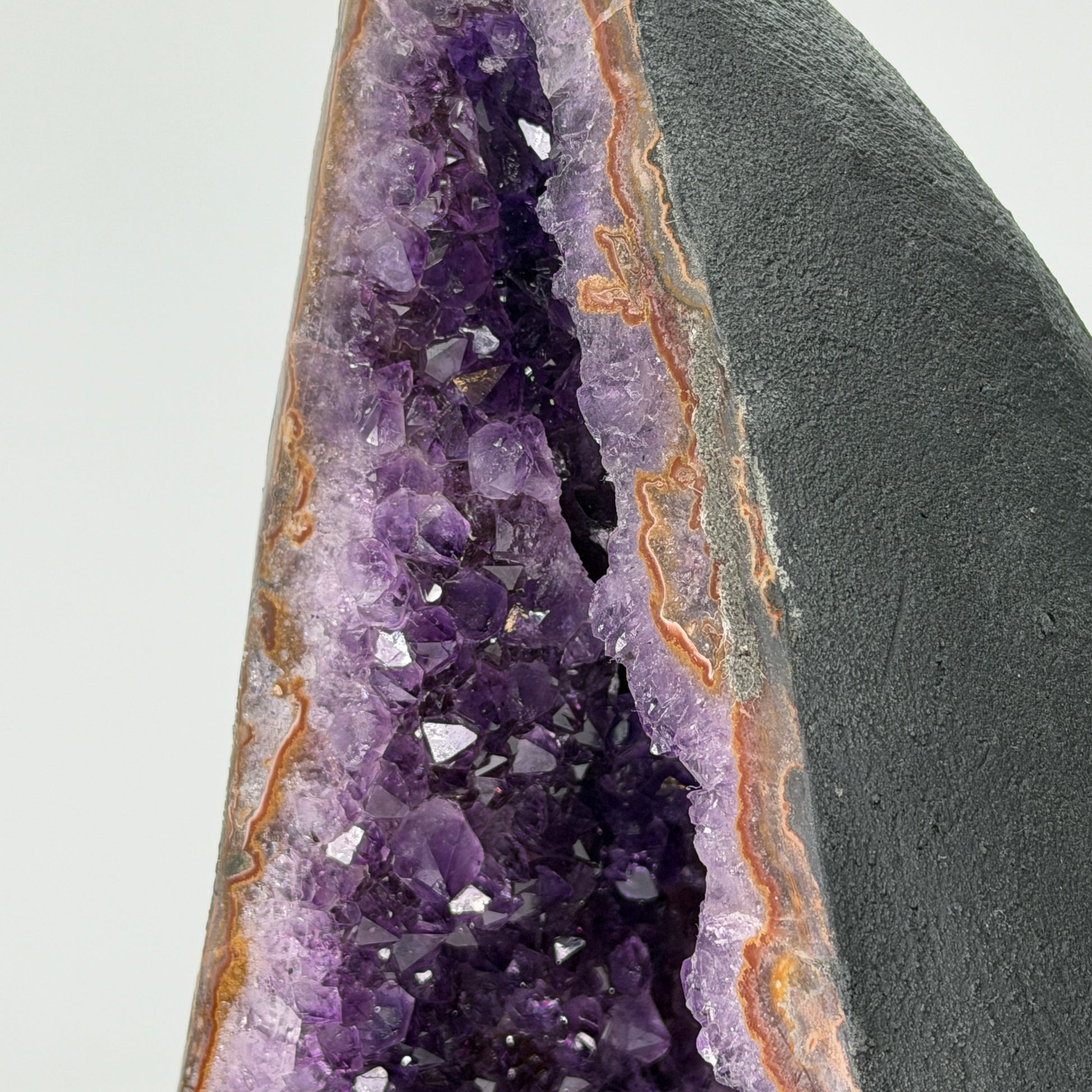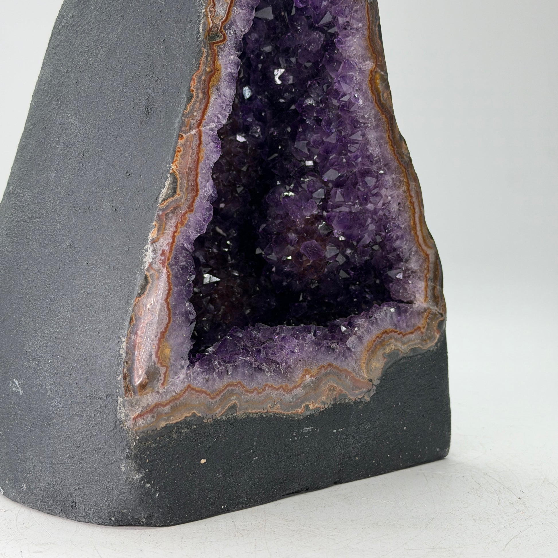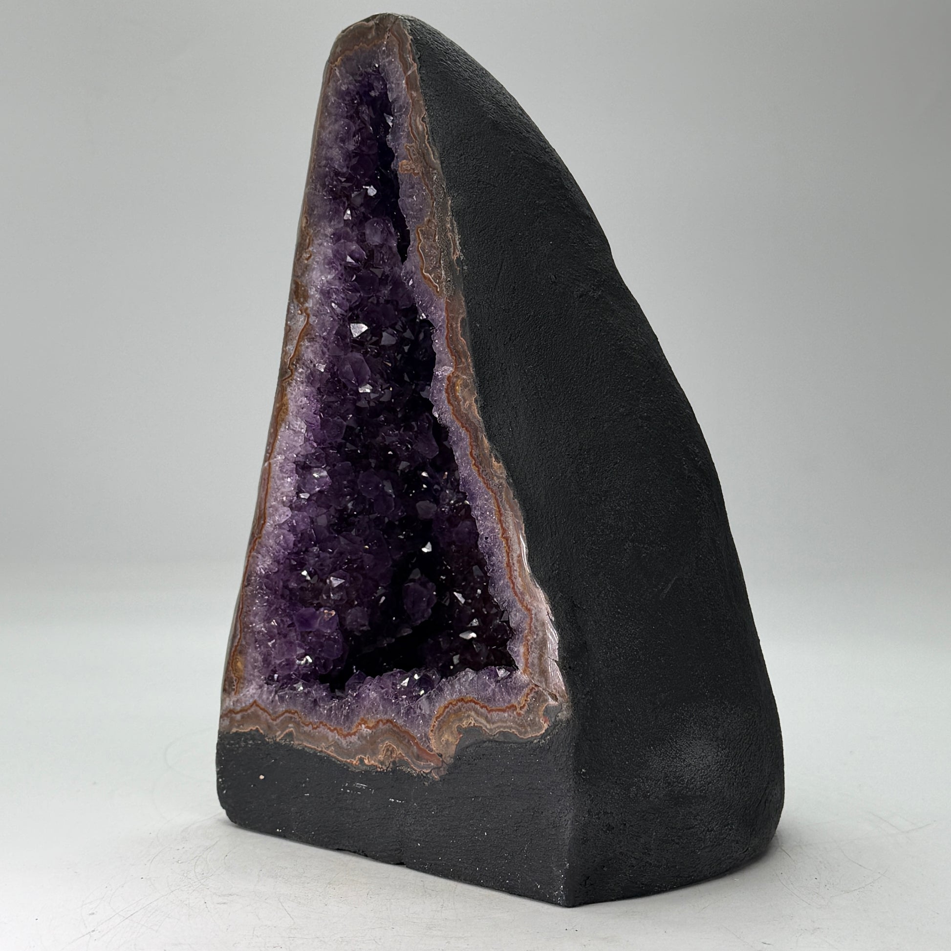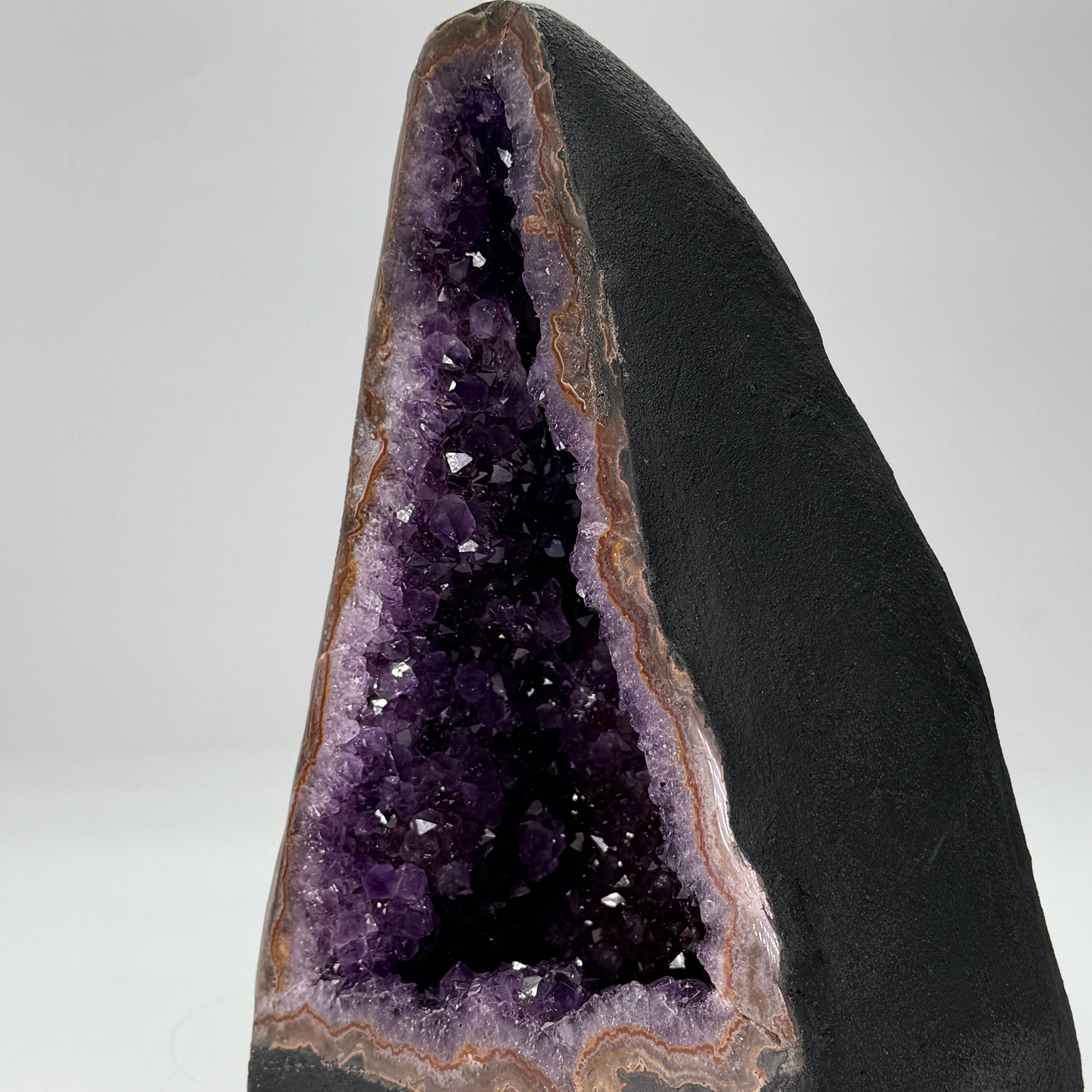Deze prachtige donkerpaarse amethist kathedraal is van hoge kwaliteit en bestaat uit dicht opeengepakte, kleine amethistkristallen met een diepe paarse kleur. Dankzij deze intense kleur en mooie kristalvorming is dit stuk een echte eyecatcher die direct de aandacht trekt.