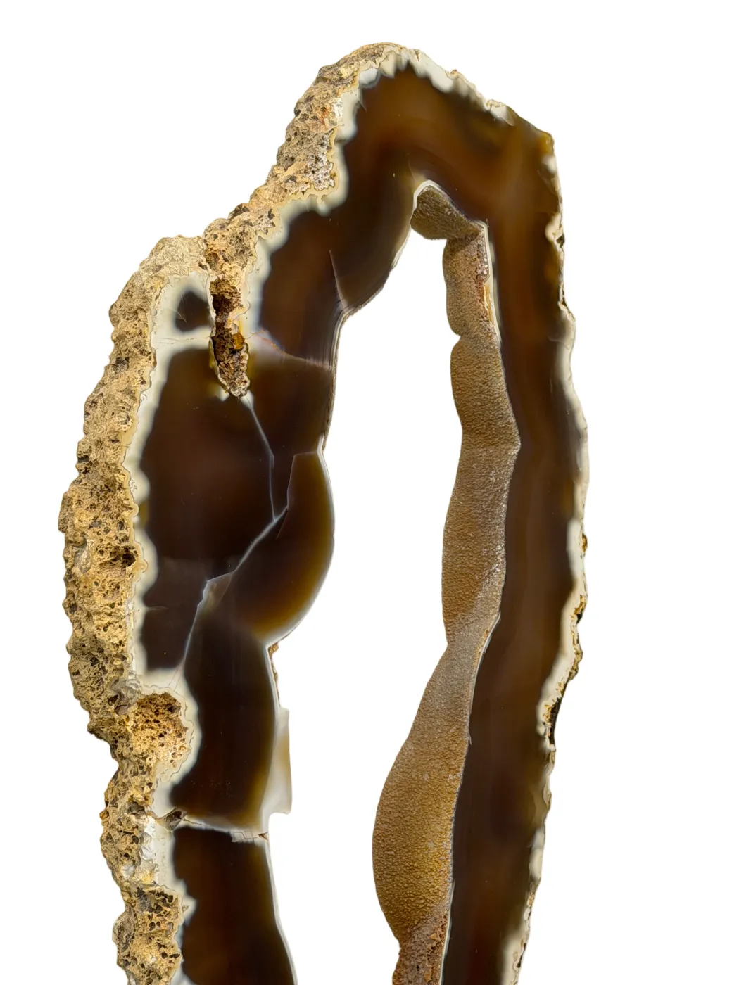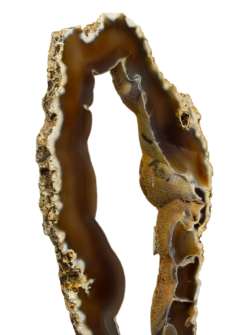 Deze prachtige en unieke agaat portaal is afkomstig uit Brazilië en vormt een indrukwekkend decoratief object. De voor- en achterzijde zijn gepolijst, waardoor de natuurlijke structuren en kleuren van de agaat prachtig tot hun recht komen. De ruwe randen zorgen voor een mooi contrast en benadrukken de natuurlijke oorsprong van de steen.
