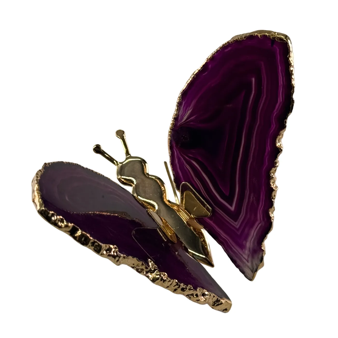 Papillons décoratifs uniques aux ailes en agate naturelle, au corps doré et aux élégantes finitions dorées sur les bords. Chaque papillon est soigneusement sélectionné et présente une couleur, un motif et un aspect uniques.