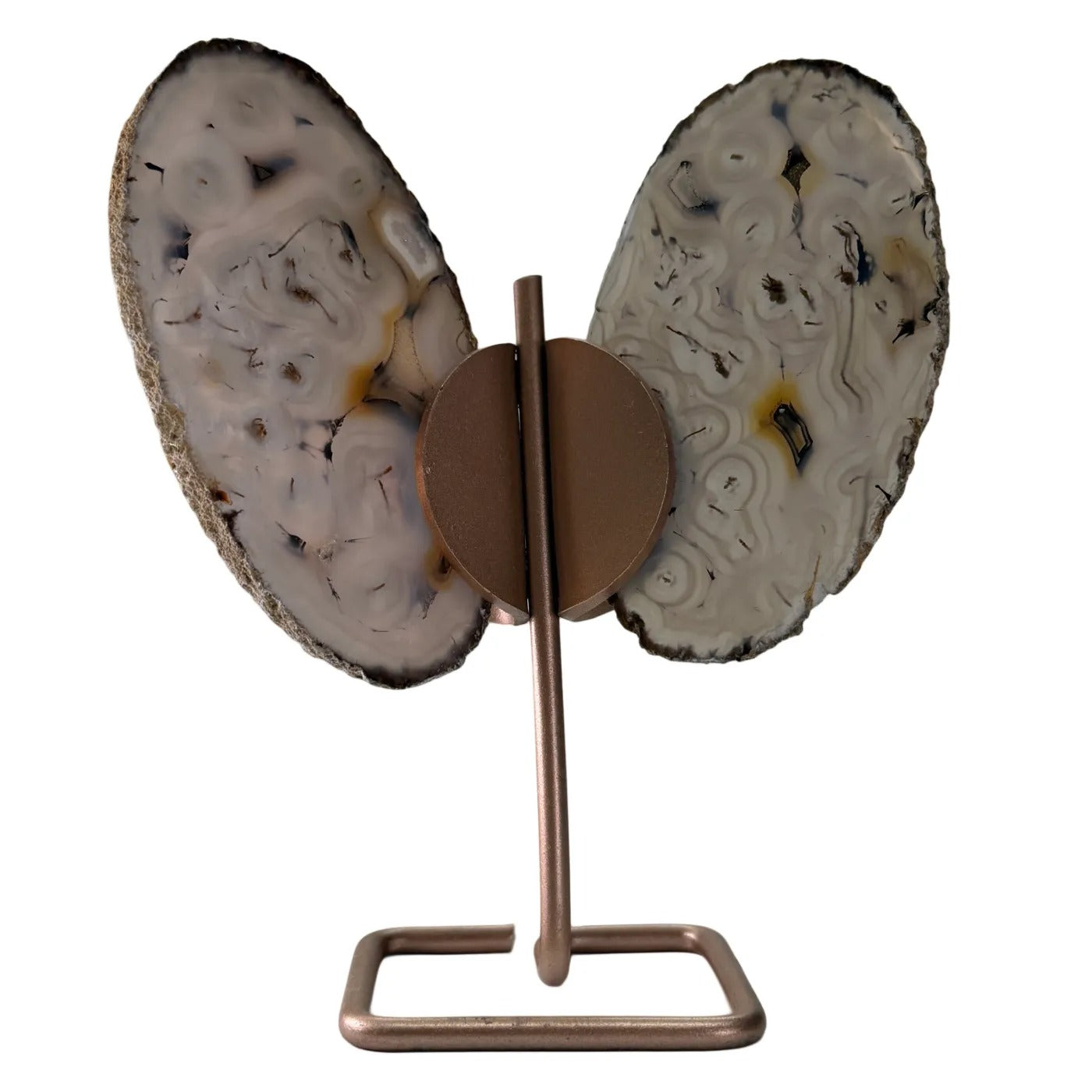Elke vlinder is volledig met de hand vervaardigd. Omdat agaat een puur natuurproduct is, is elk exemplaar uniek en werkelijk één van een soort. De agaatschijven zijn afkomstig uit Brazilië en stevig bevestigd op een elegante gouden metalen standaard, wat zorgt voor een luxe en stijlvolle uitstraling.