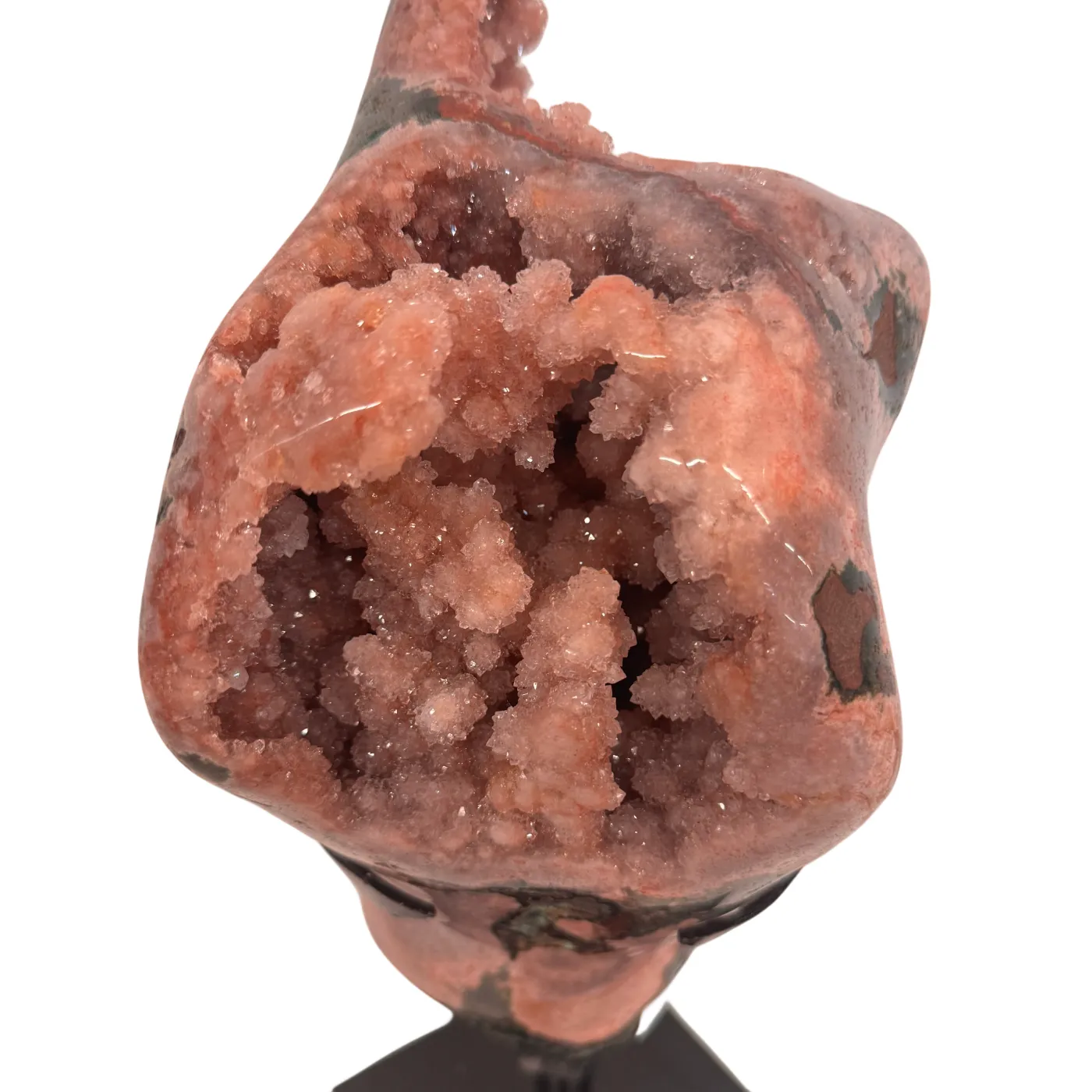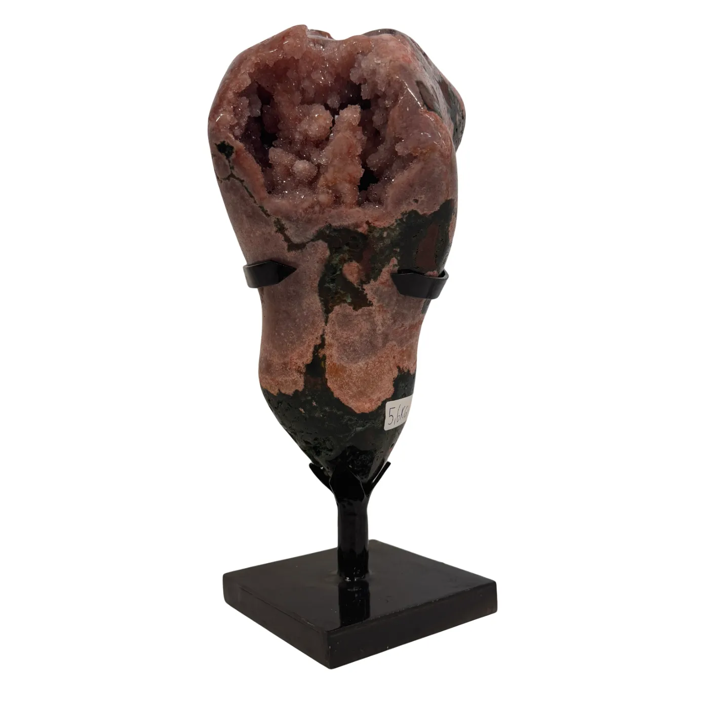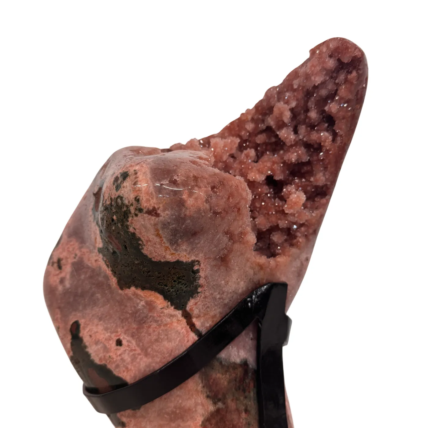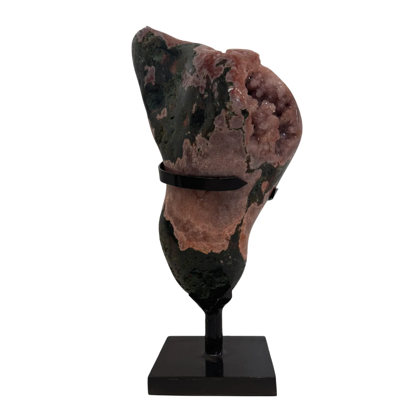 L'améthyste rose repose solidement sur un support métallique robuste, idéale comme pièce décorative luxueuse dans tout intérieur.