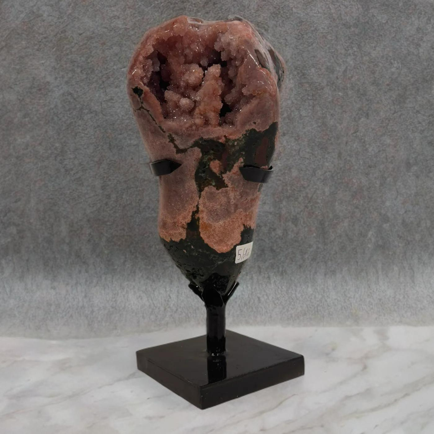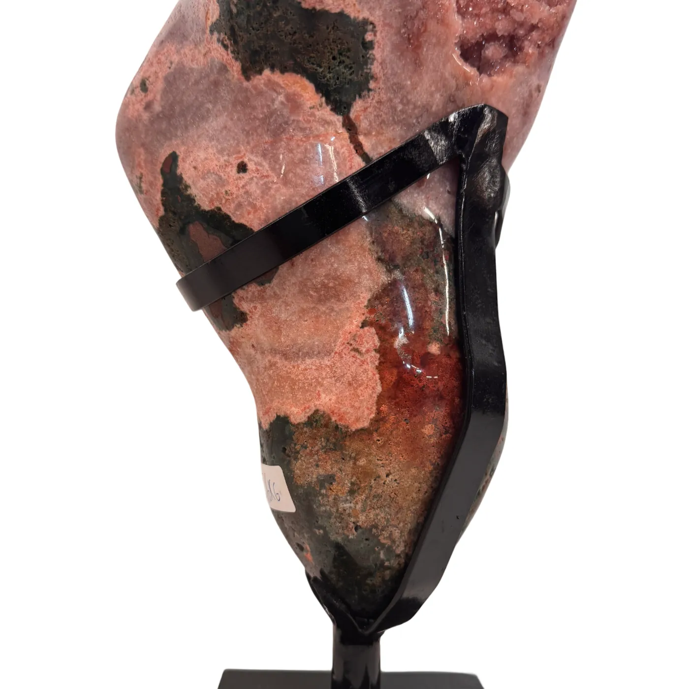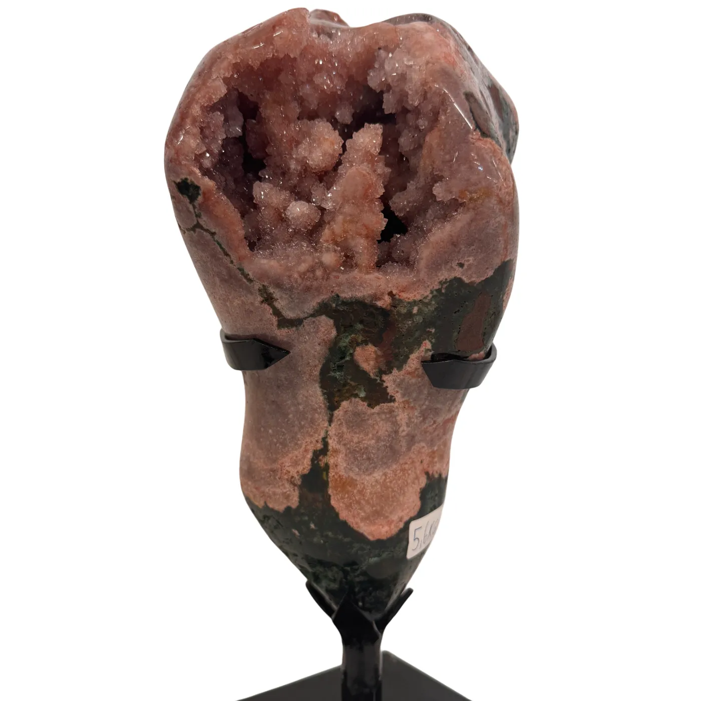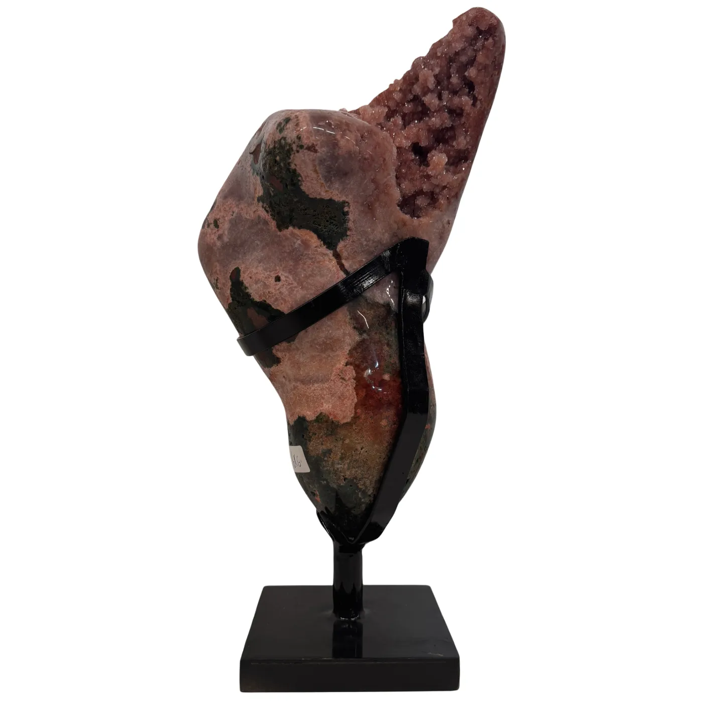 L'améthyste rose repose solidement sur un support métallique robuste, idéale comme pièce décorative luxueuse dans tout intérieur.