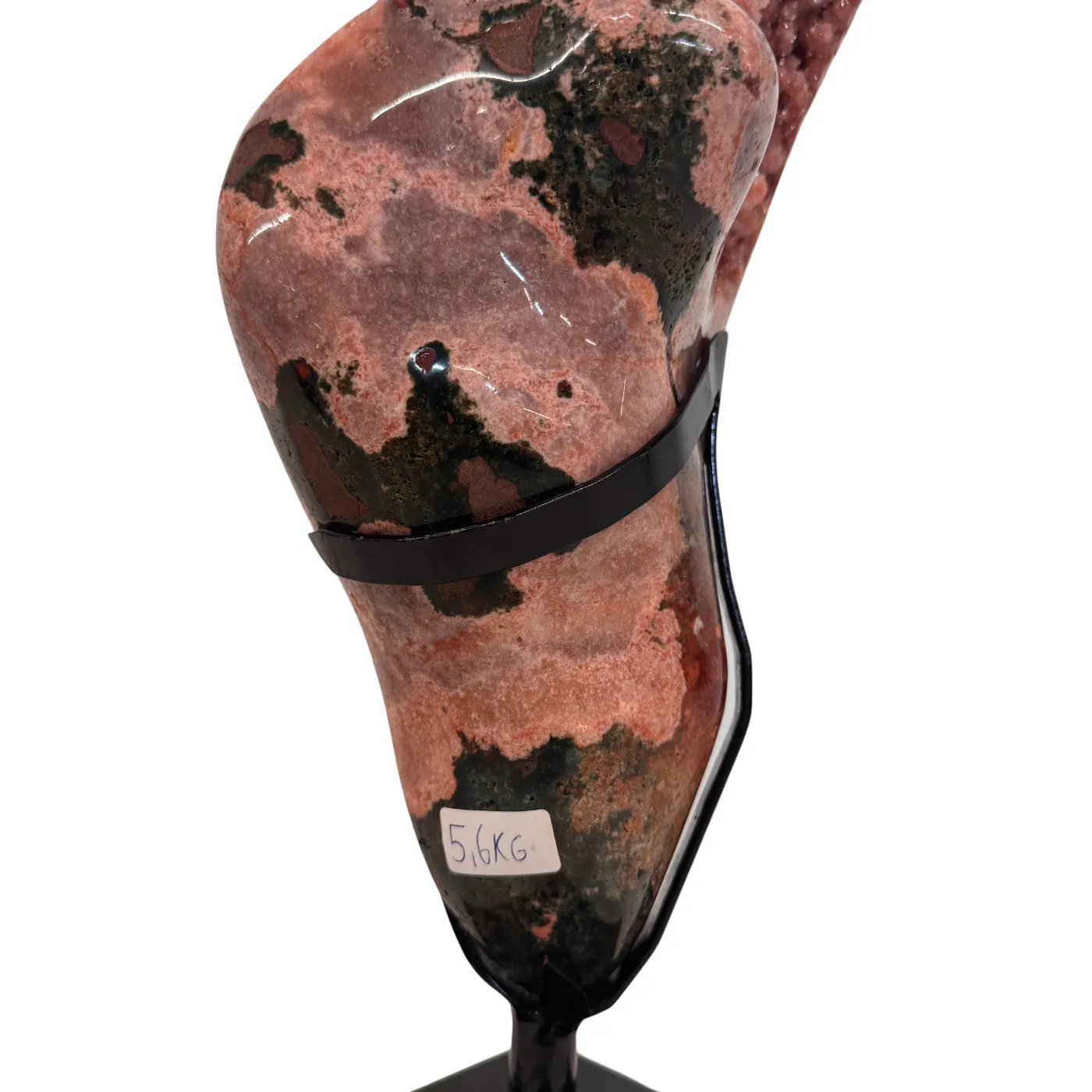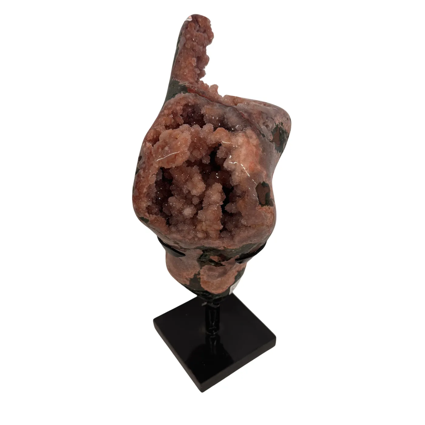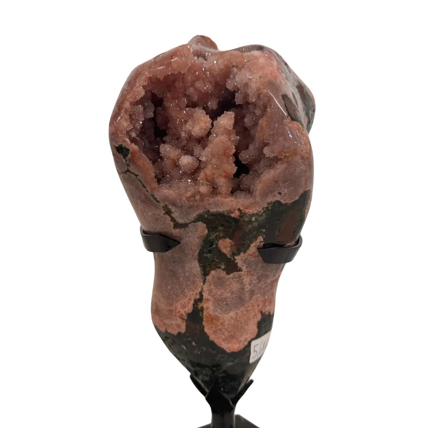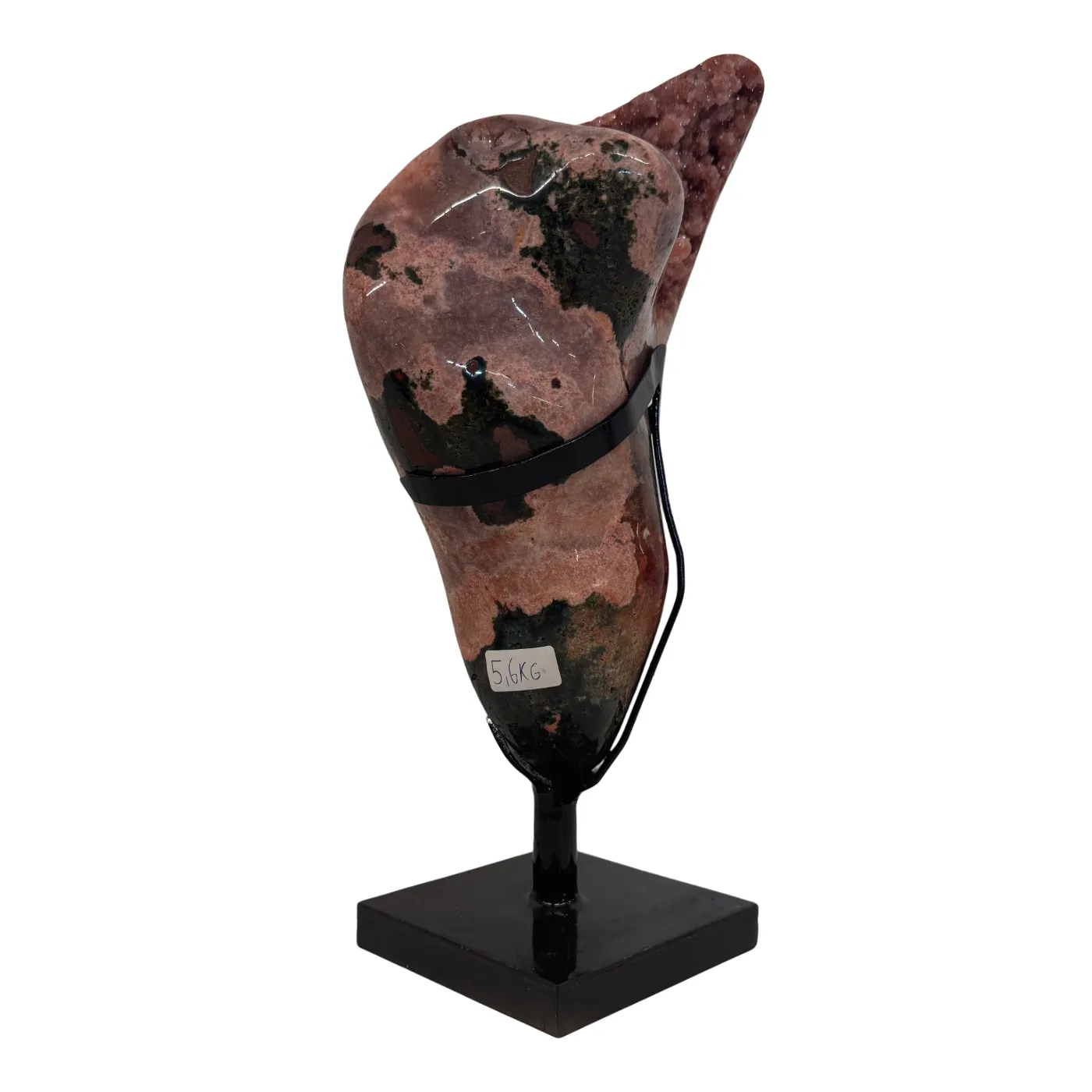 L'améthyste rose repose solidement sur un support métallique robuste, idéale comme pièce décorative luxueuse dans tout intérieur.