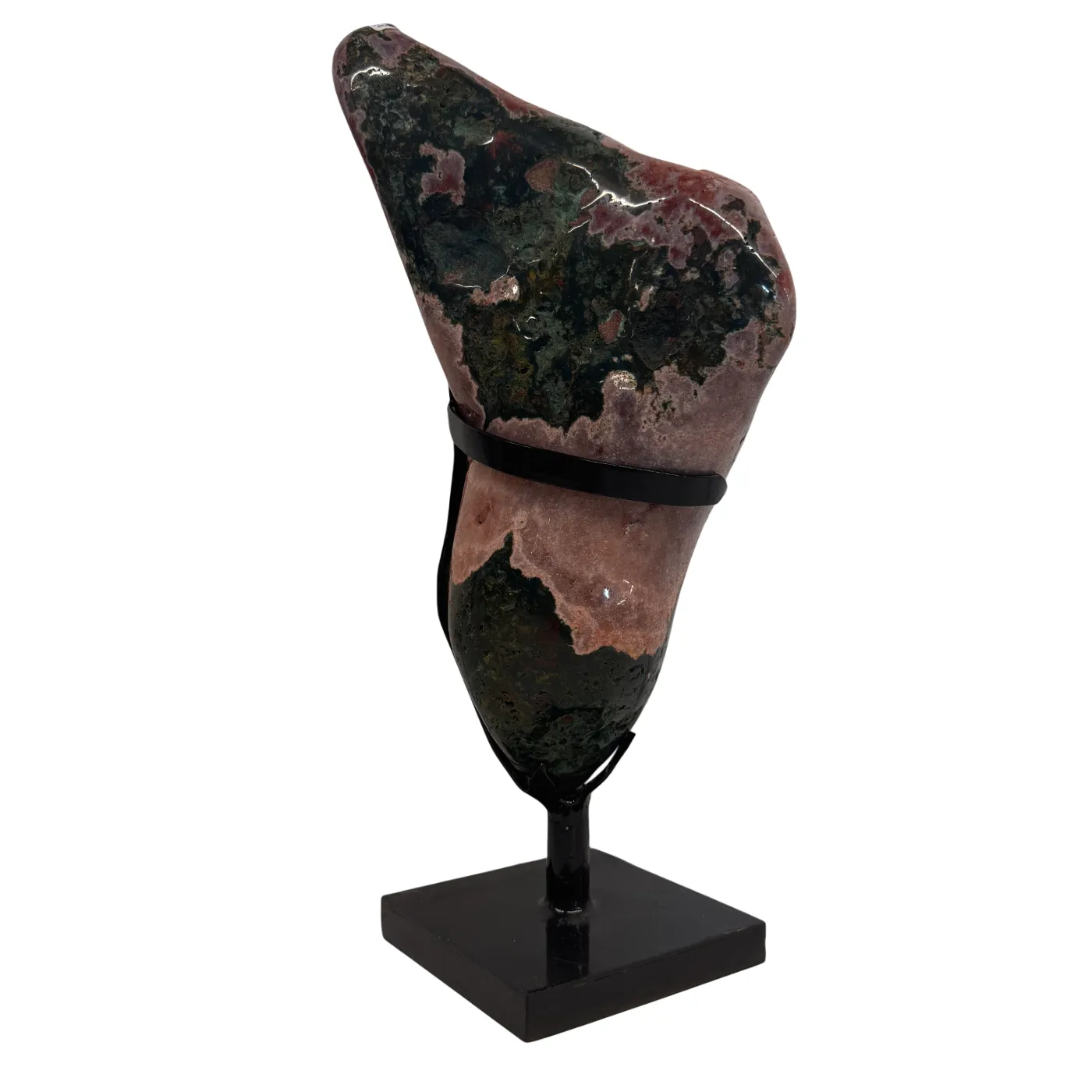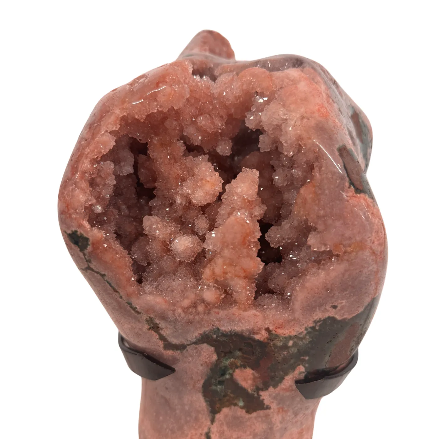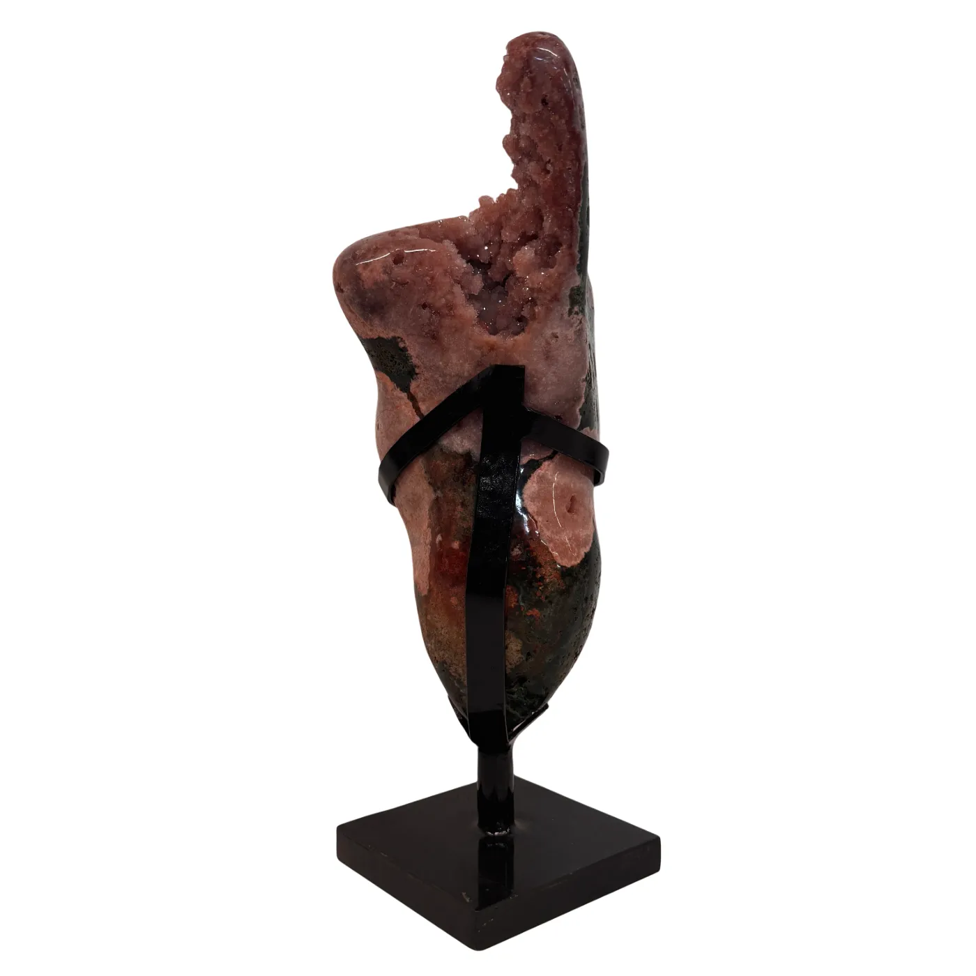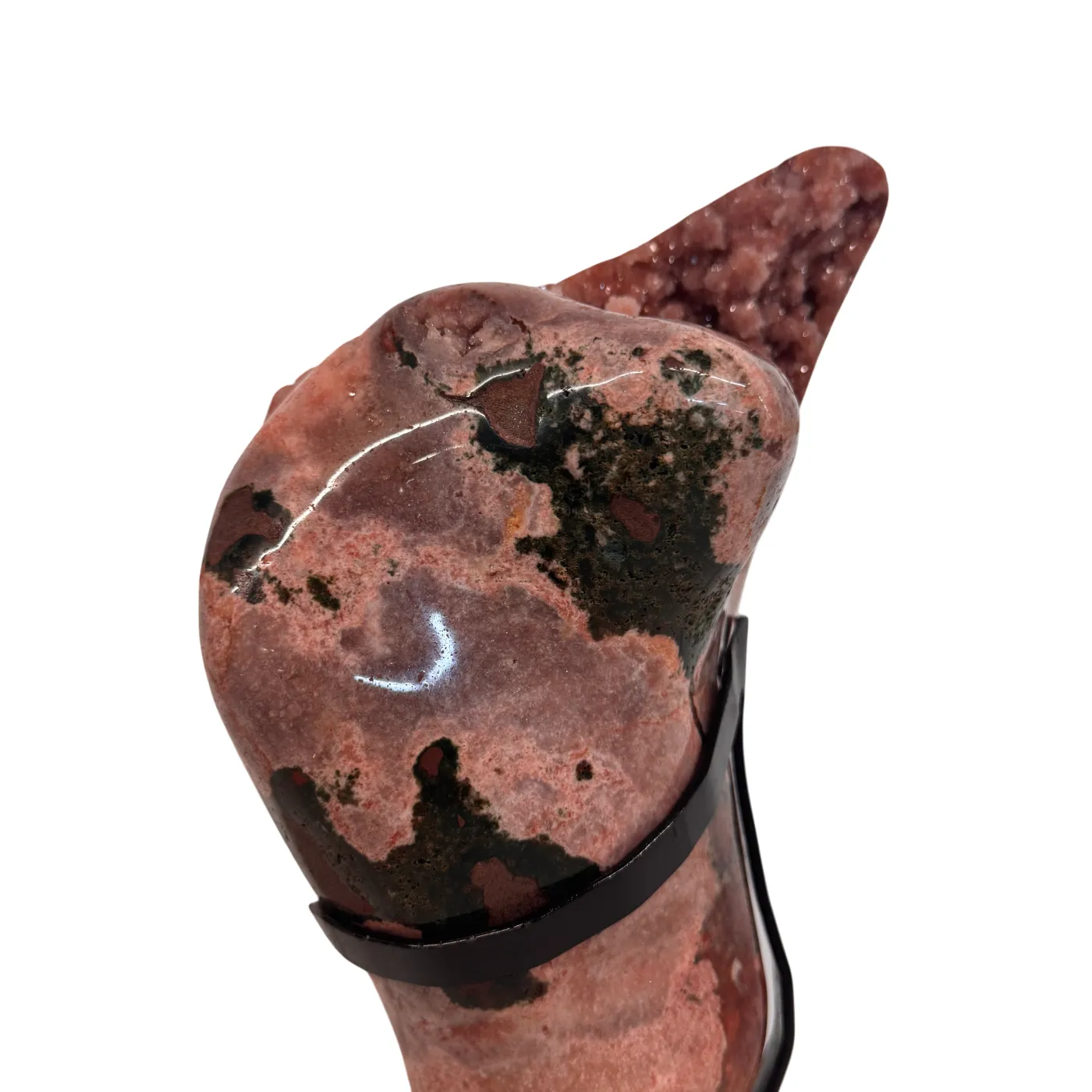 Découvrez cette magnifique améthyste rose, soigneusement sélectionnée pour sa couleur profonde et sa texture unique. Entièrement polie, elle révèle avec élégance ses motifs naturels et ses chaudes nuances roses. À son sommet, un ensemble de cristaux druzy scintillants reflète la lumière avec éclat.