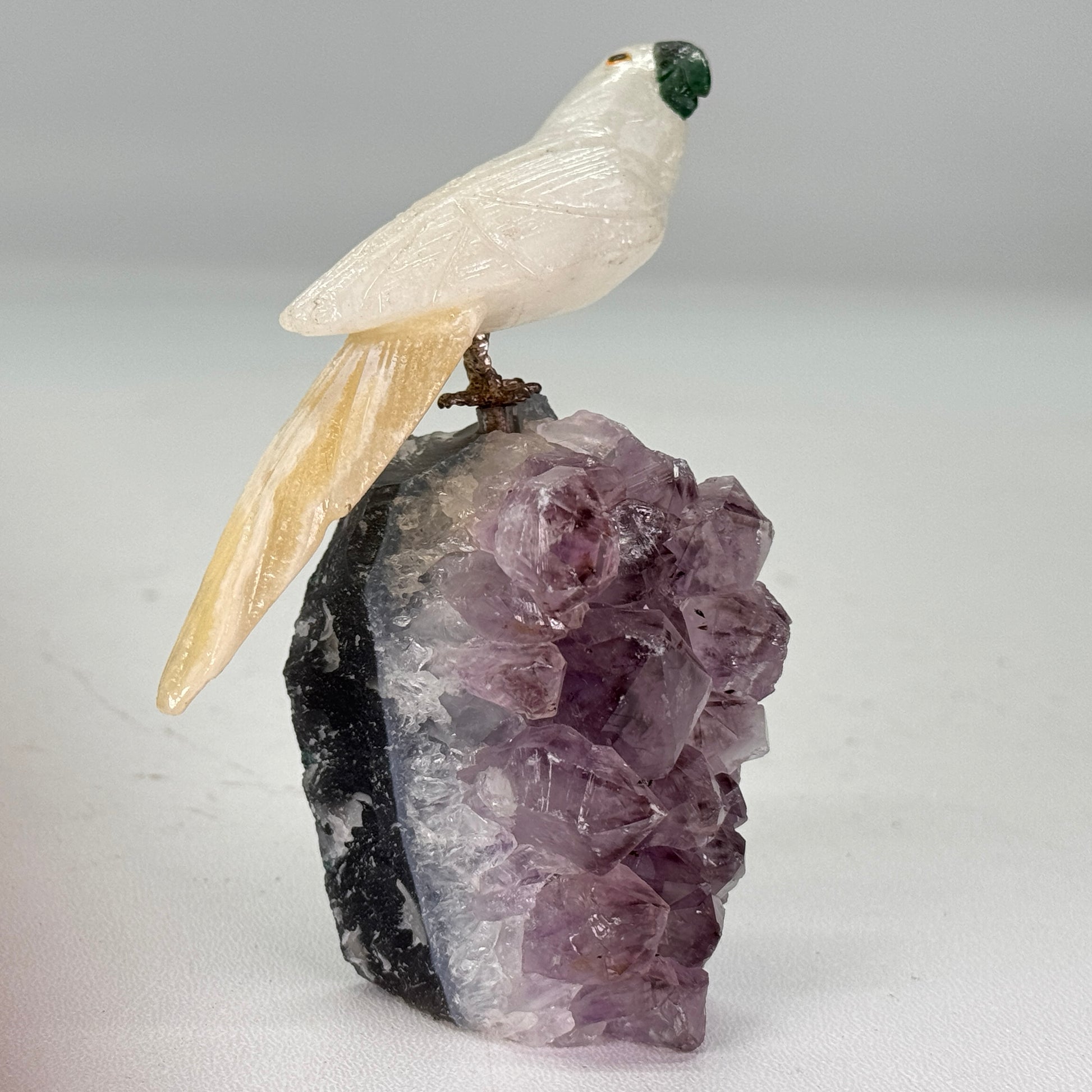 petit perroquet sur un amas d'améthyste