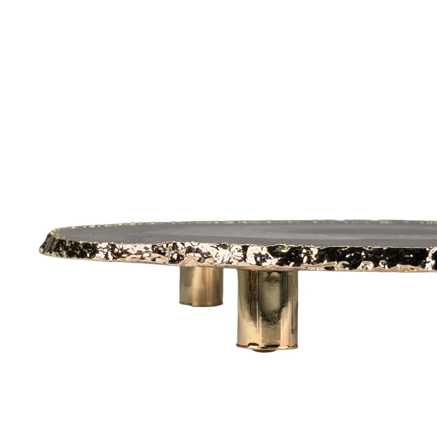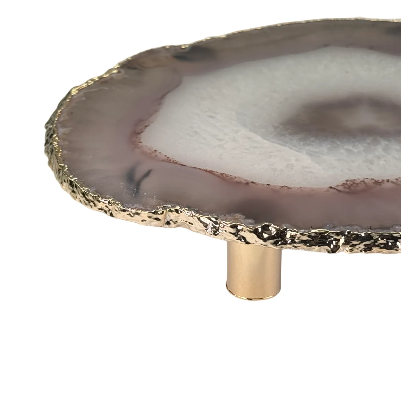 De natuurlijke agaat is zorgvuldig gepolijst, waardoor de unieke patronen en kleuren prachtig tot hun recht komen. De gouden rand en metalen pootjes geven het geheel een chique en stijlvolle uitstraling, perfect voor elk interieur of als luxe cadeau.