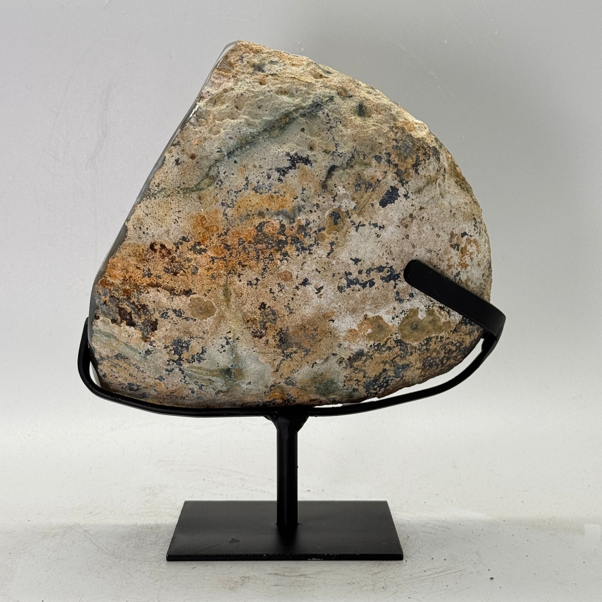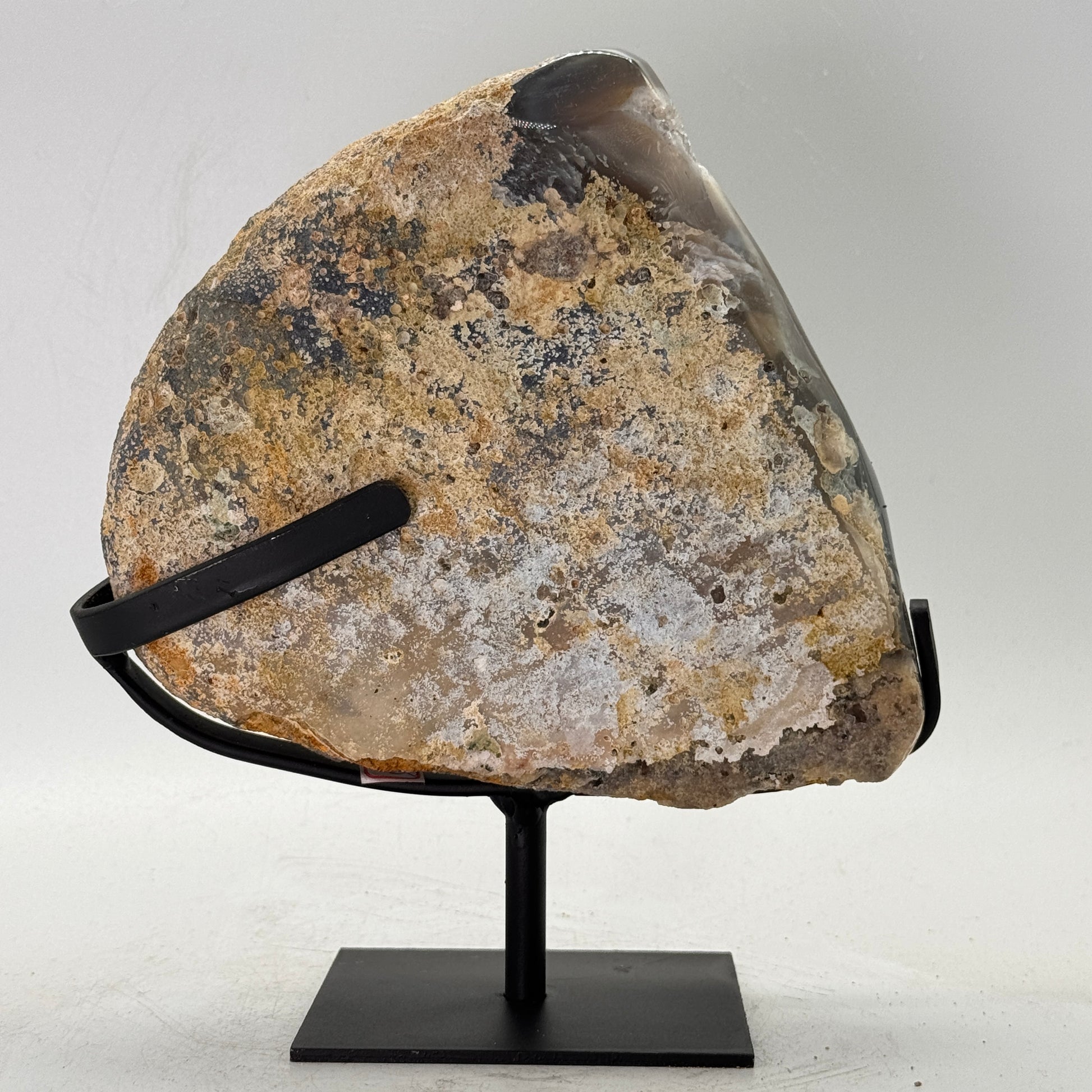 Agate naturelle unique du Brésil, présentée avec élégance sur un élégant support en métal noir. Les côtés de la pierre sont soigneusement polis, mettant en valeur les couleurs profondes et les textures uniques de l'agate.