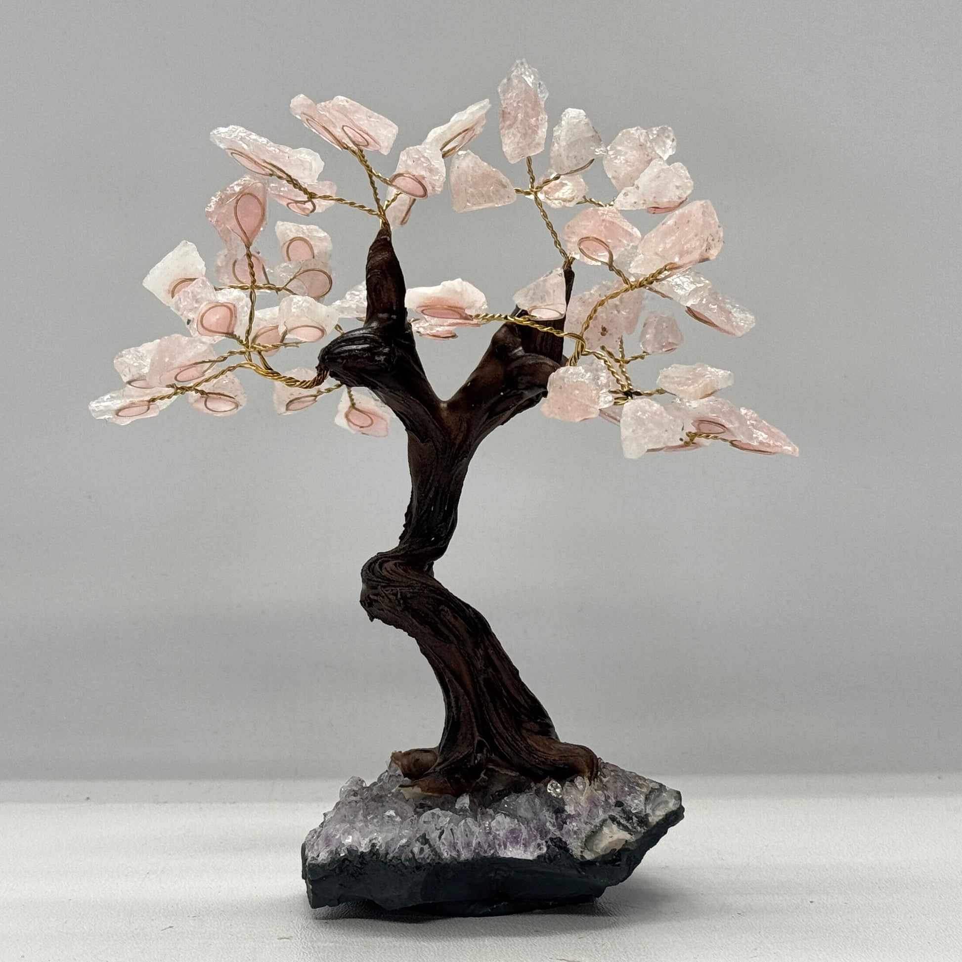 Un arbre à pierres précieuses charmant et unique, dont les feuilles sont faites de fragments de quartz rose brut. L'arbre repose sur un magnifique socle en améthyste, mettant en valeur les chaudes teintes roses du quartz rose.