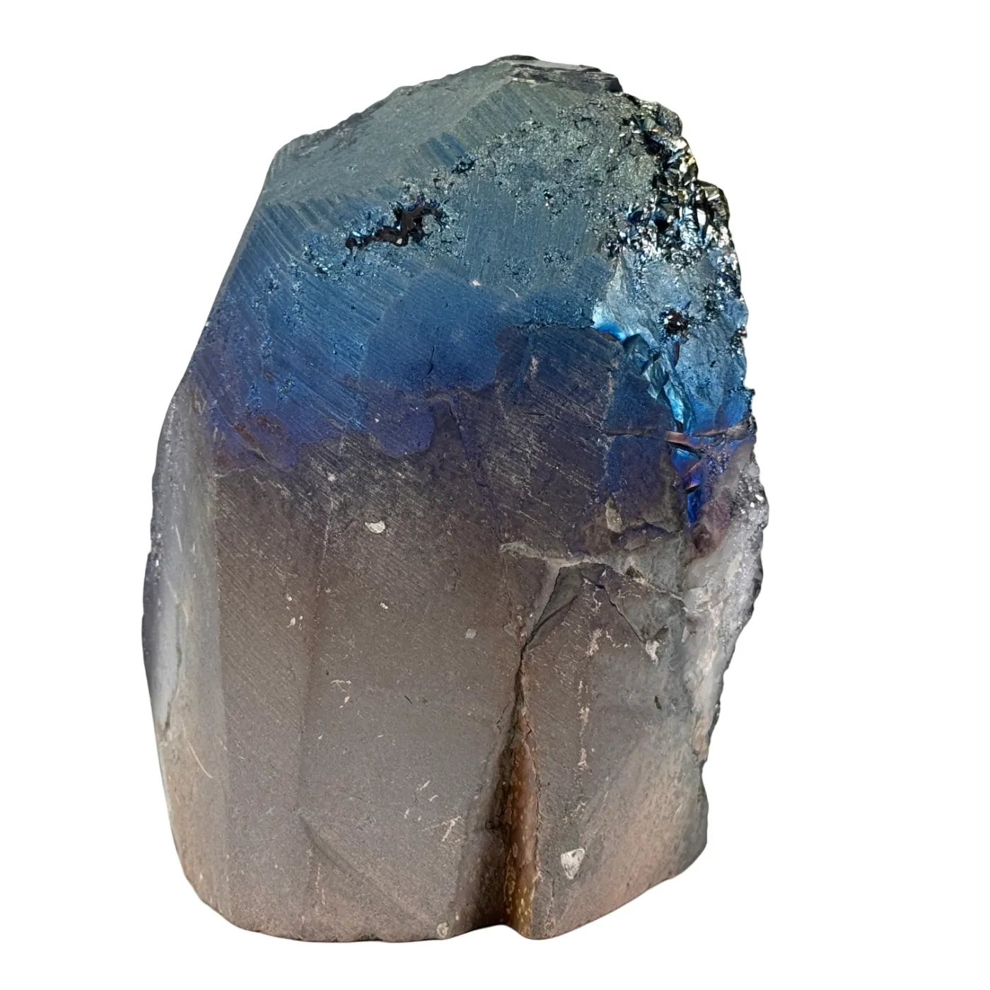 Ontdek deze prachtige kwarts cluster met cut base, afkomstig uit Brazilië. De steen is daar behandeld door de kwarts te verhitten met titanium en platina, wat zorgt voor de schitterende glinsterende regenboogkleuren.