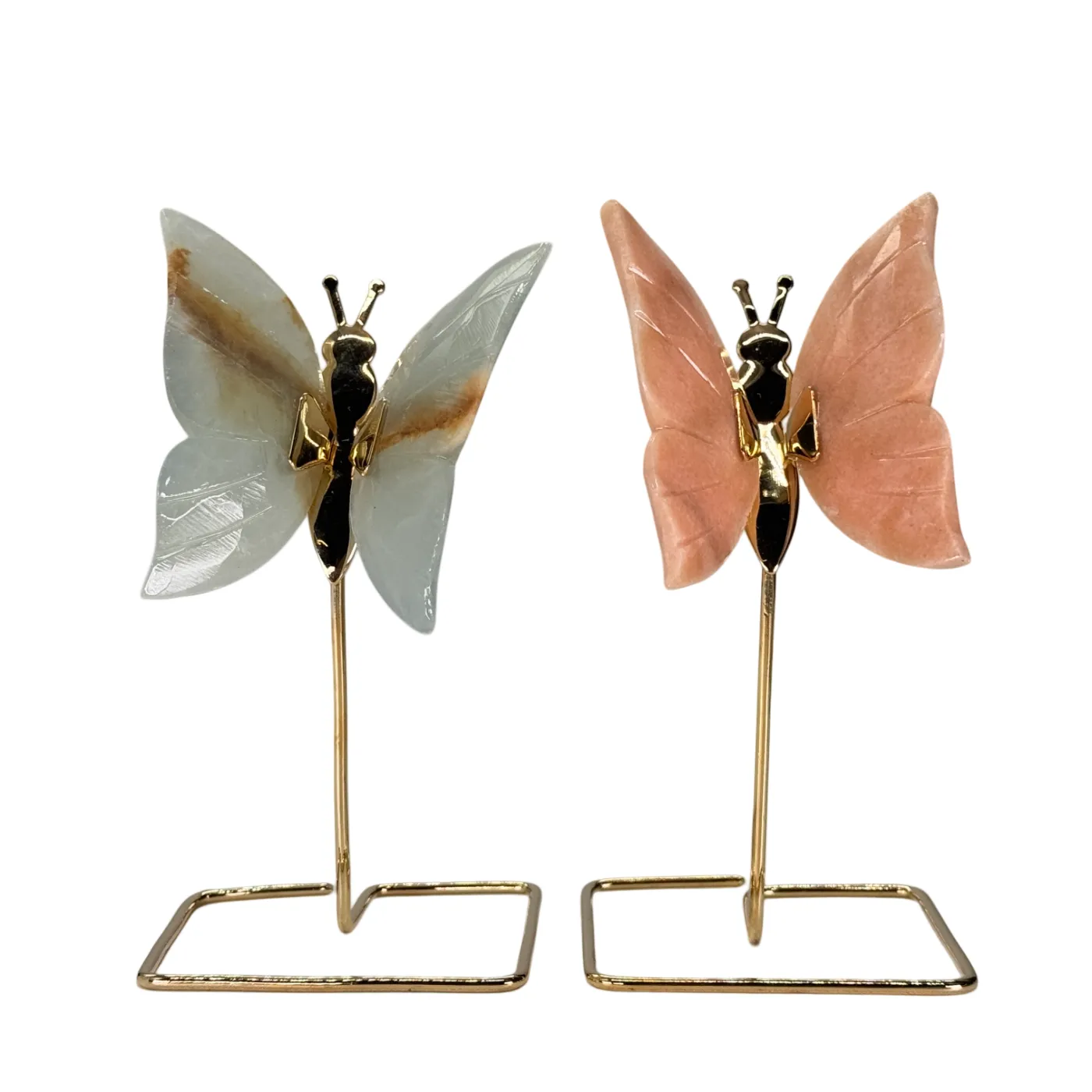 Prachtige handgemaakte vlinder met een elegant gouden borststuk op een gouden standaard. De vleugels zijn vervaardigd uit Blauwe Onyx en Dolomiet, twee natuurlijke edelstenen die zorgvuldig zijn geslepen en gepolijst voor een luxueuze uitstraling uit Brazilië.