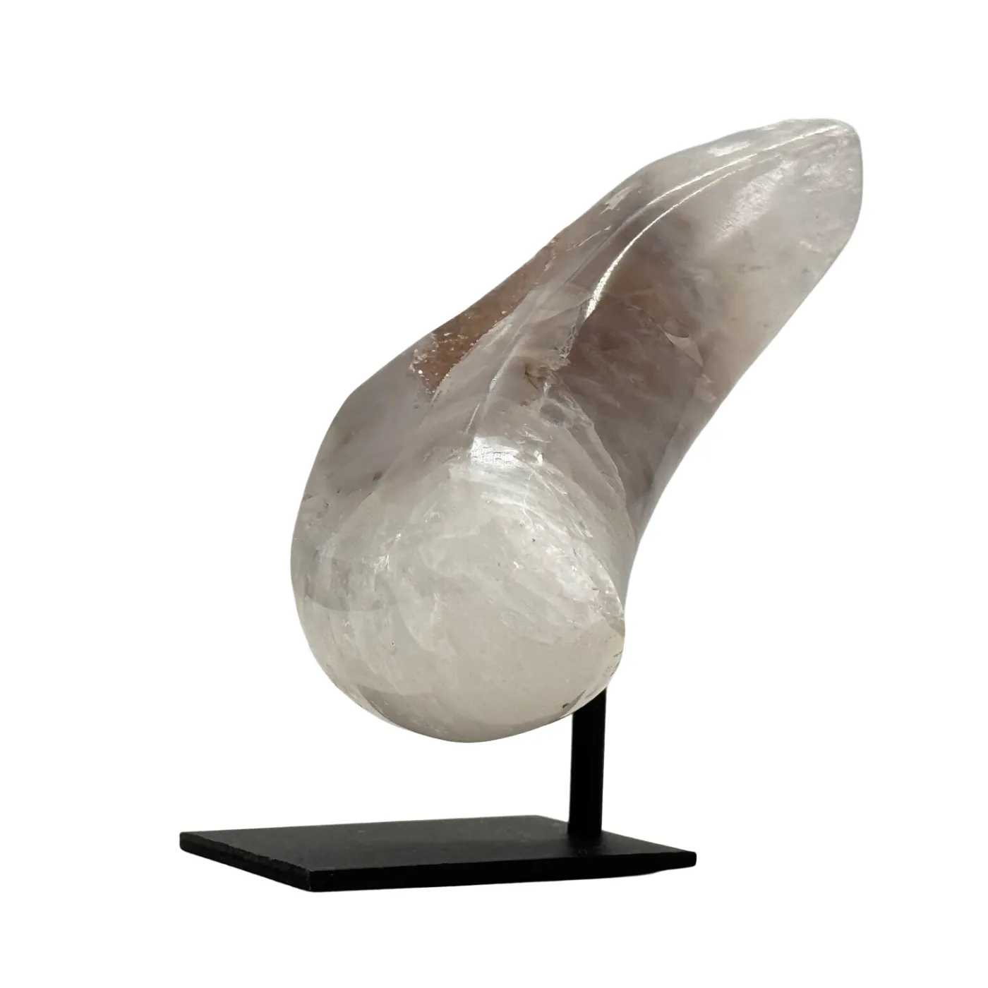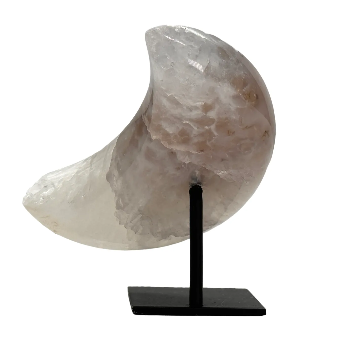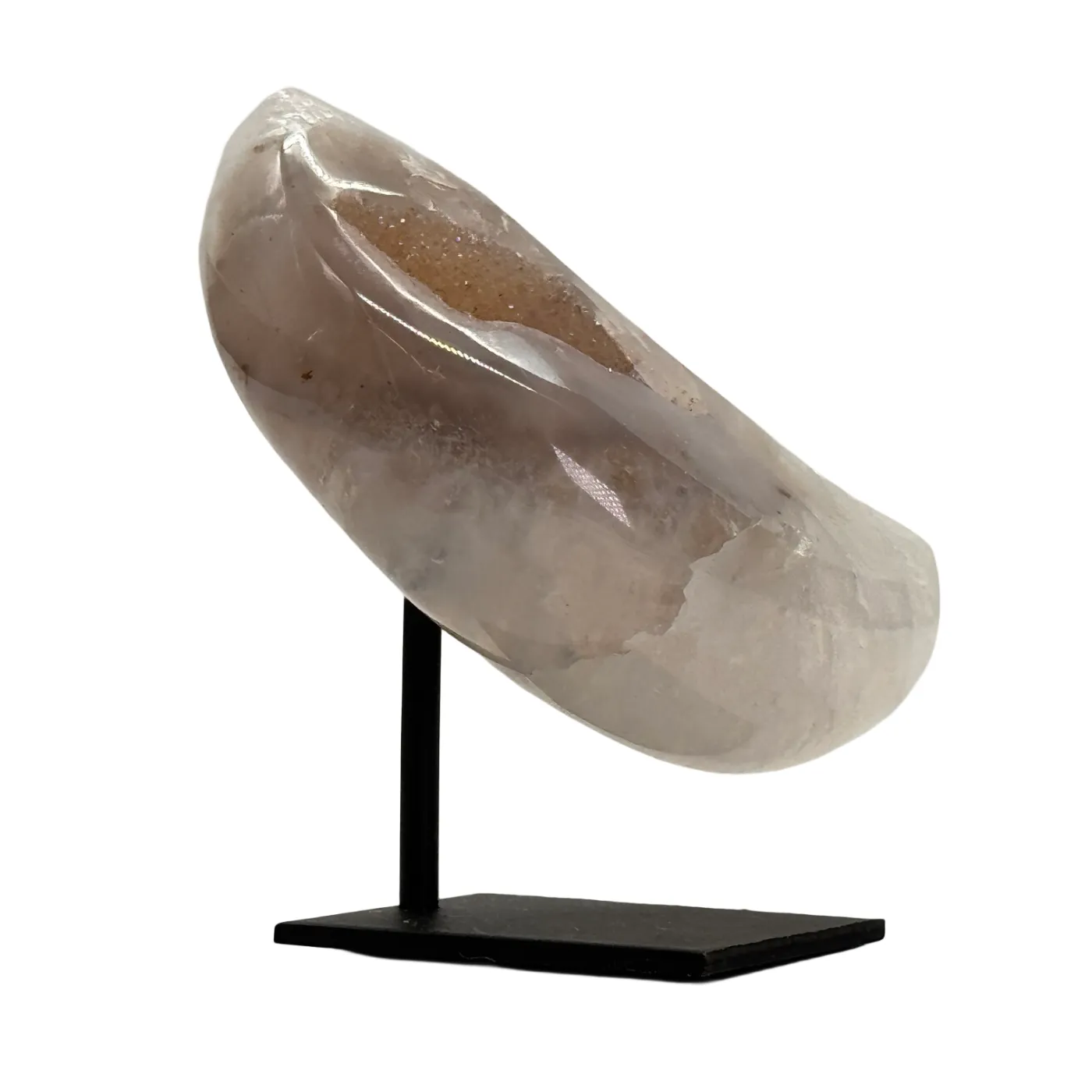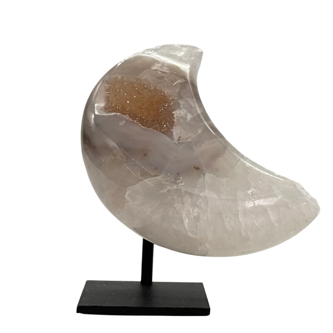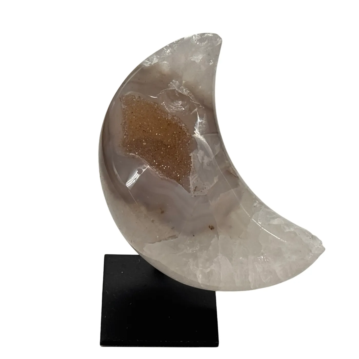 Kleine agaat in de vorm van een maan, zorgvuldig gepolijst en geslepen. De maan staat schuin op een elegante zwarte metalen standaard, waardoor de steen ook van bovenaf goed te bewonderen is. De agaat toont zijn natuurlijke kleuren en bevat een prachtige druzy die extra glinstering geeft.