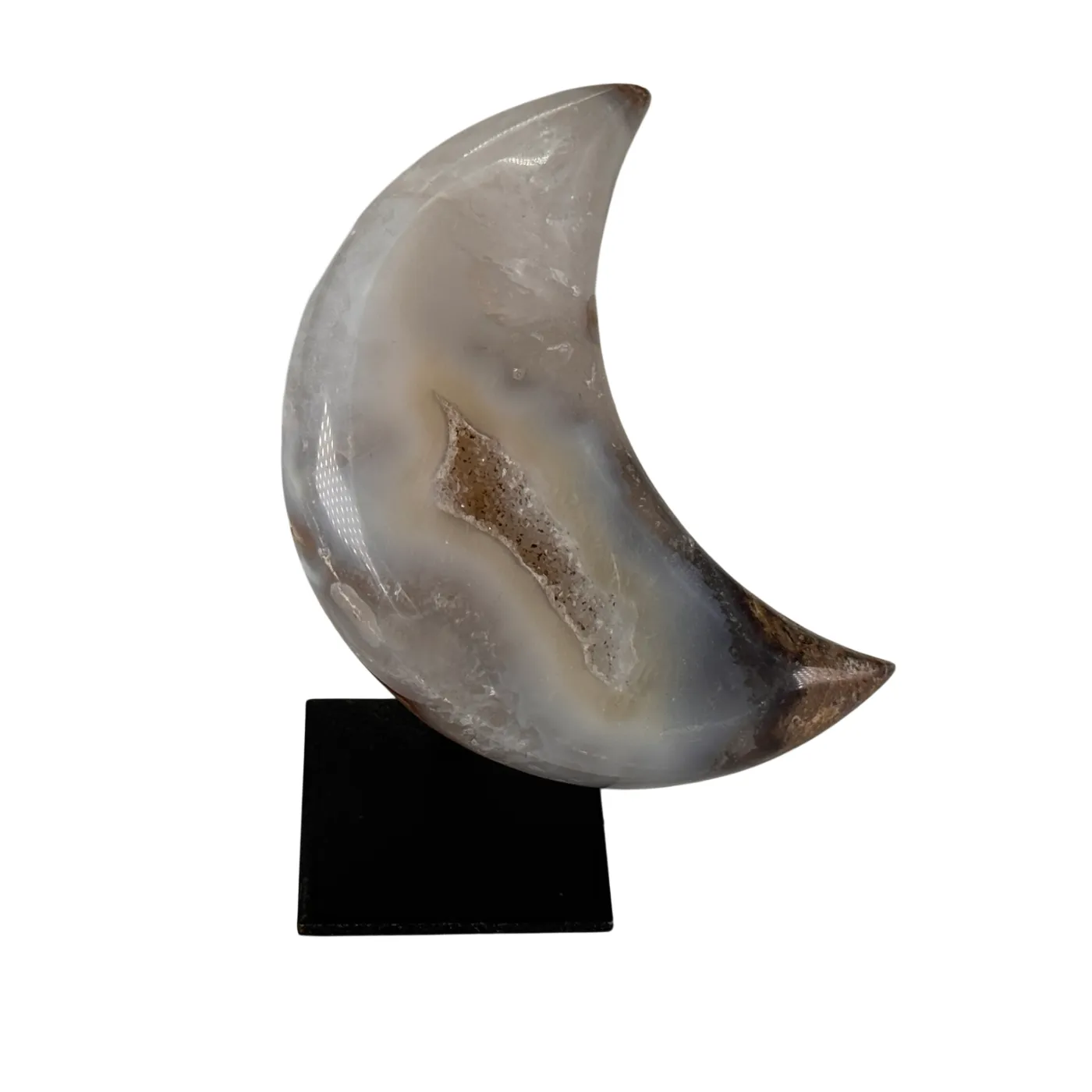Prachtige natuurlijke agaatsteen, met de hand gepolijst in de vorm van een maan en geplaatst op een elegante metalen standaard. In het midden bevindt zich een schitterende druzy, een kristalrijke kern die subtiel glinstert in het licht.