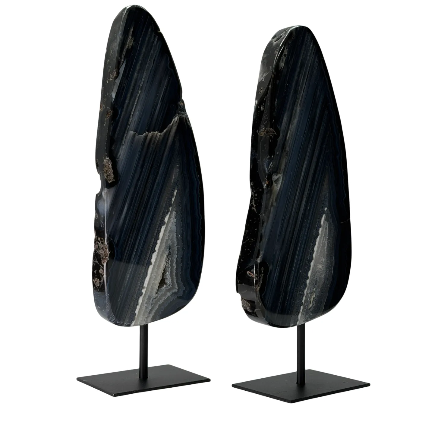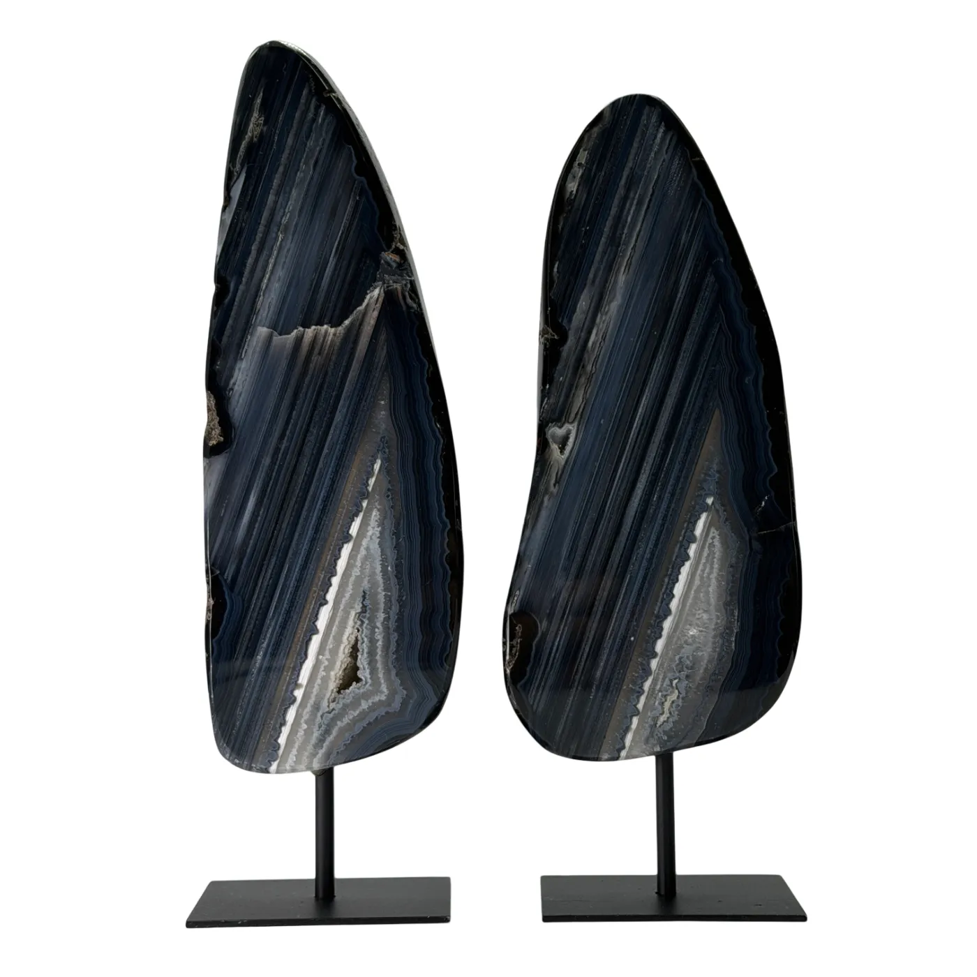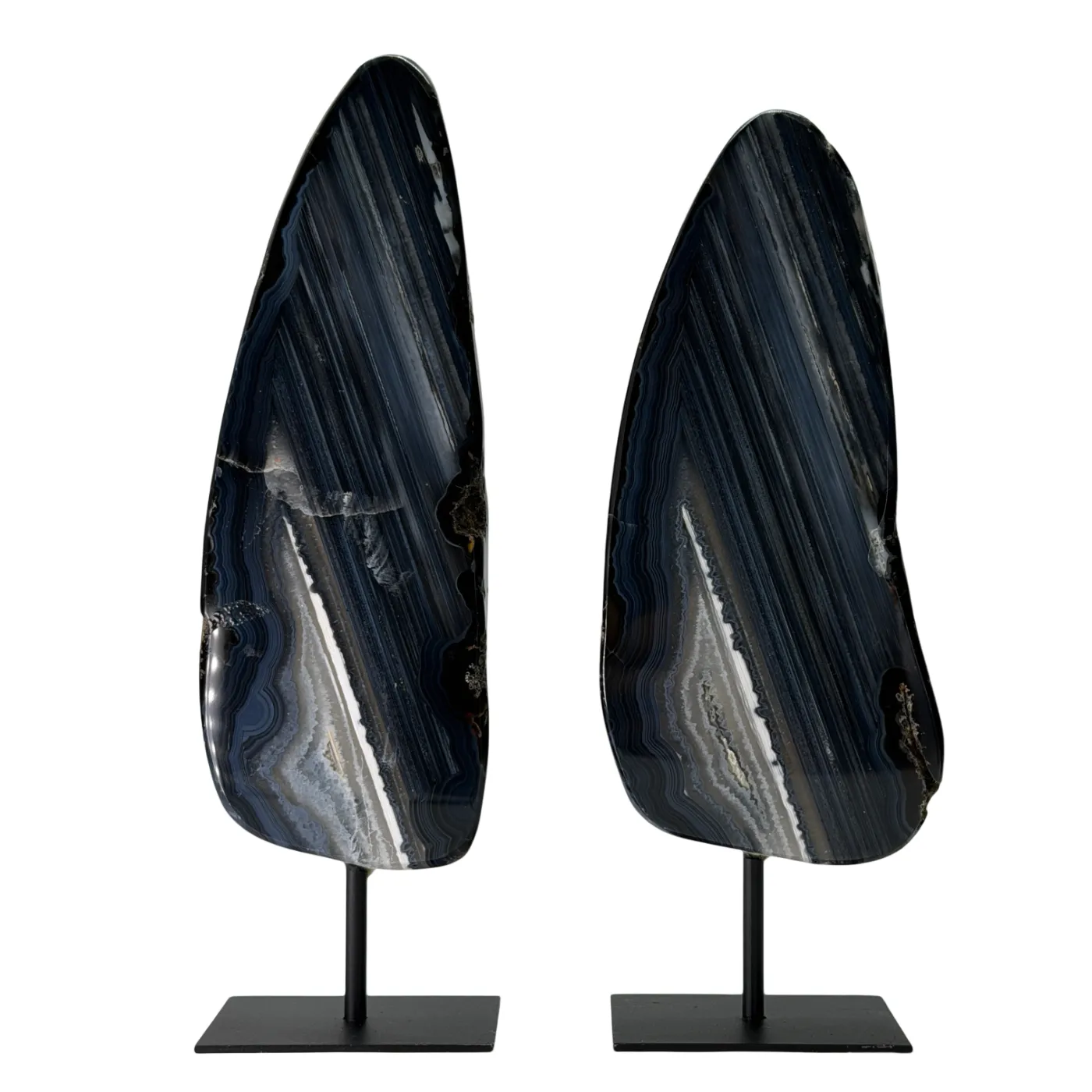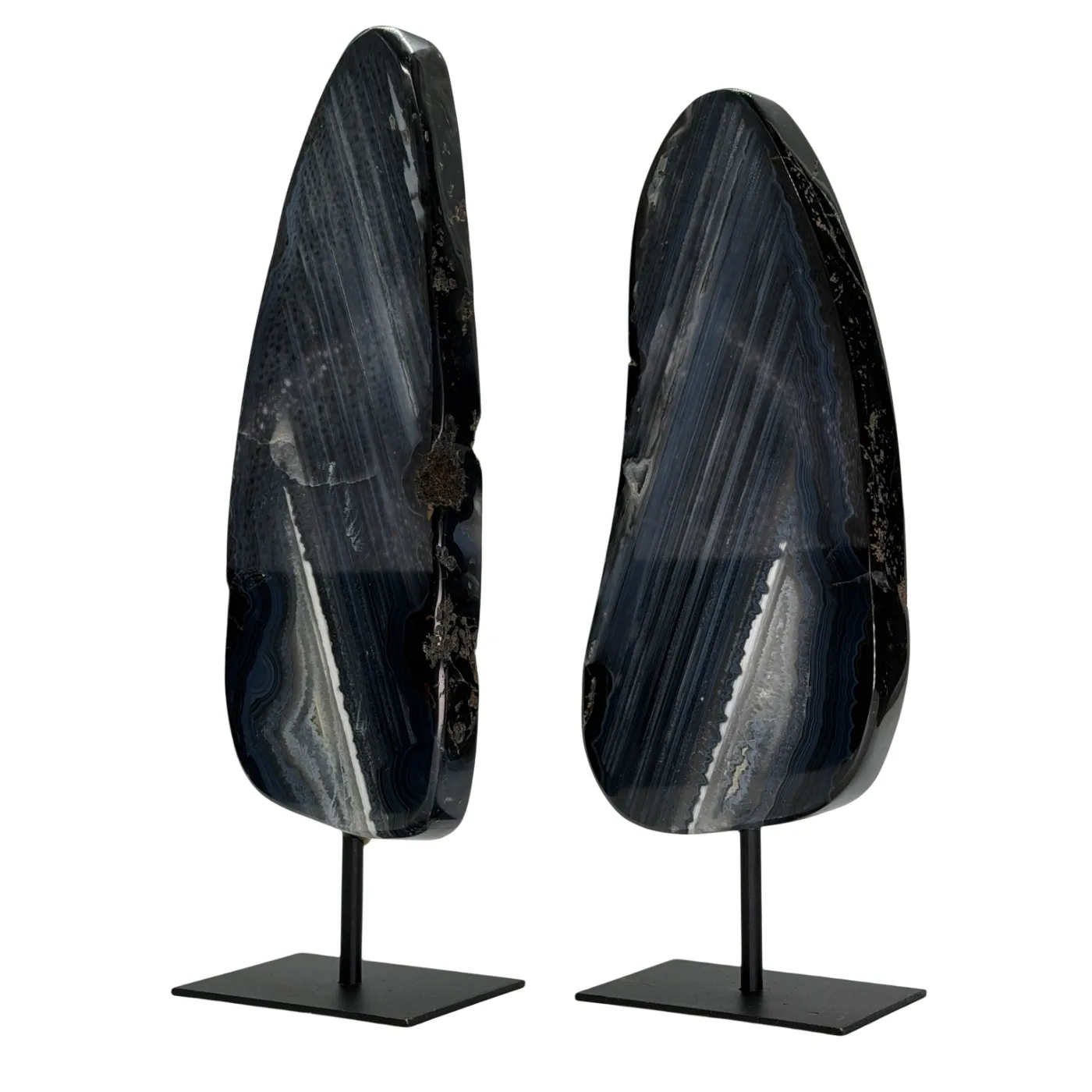 Deze prachtige set van twee agaatstenen op standaard is afkomstig uit dezelfde steen, waardoor beide stukken dezelfde natuurlijke kleuren, patronen en structuren delen. Dit geeft de set een harmonieus en exclusief karakter. De stenen zijn volledig glad gepolijst, zodat de diepe kleuren en gelaagde structuren van de agaat optimaal naar voren komen.