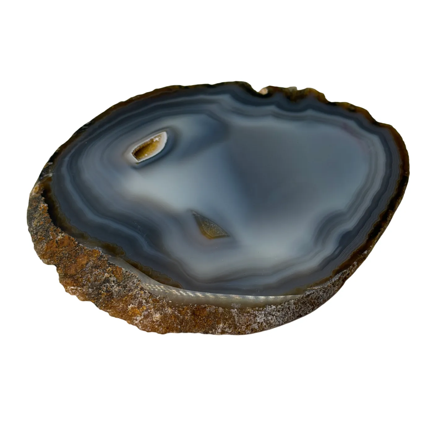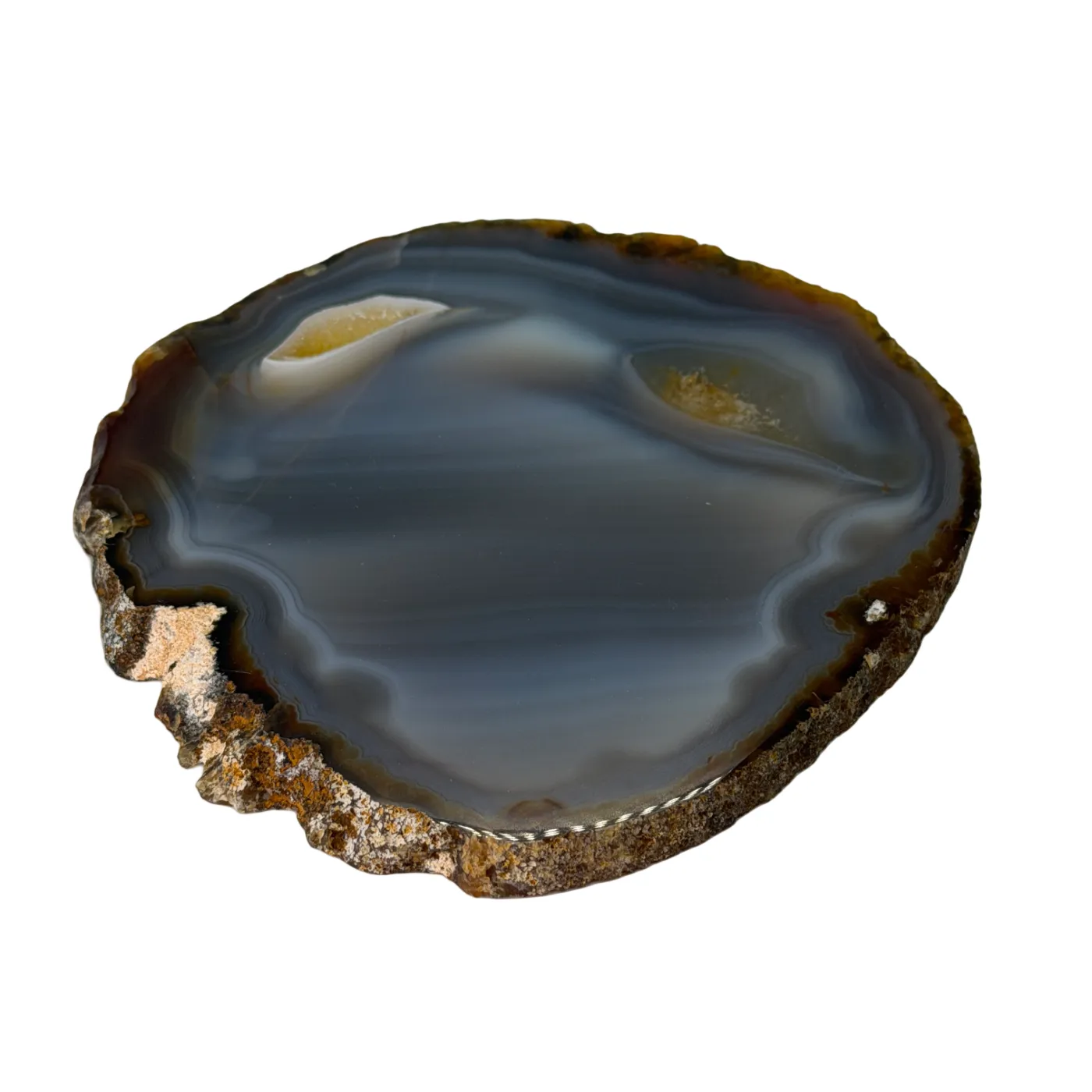 Prachtige agaat schijf uit Brazilië, zorgvuldig gepolijst aan beide zijden en ruw gelaten aan de randen voor een natuurlijke uitstraling. Met een dikte van circa 1 cm komen de kenmerkende lagen en structuren van de agaat prachtig naar voren.