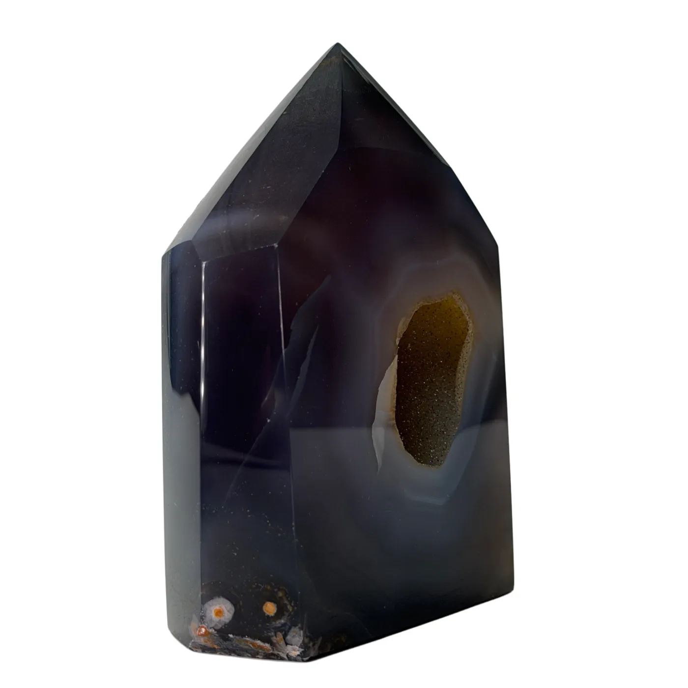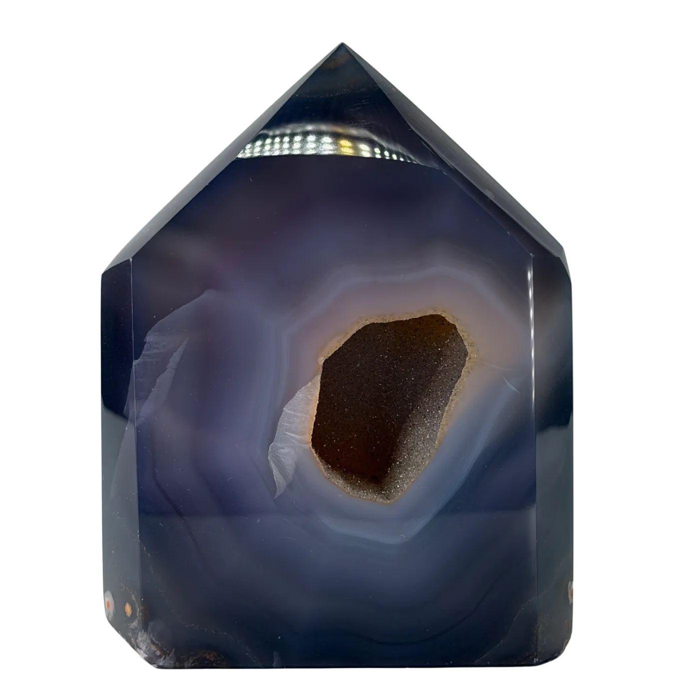 Deze prachtige agaat is afkomstig uit Brazilië en zorgvuldig geslepen en gepolijst in een elegante torenvorm. In het midden van de steen bevindt zich een schitterend kwartsdeel dat mooi fonkelt in het licht. Door de natuurlijke structuren en kleuren is iedere agaat uniek, wat dit stuk tot een bijzonder en decoratief object maakt.