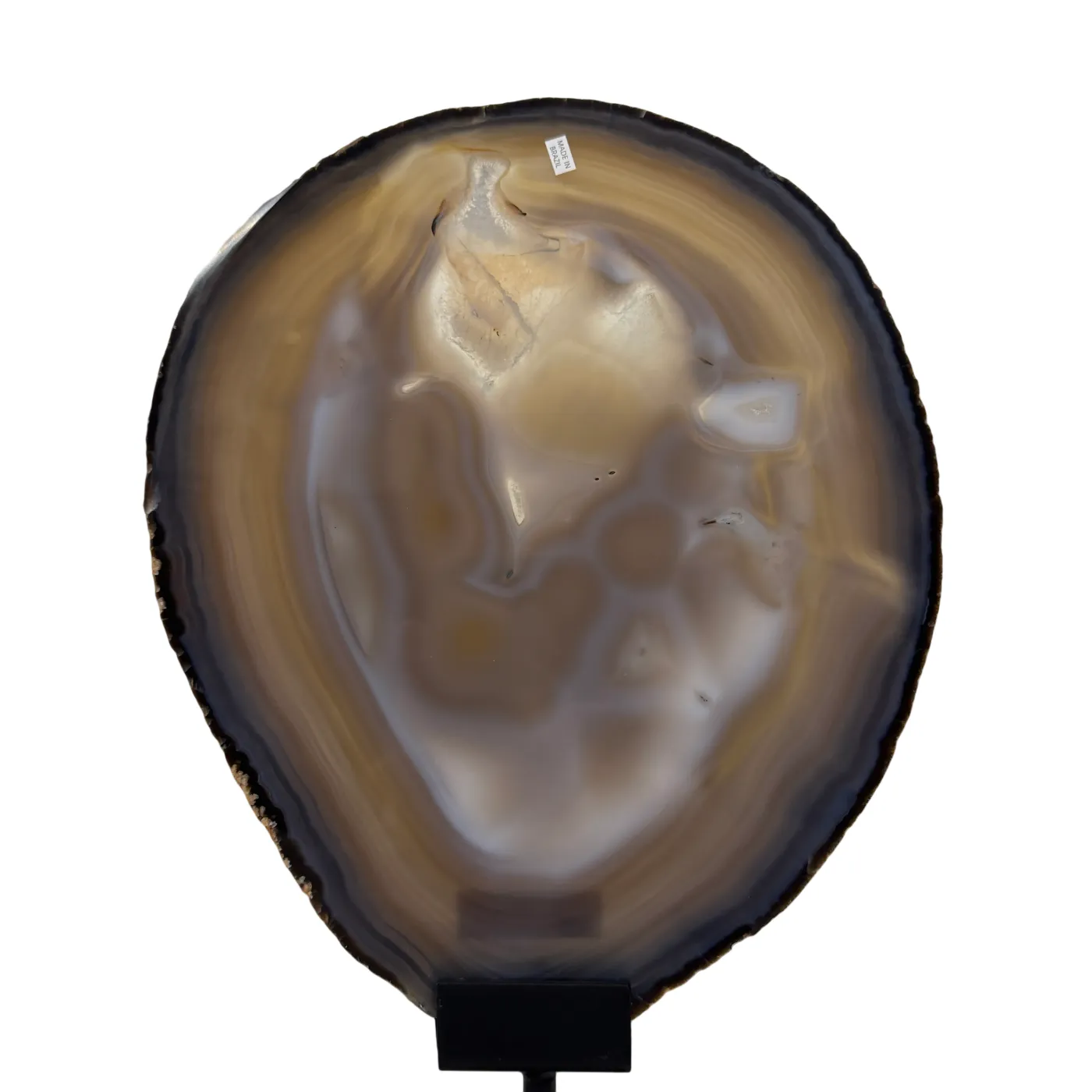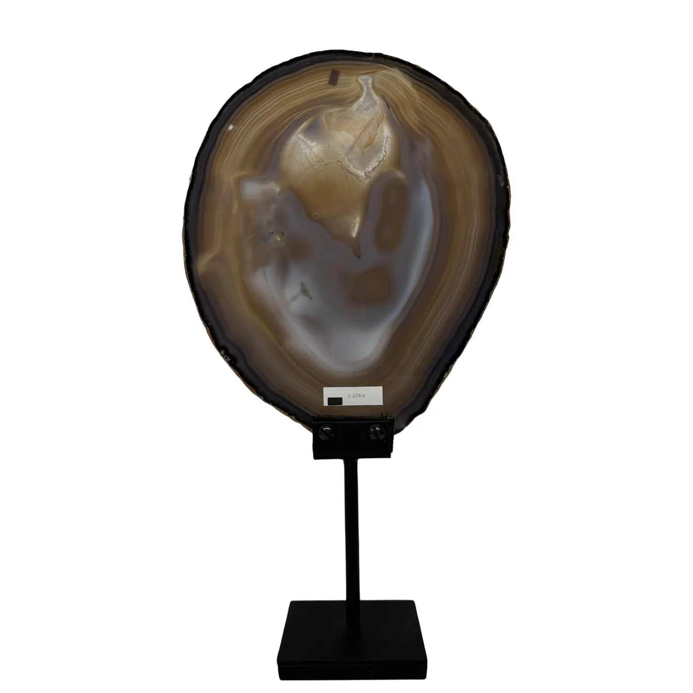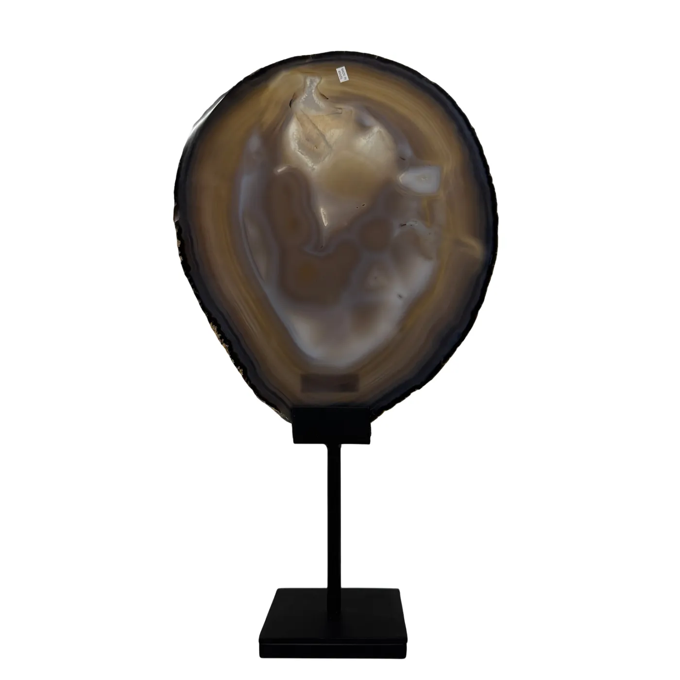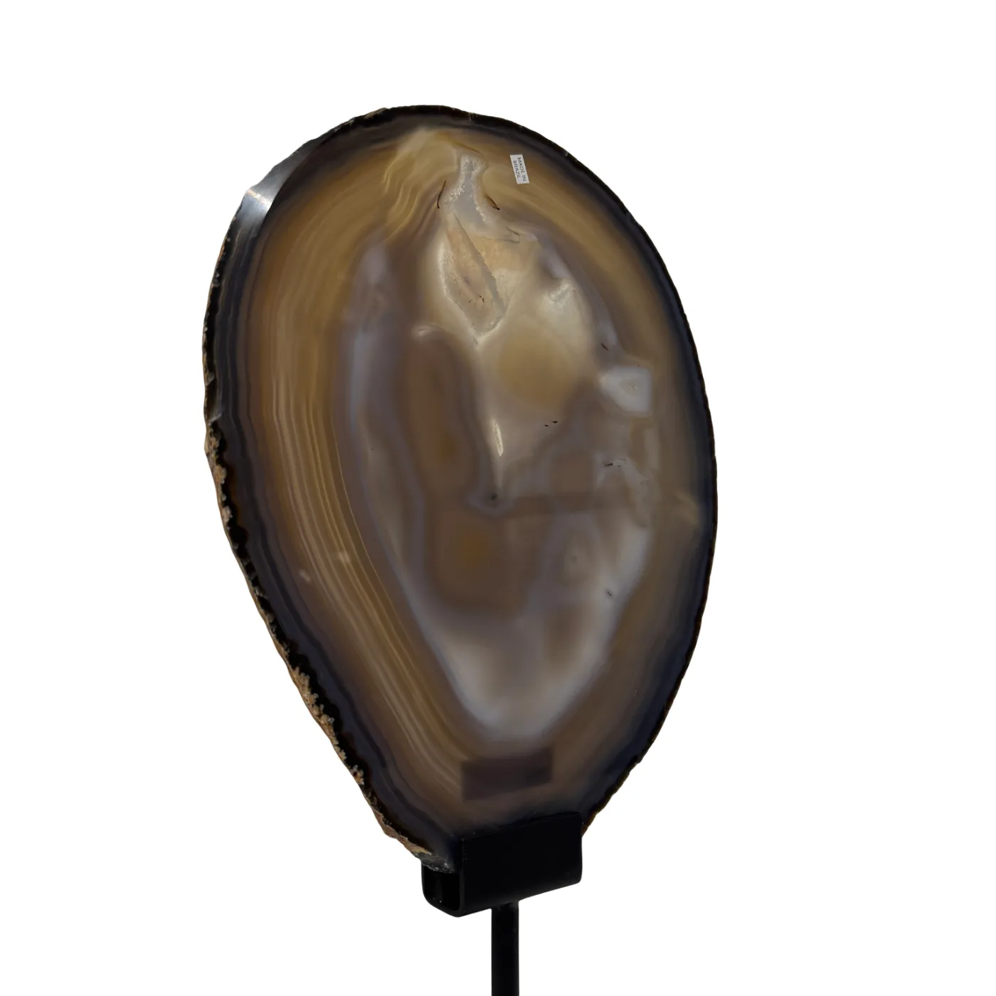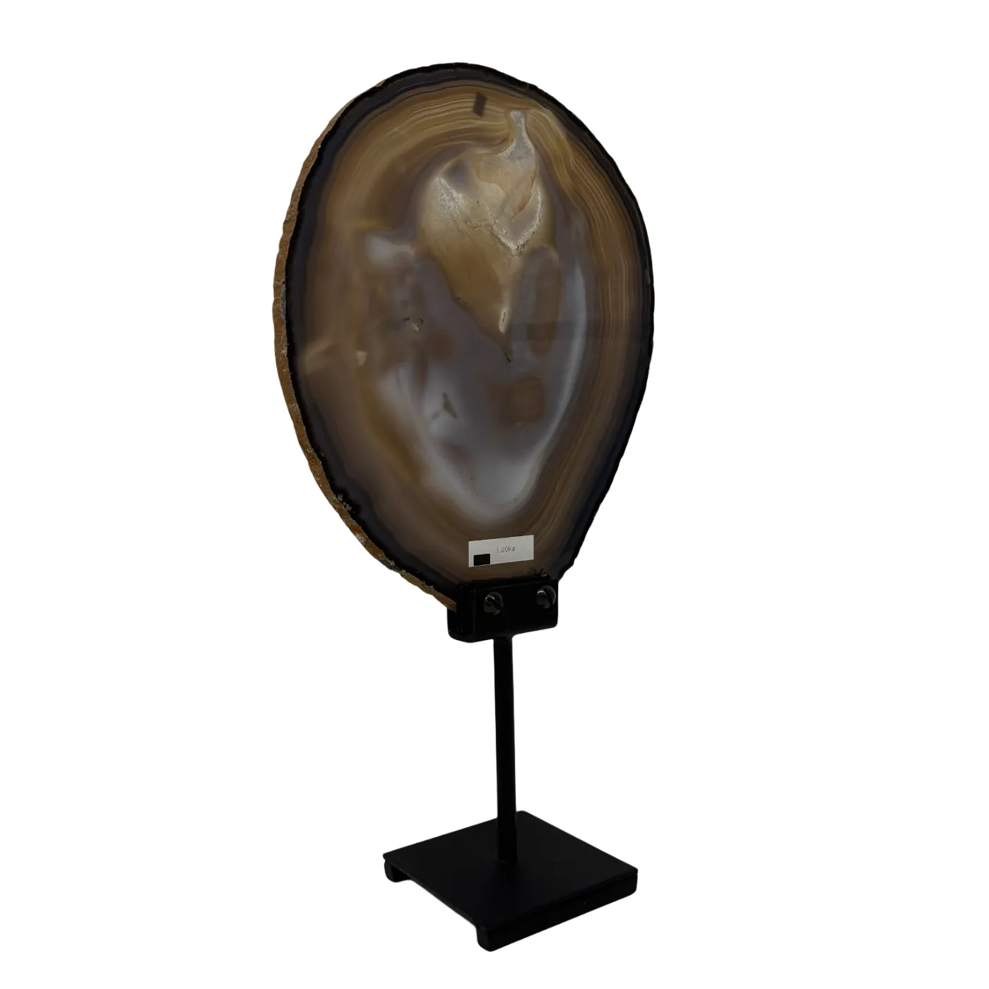 Deze indrukwekkende agaatschijf uit Brazilië is een echte blikvanger voor in huis of kantoor. De schijf heeft een diameter van 21,50 cm en is zorgvuldig geplaatst op een stevige zwarte metalen standaard. De voorkant én achterkant zijn gepolijst, waardoor de natuurlijke kleuren, lijnen en patronen prachtig naar voren komen.
