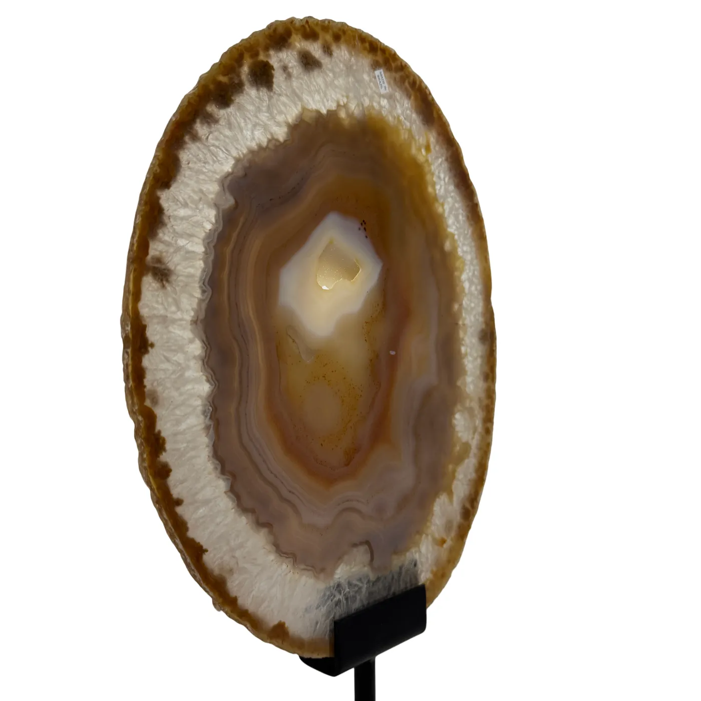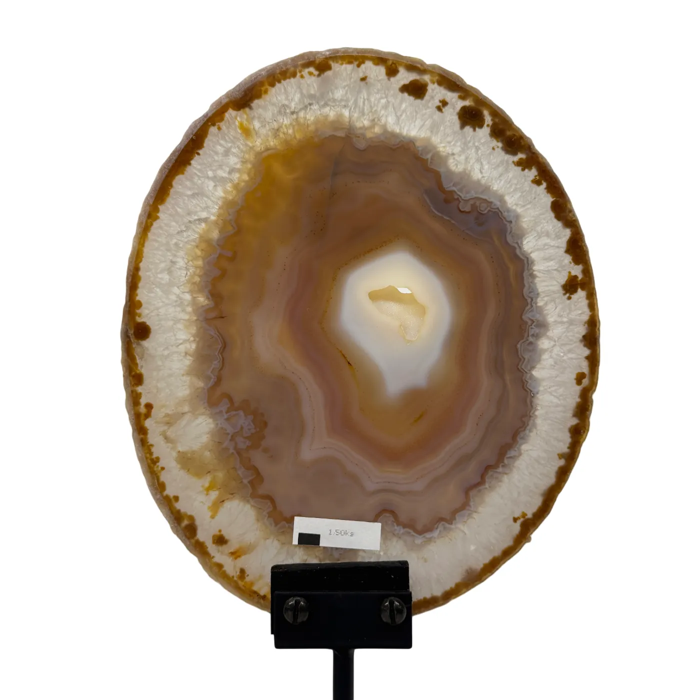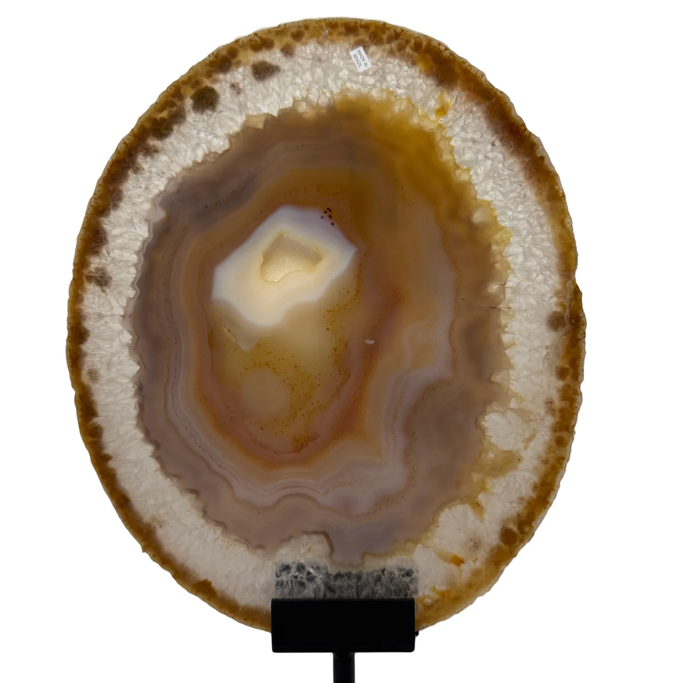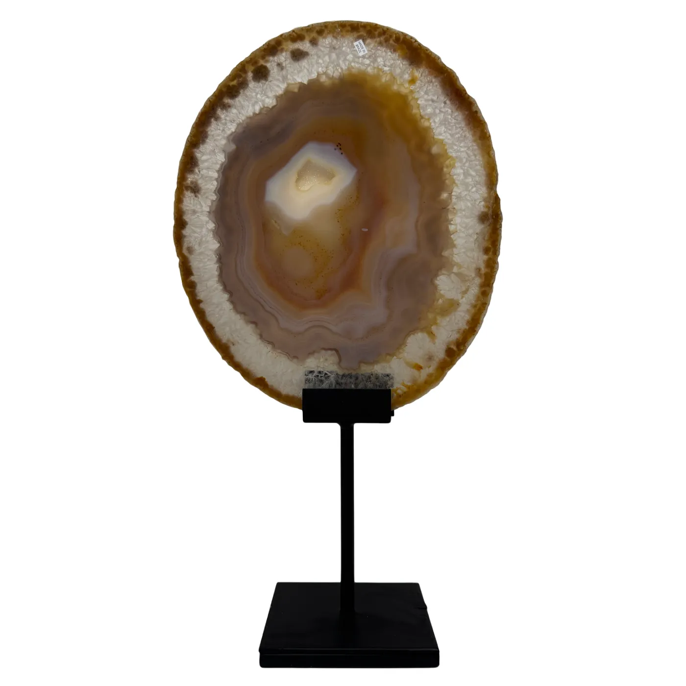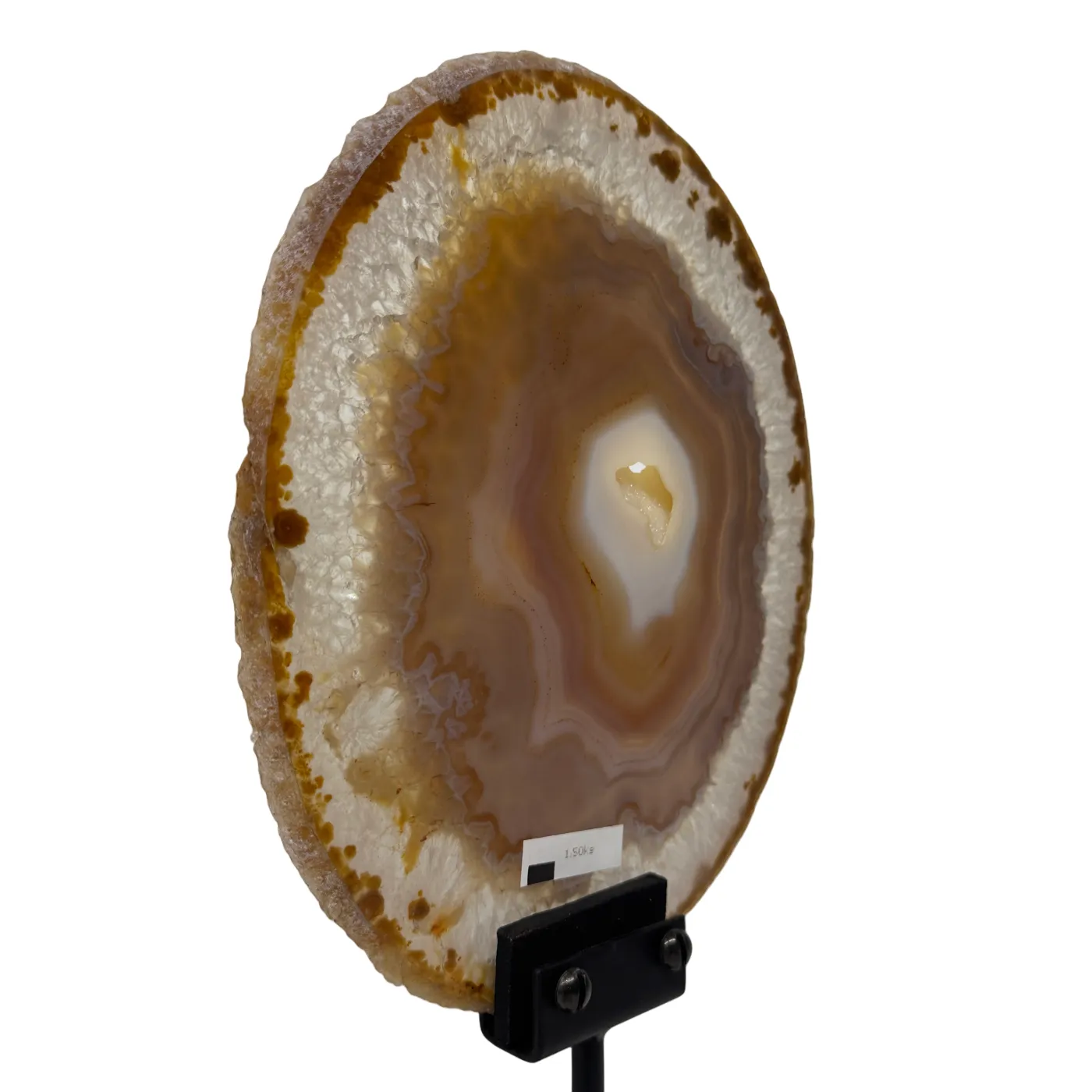 Deze indrukwekkende agaatschijf uit Brazilië is een echte blikvanger voor in huis of kantoor. De schijf heeft een diameter van 22 cm en is zorgvuldig geplaatst op een stevige zwarte metalen standaard. De voorkant én achterkant zijn gepolijst, waardoor de natuurlijke kleuren, lijnen en patronen prachtig naar voren komen.
