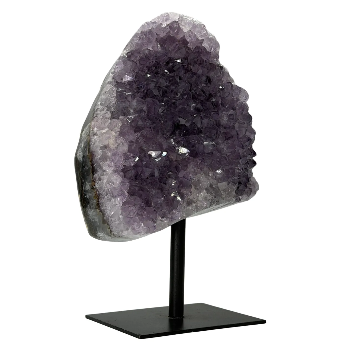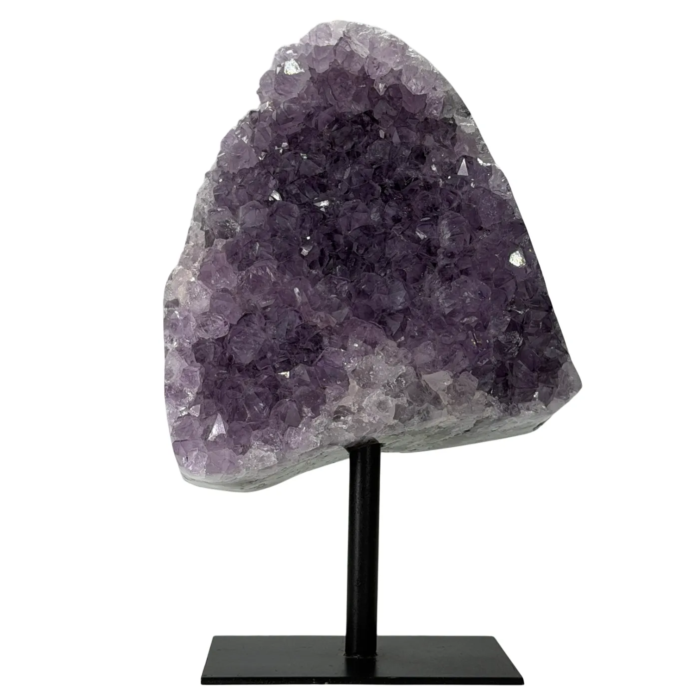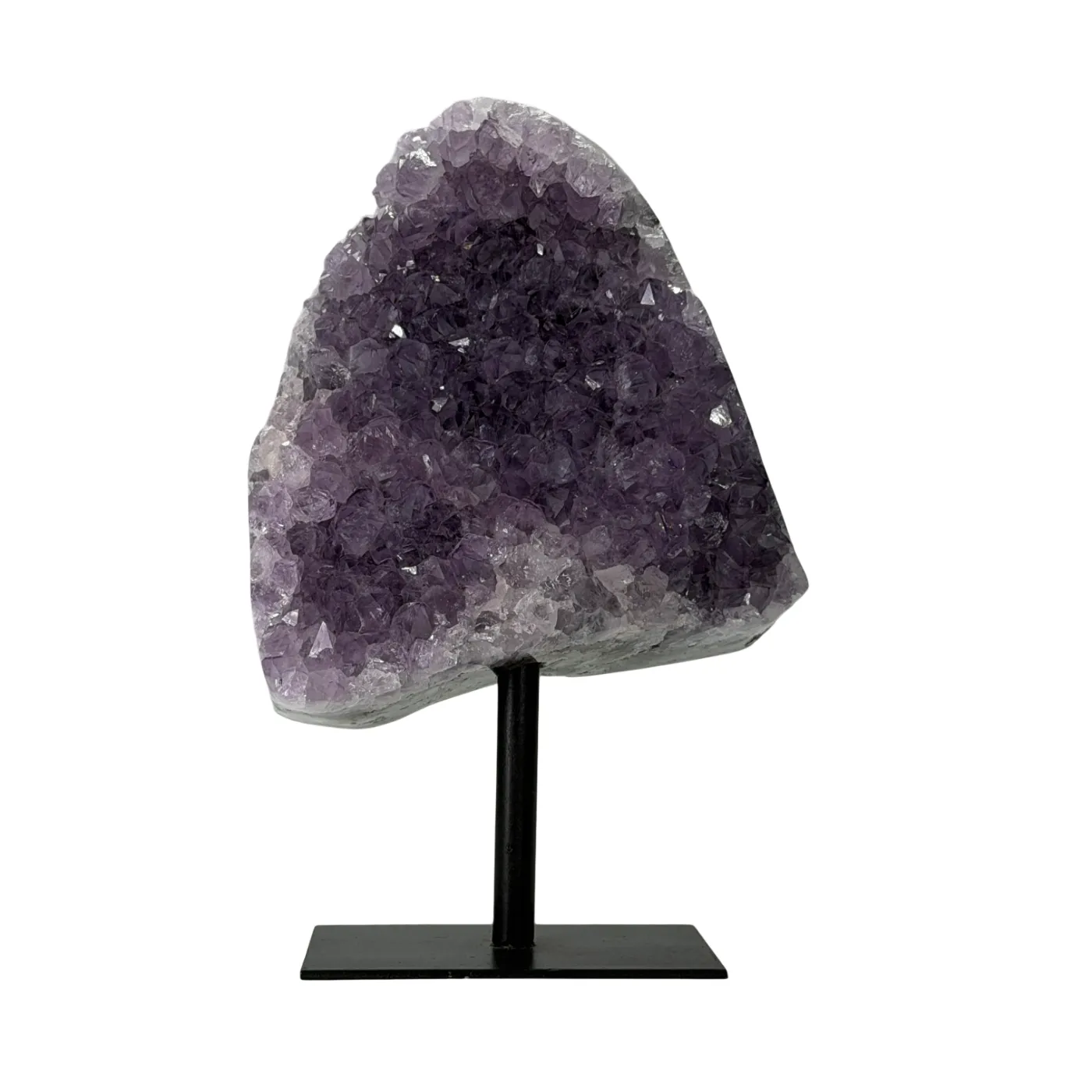 Deze prachtige amethist cluster op standaard is afkomstig uit Brazilië en bestaat uit natuurlijke, lichtpaarse amethistpunten. De cluster is stevig bevestigd op een zwarte metalen voet, wat zorgt voor een moderne en elegante uitstraling.