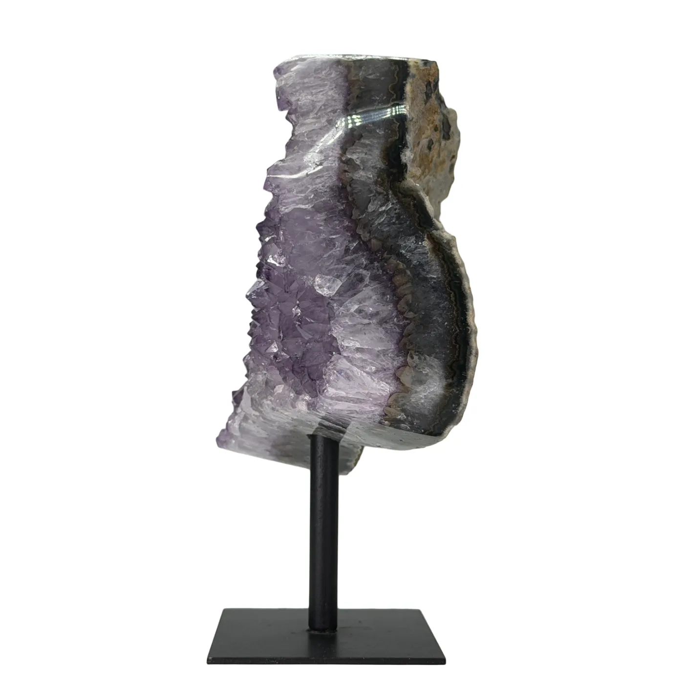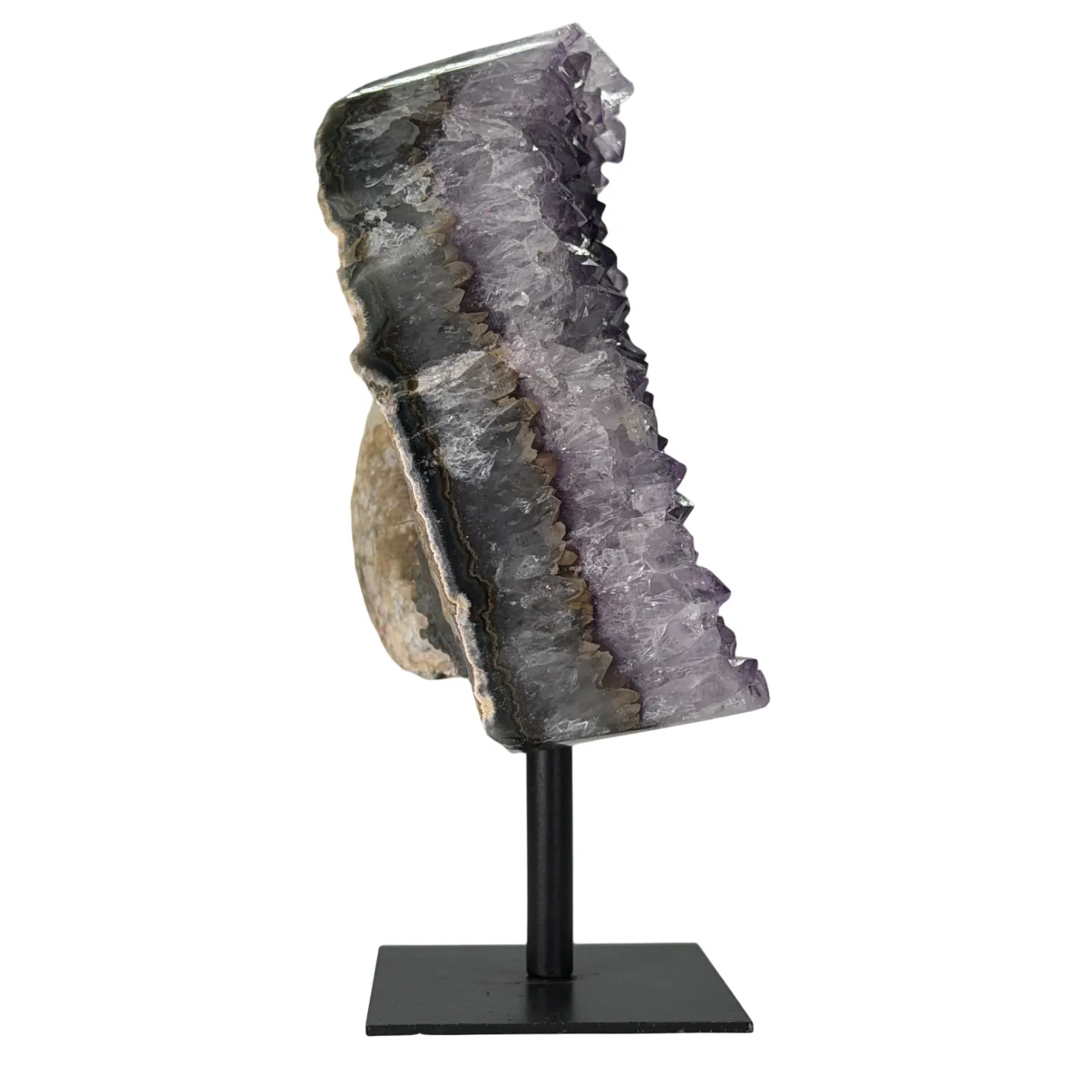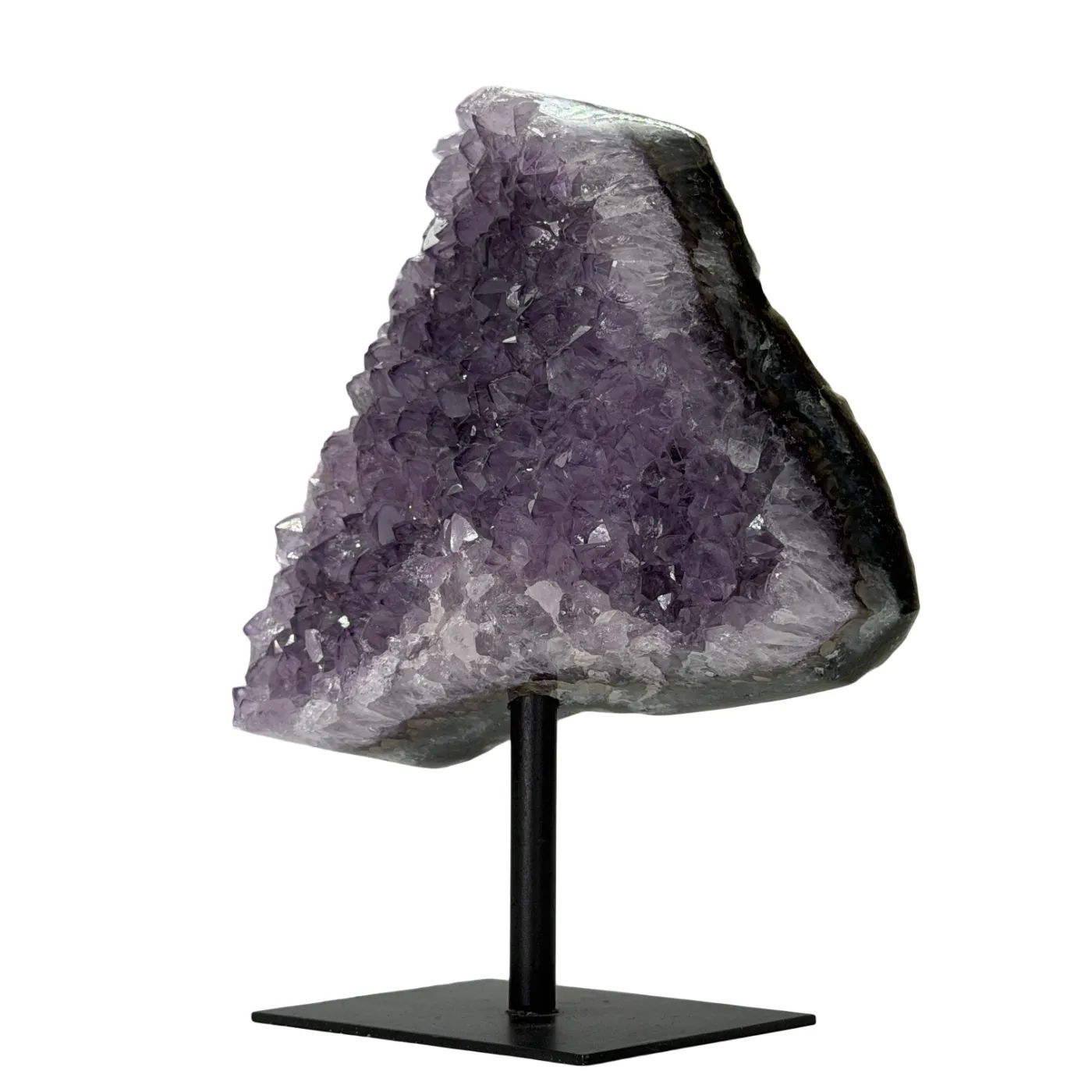 Deze prachtige amethist cluster op standaard is afkomstig uit Brazilië en bestaat uit natuurlijke, lichtpaarse amethistpunten. De cluster is stevig bevestigd op een zwarte metalen voet, wat zorgt voor een moderne en elegante uitstraling.
