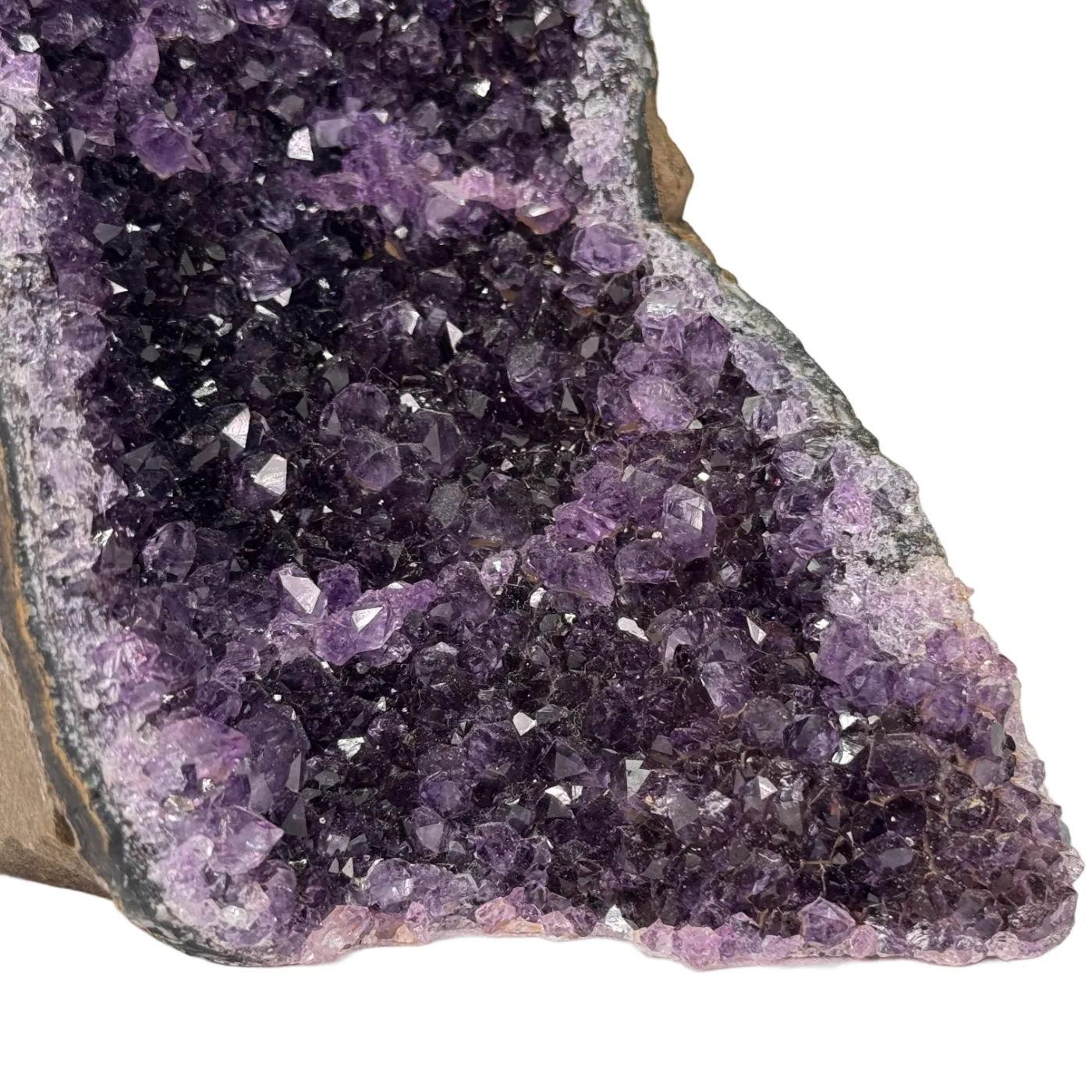 Een schitterende donkerpaarse amethist cut base uit Uruguay. De diepe kleur en fonkelende kristallen geven deze steen een luxueuze uitstraling en maken ieder stuk uniek. Alleen de onderzijde is zorgvuldig vlak geslepen, zodat de steen stevig en rechtop kan staan.