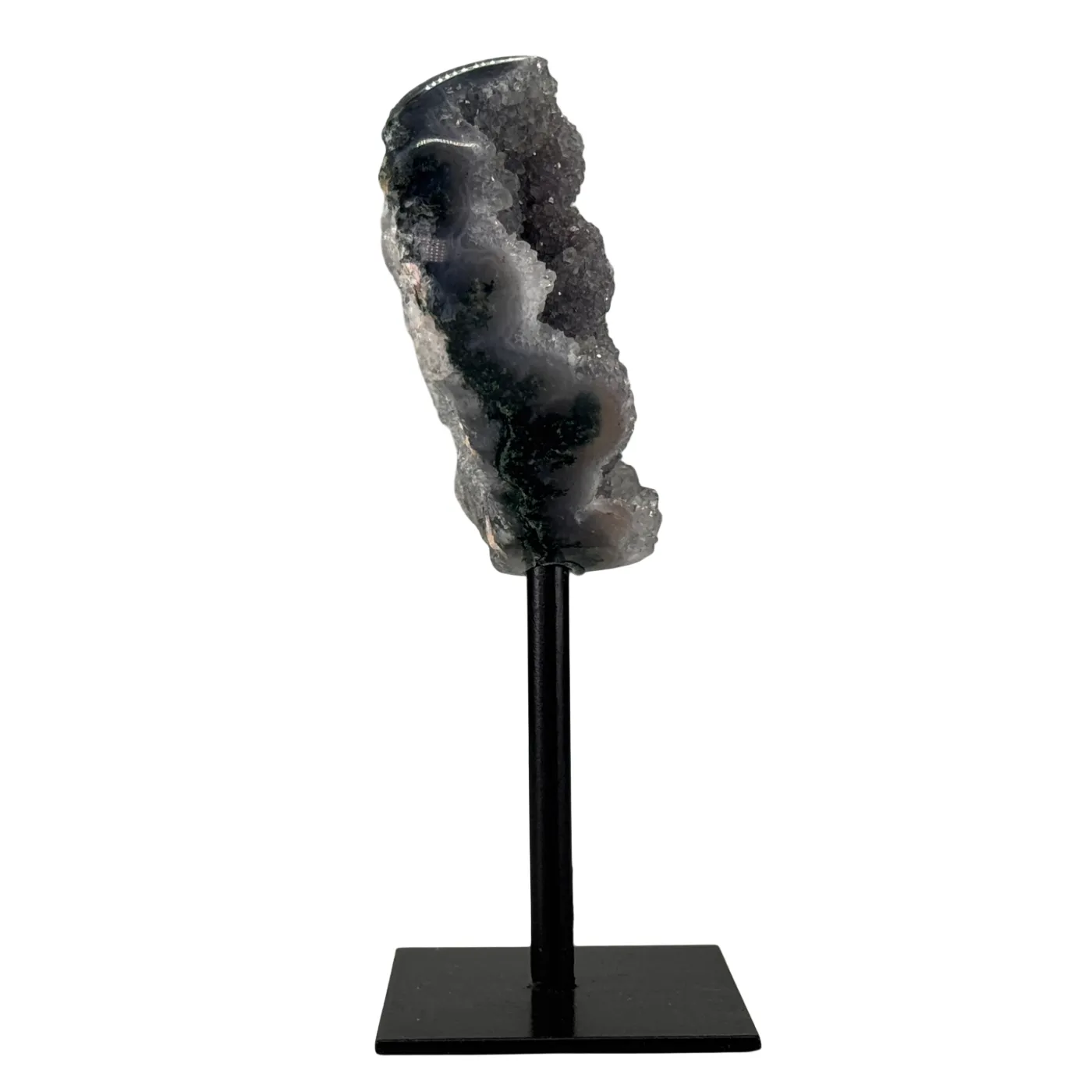 Prachtige lichte amethist flower uit Brazilië, geplaatst op een zwarte metalen standaard.
