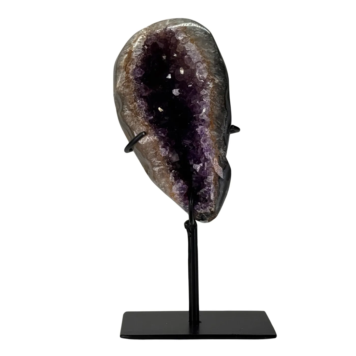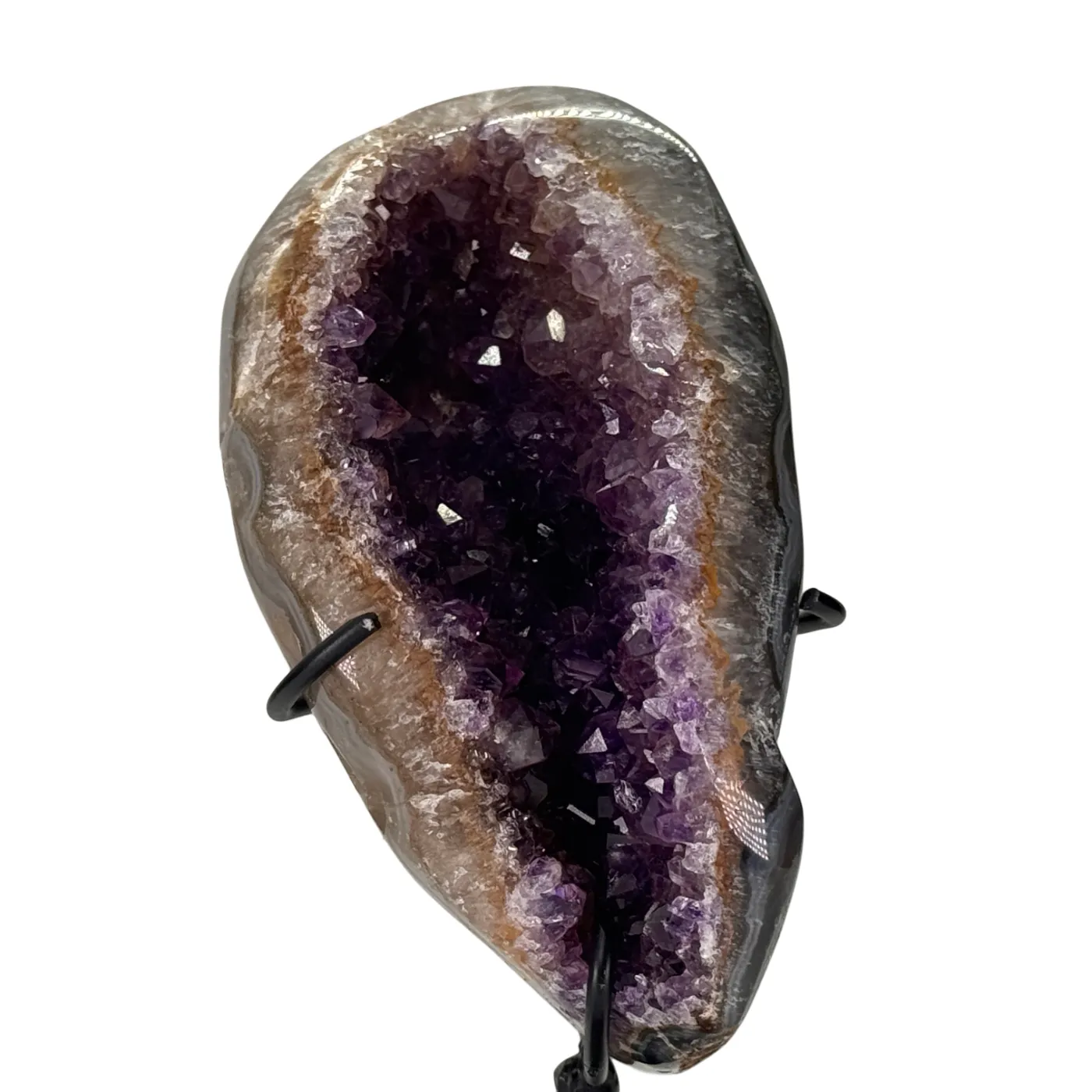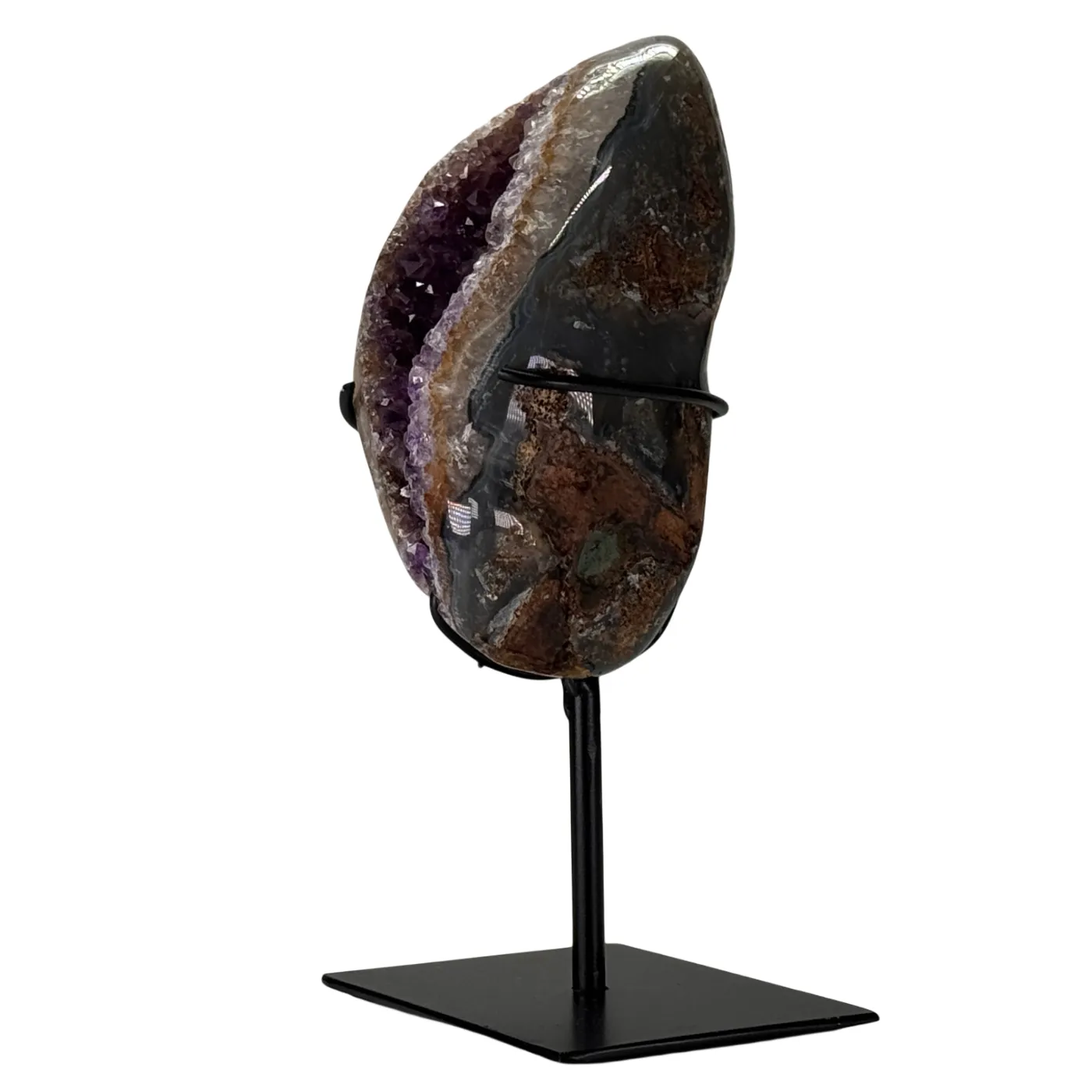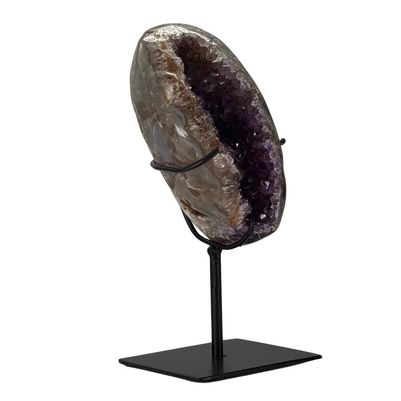 Prachtige amethist-agaat geode uit Brazilië, los gepresenteerd op een zwarte metalen standaard.