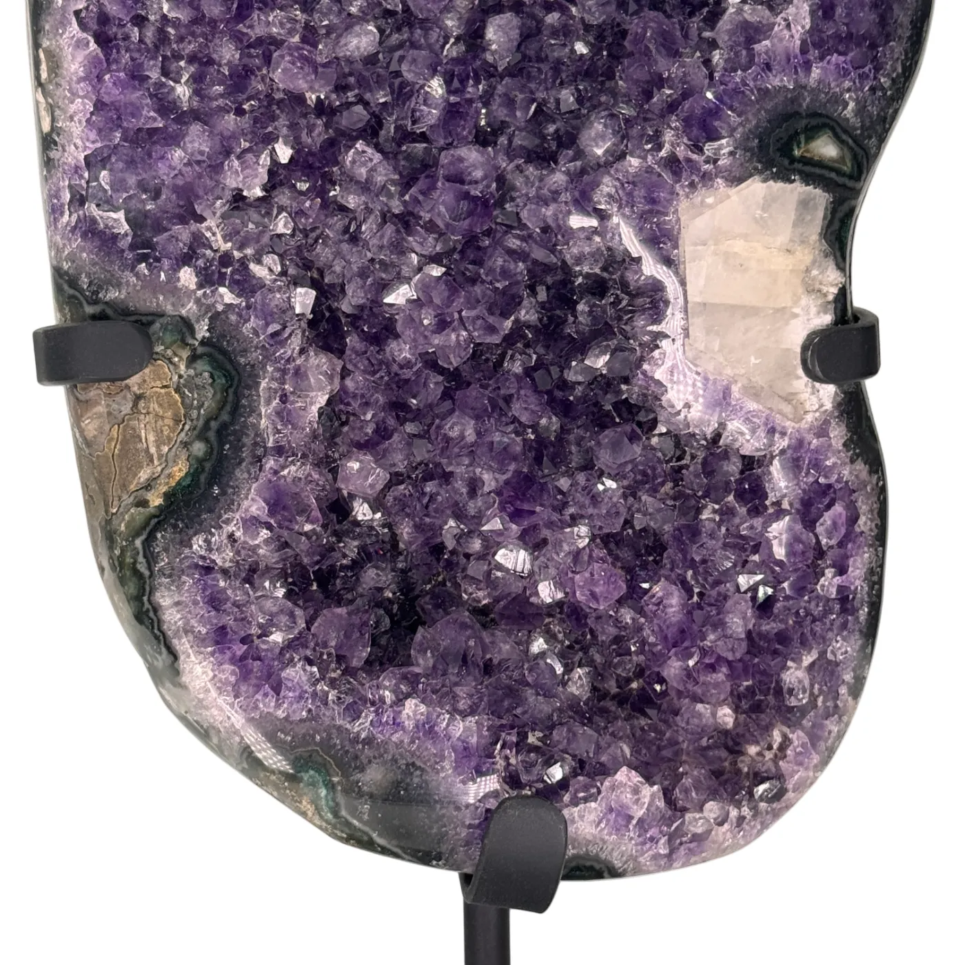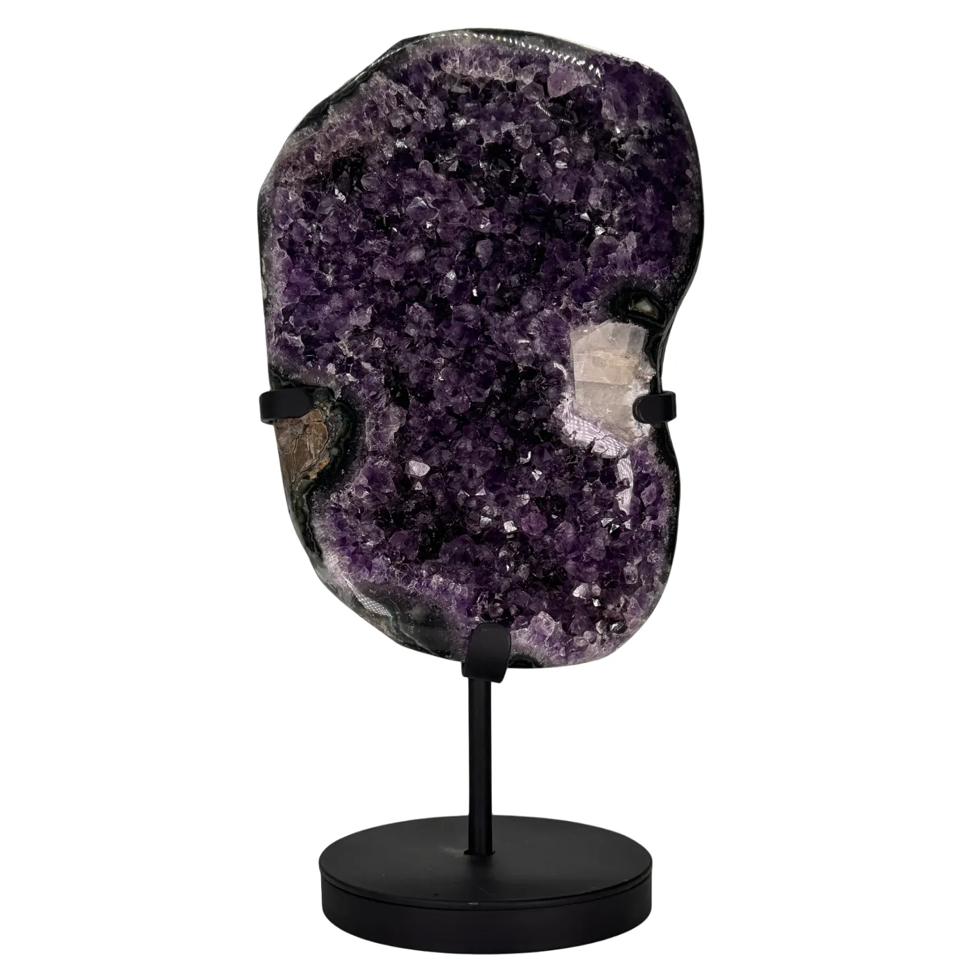 Luxe amethist op zwarte metalen standaard – met calciet & mosagaat (Uruguay)