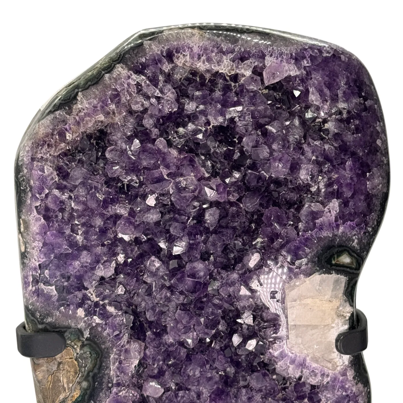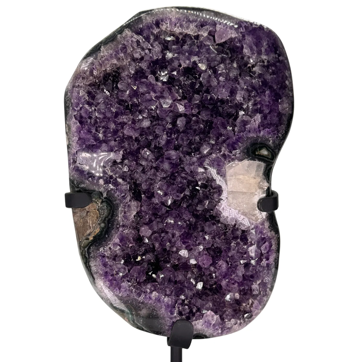 Deze krachtige en hoogwaardige amethist is prachtig gepresenteerd op een elegante zwarte metalen standaard. De steen is volledig natuurlijk en aan de zijkanten zorgvuldig geslepen, waardoor de diepe paarse kristalpunten extra mooi zichtbaar worden.