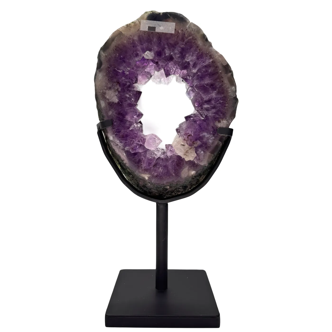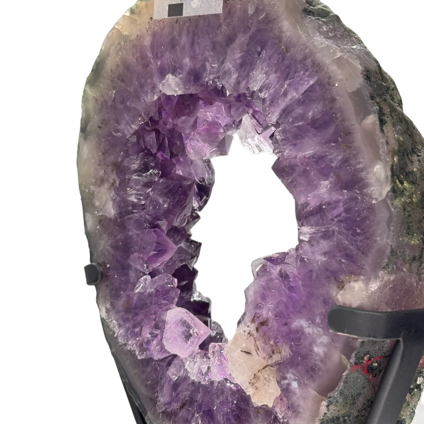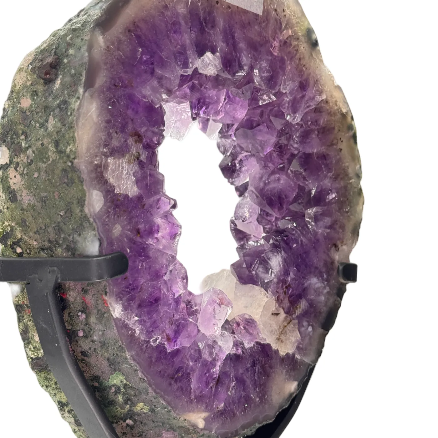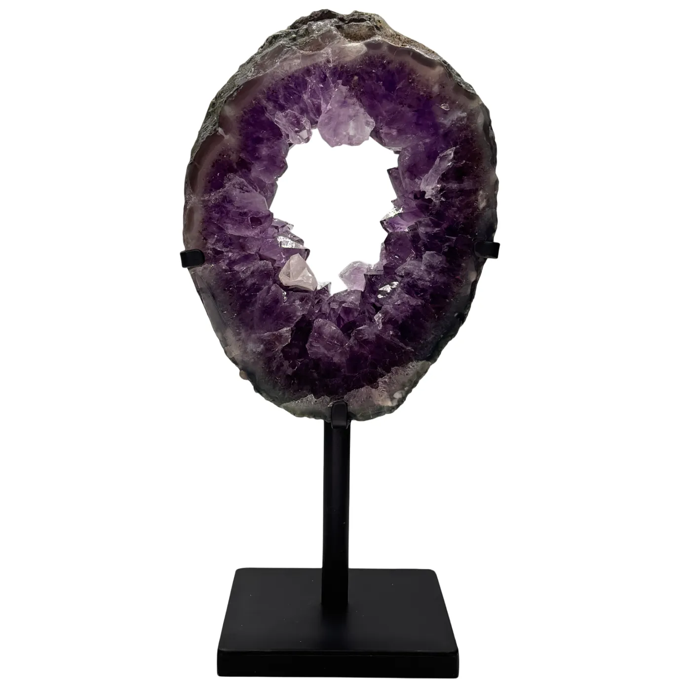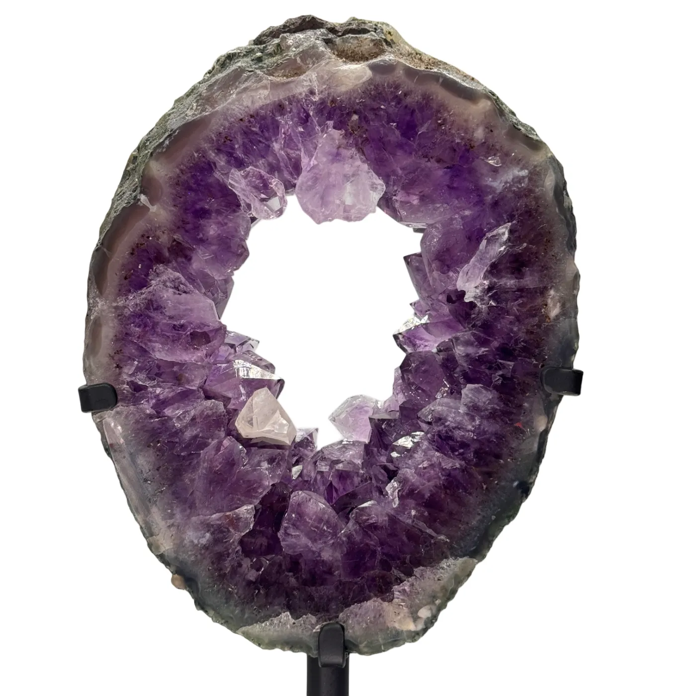 Zowel de voor- als achterkant zijn gepolijst, waardoor de natuurlijke structuren en kristalformaties prachtig zichtbaar zijn. De amethist rust op een draaibare metalen standaard, zodat u het stuk moeiteloos vanuit elke hoek kunt bewonderen. De steen ligt los op de standaard (niet gelijmd of geboord), wat de authenticiteit en waarde van het stuk volledig bewaart.
