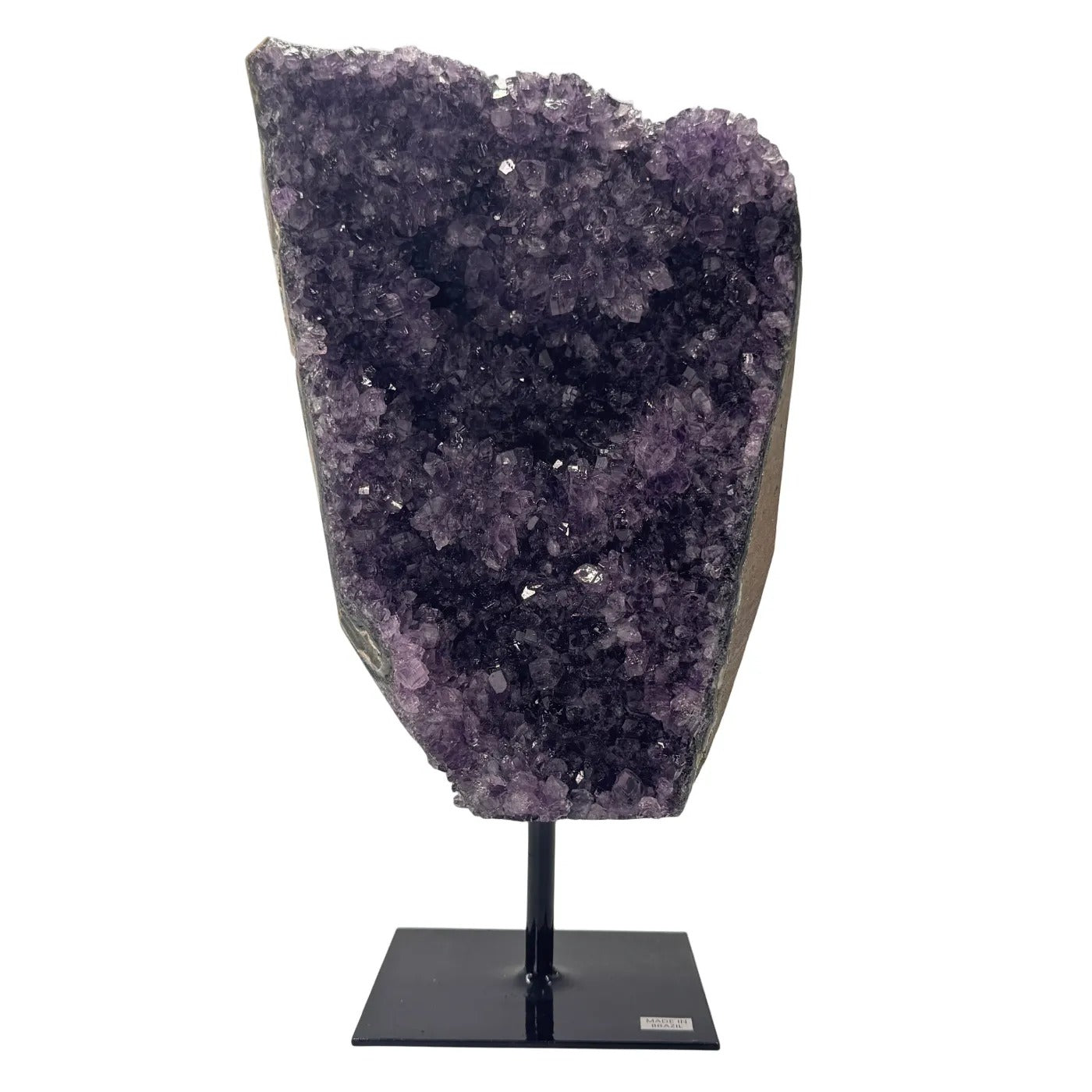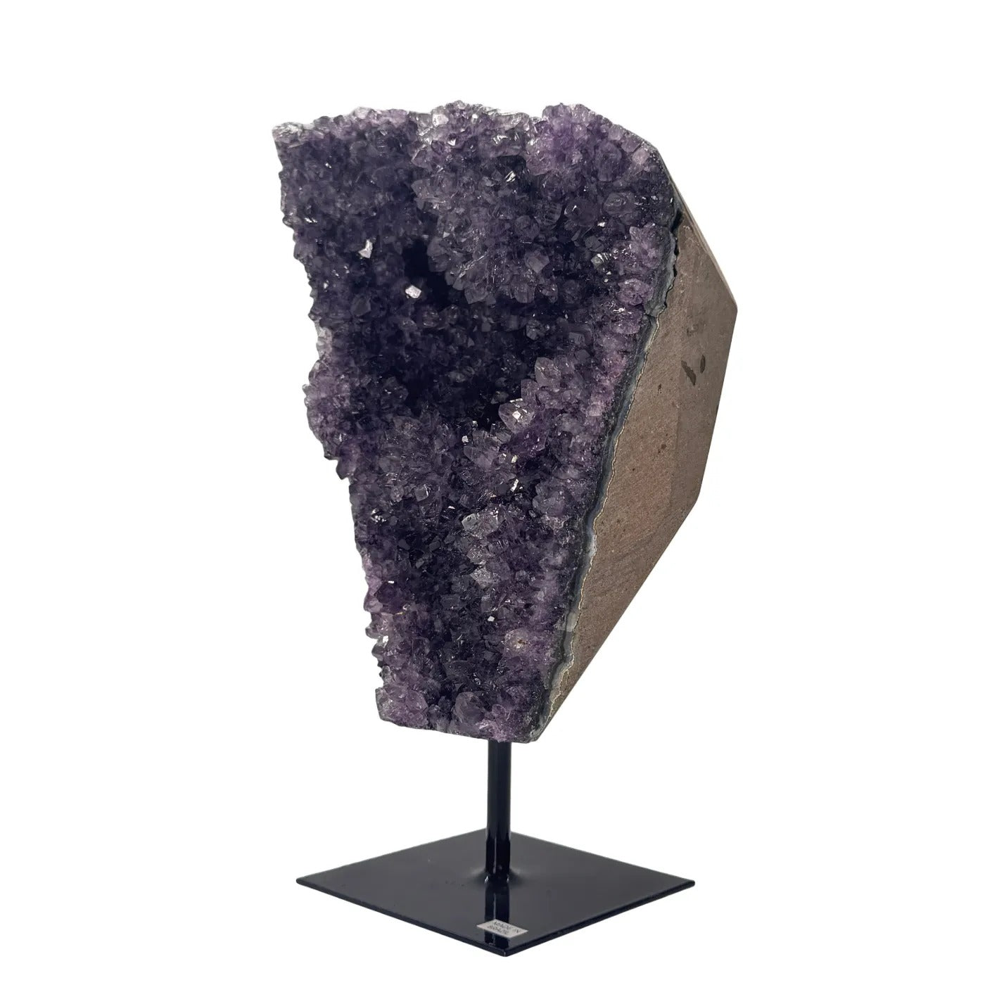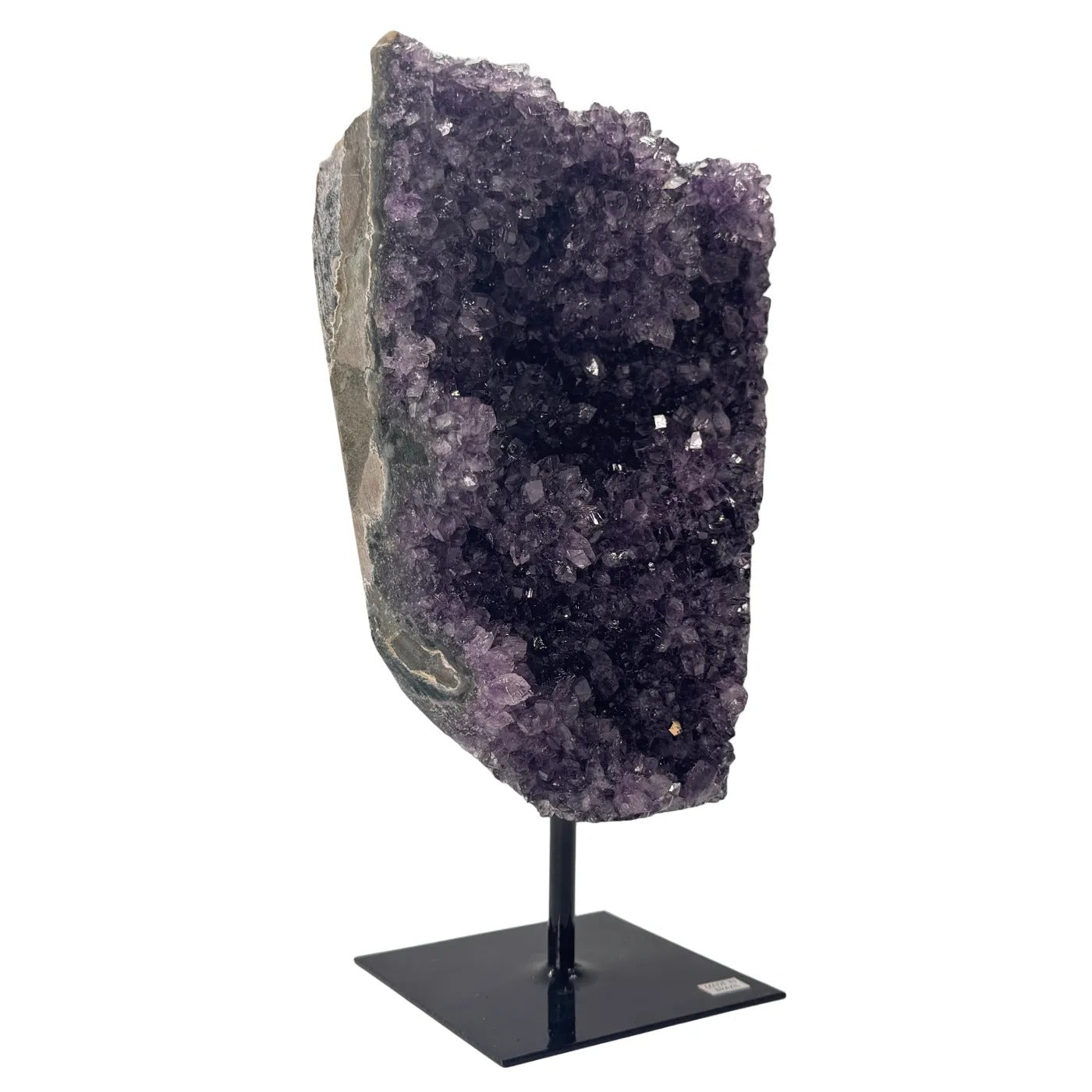 Prachtige krachtige amethist van hoge kwaliteit, stijlvol gepresenteerd op een zwarte metalen standaard. De steen is volledig origineel en geslepen aan de zijkanten.