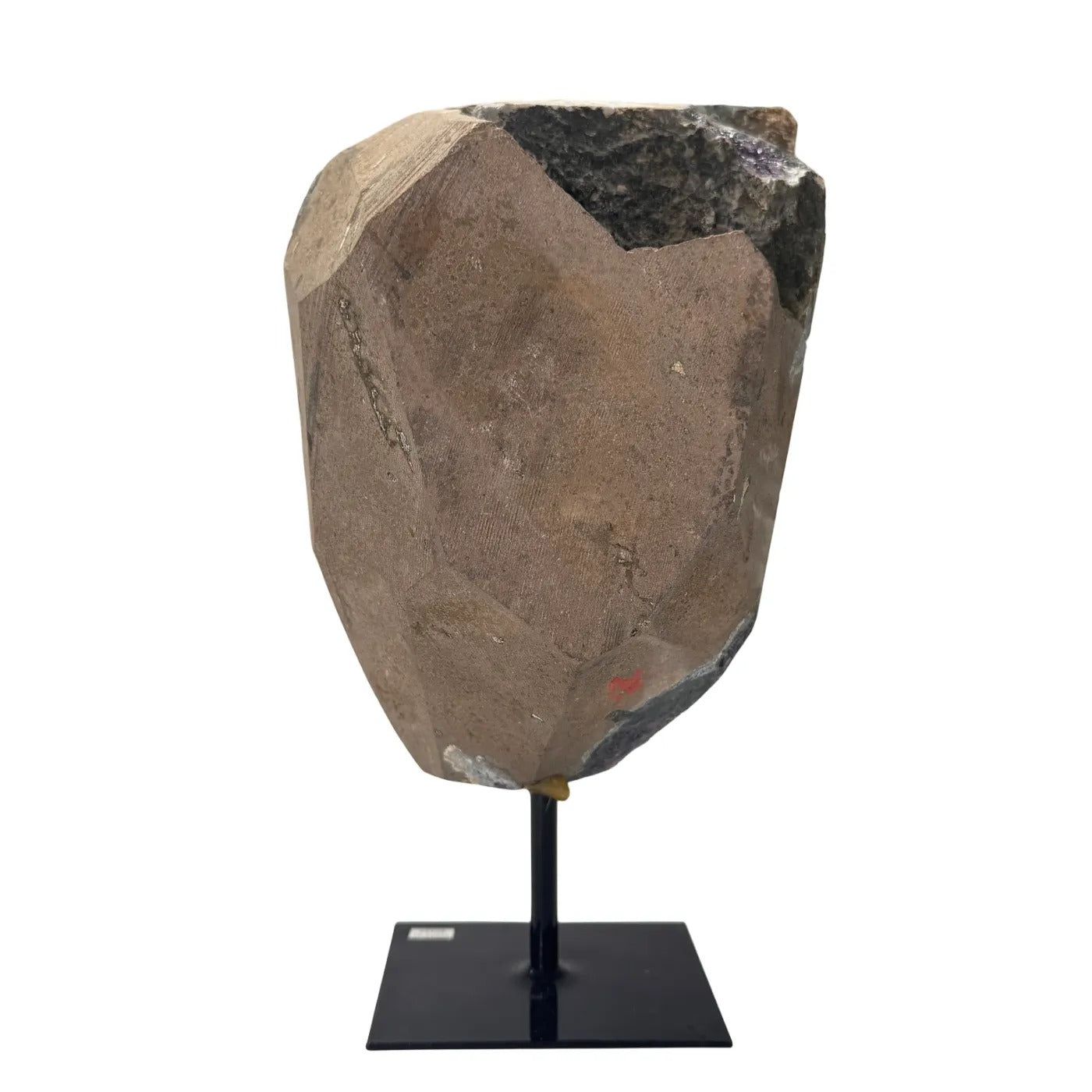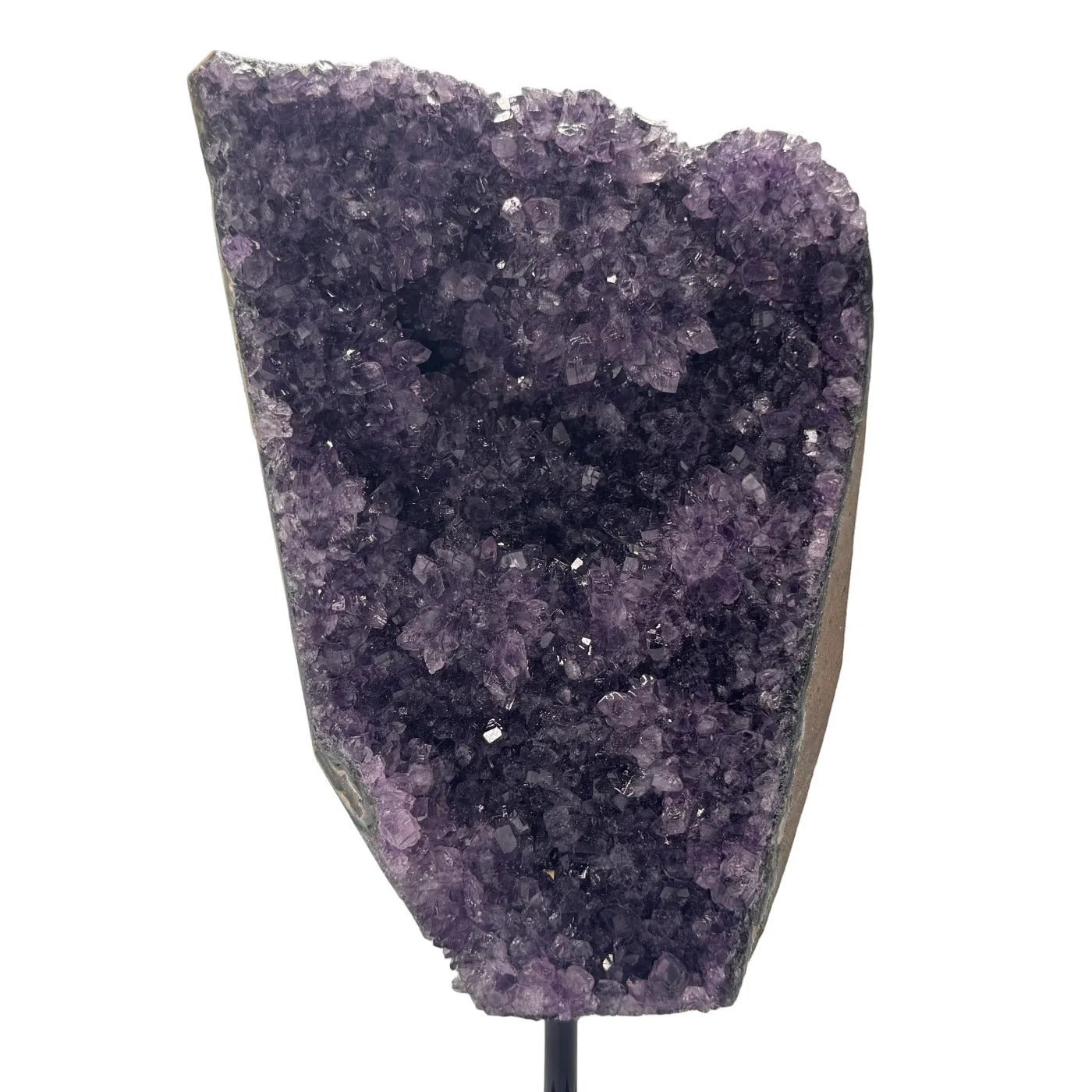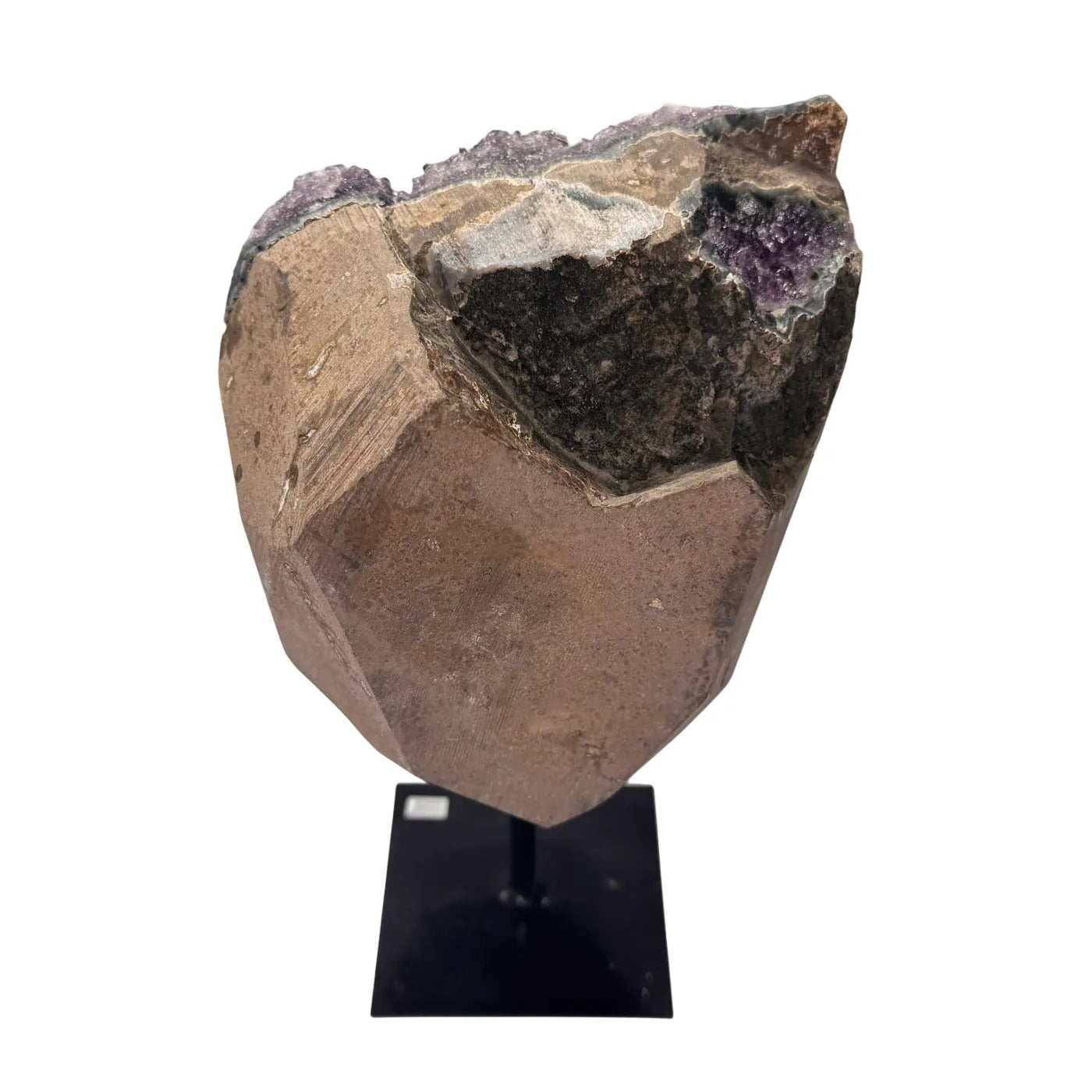 Prachtige krachtige amethist van hoge kwaliteit, stijlvol gepresenteerd op een zwarte metalen standaard. De steen is volledig origineel en geslepen aan de zijkanten.