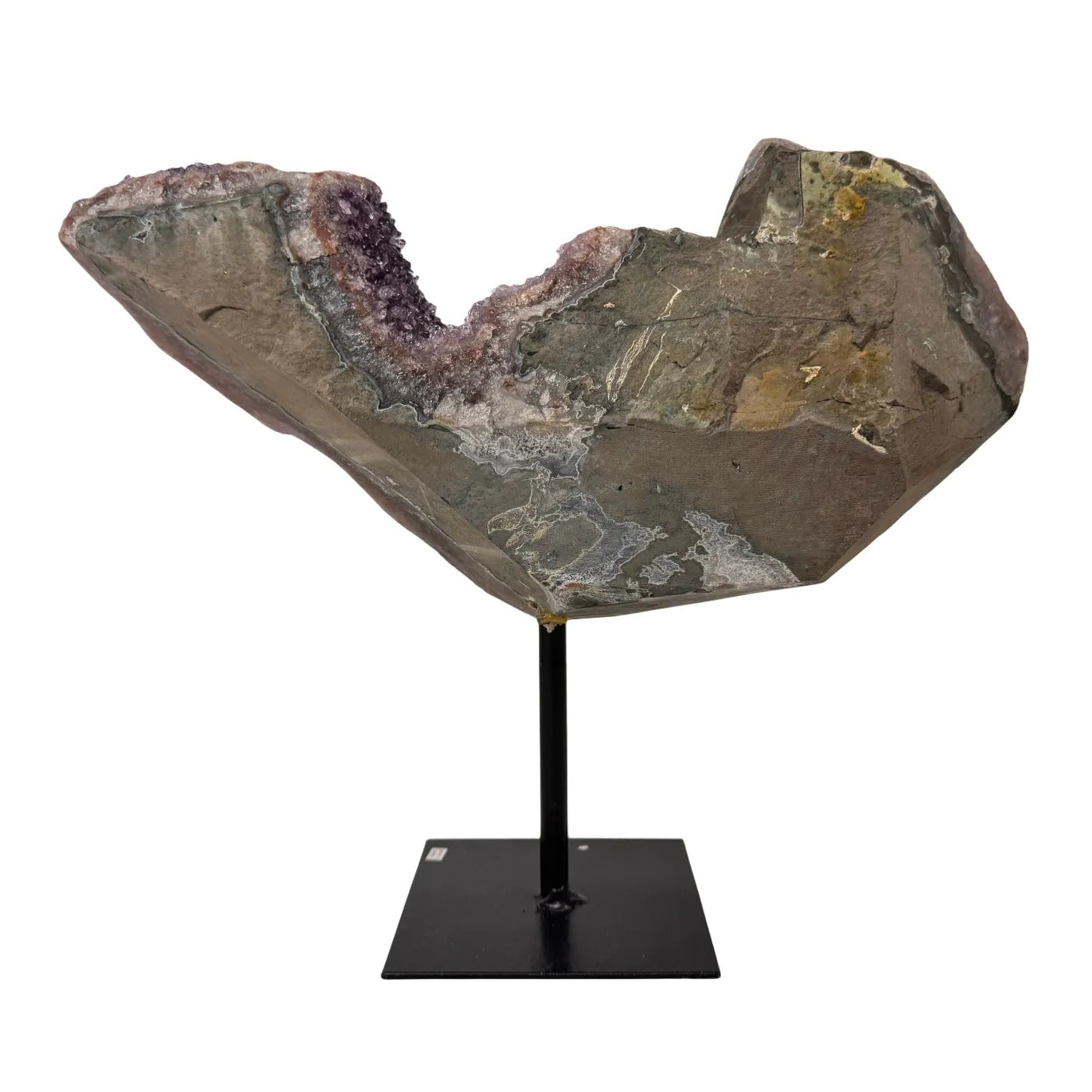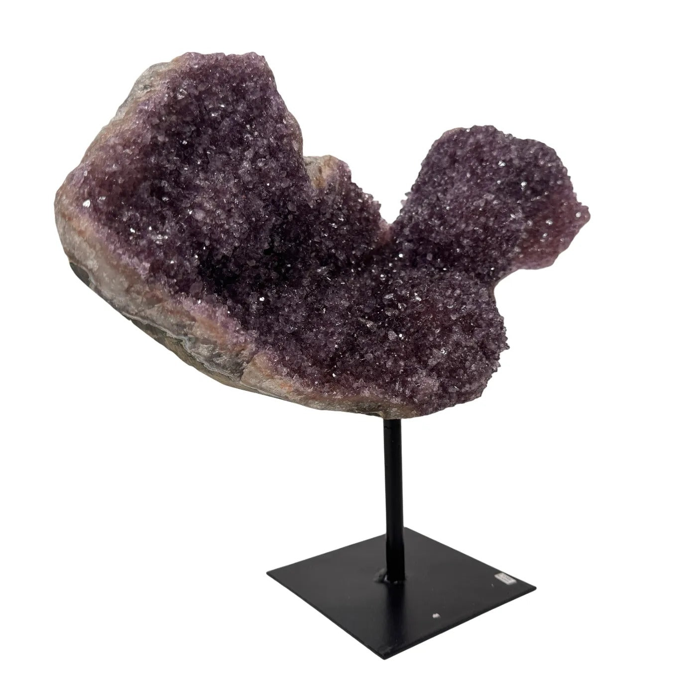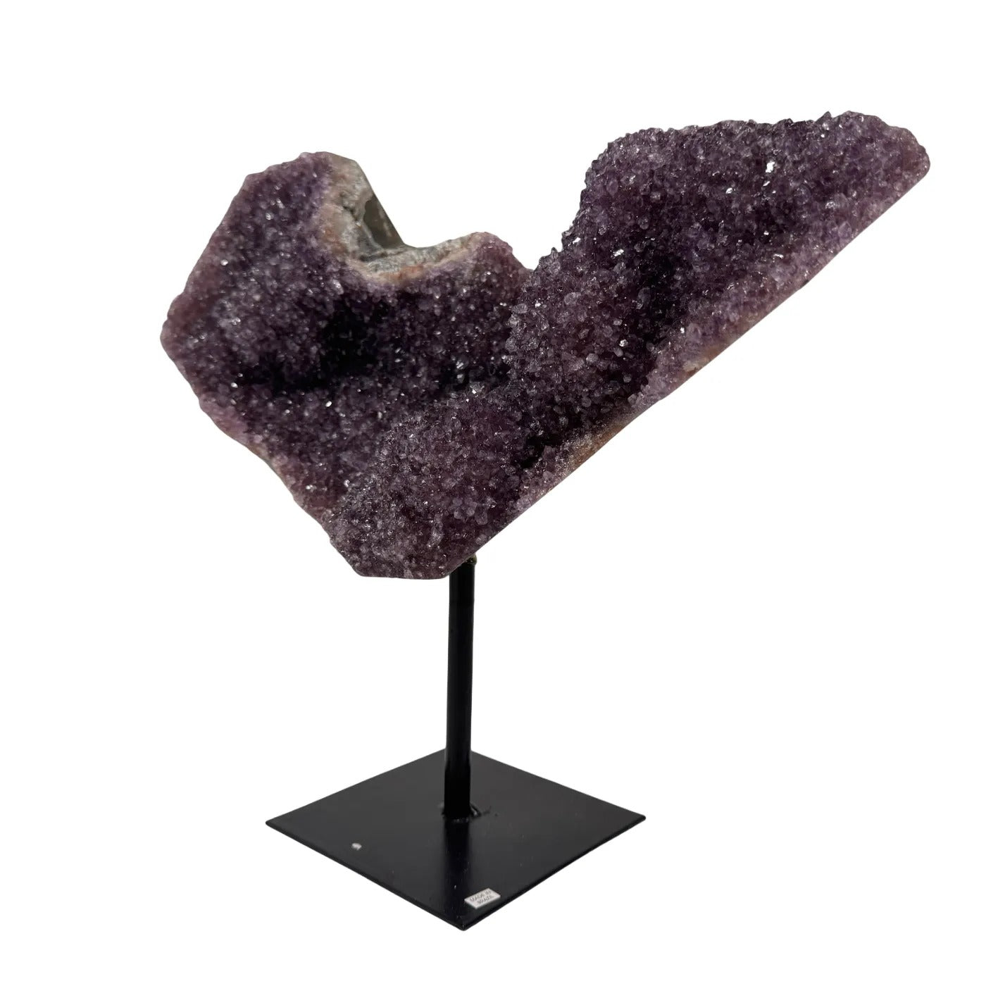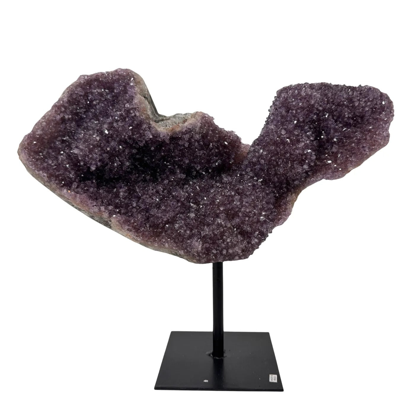 Prachtige krachtige amethist van hoge kwaliteit, stijlvol gepresenteerd op een zwarte metalen standaard. De steen is volledig origineel en geslepen aan de zijkanten.