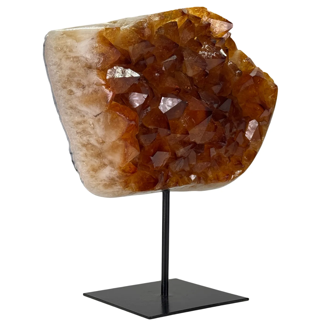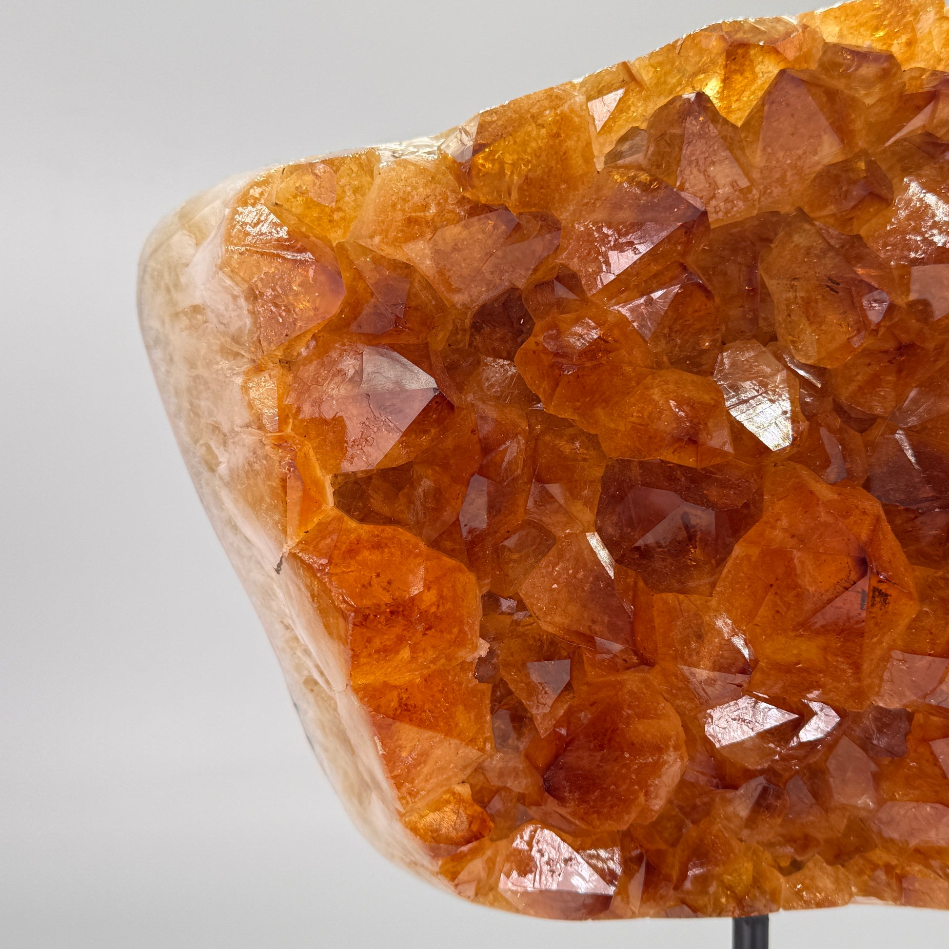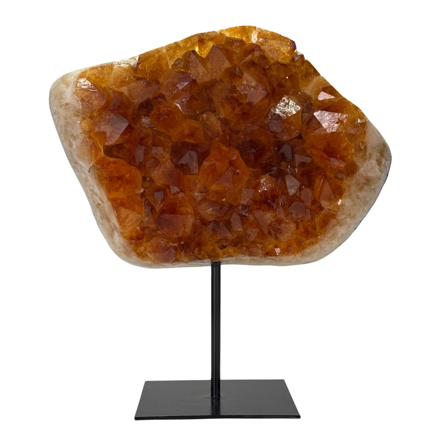 Prachtige citrien uit Brazilië, elegant gepresenteerd op een zwarte metalen standaard.