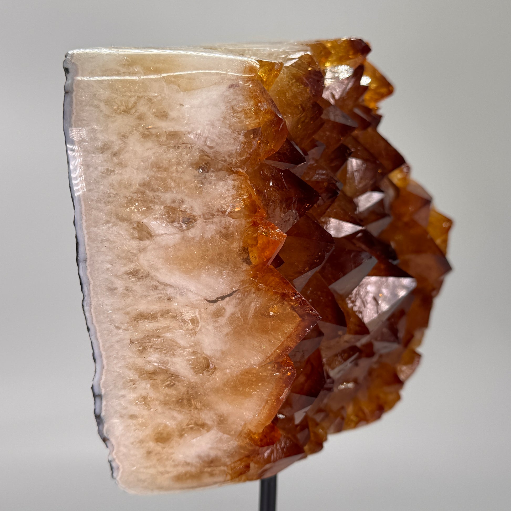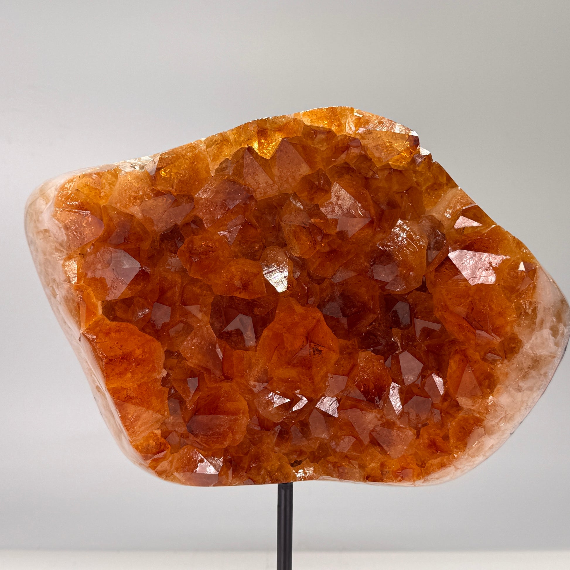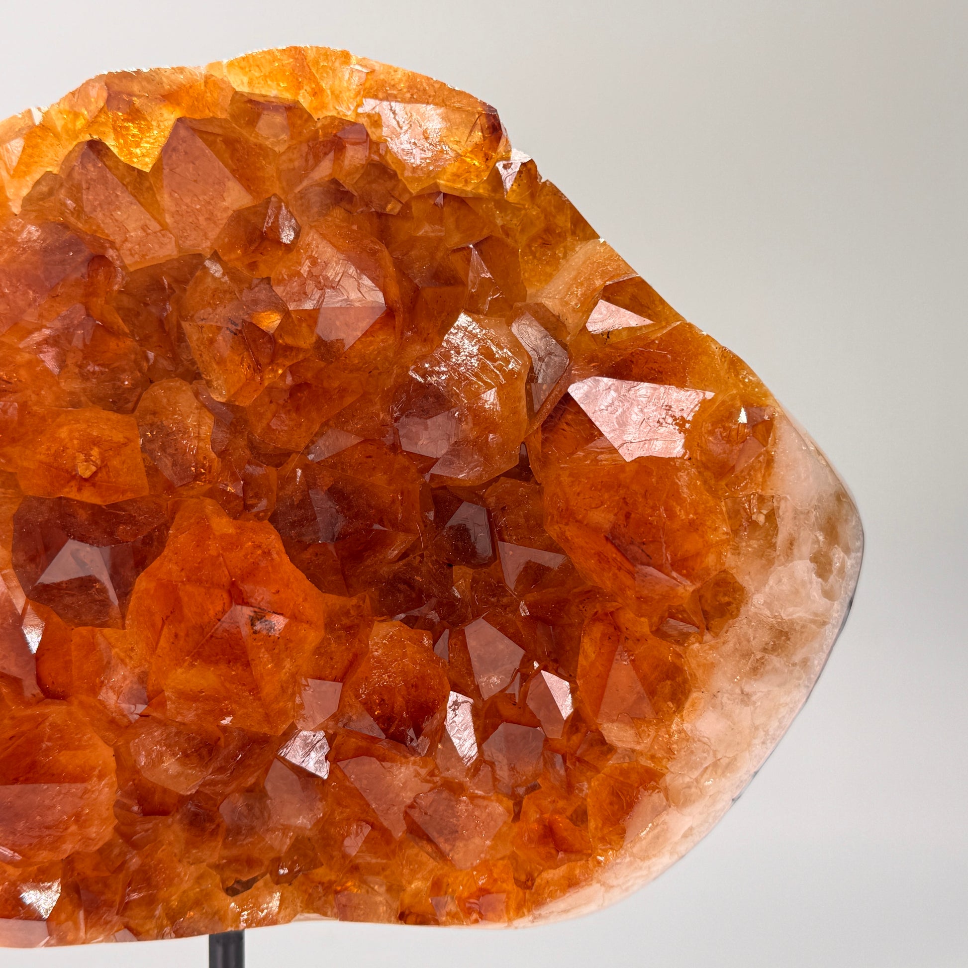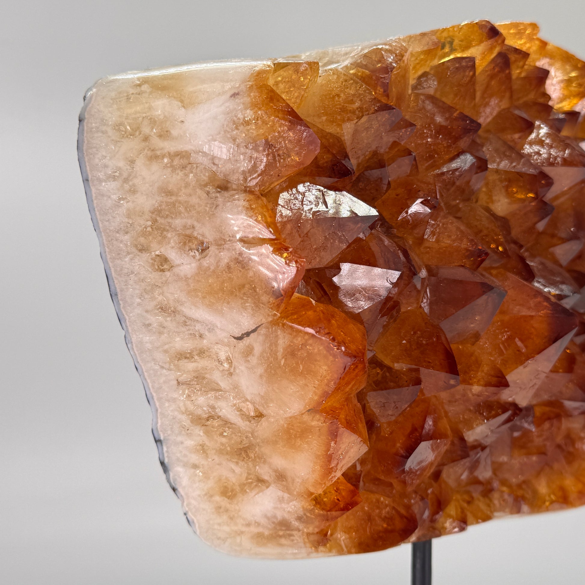 Prachtige citrien uit Brazilië, elegant gepresenteerd op een zwarte metalen standaard.