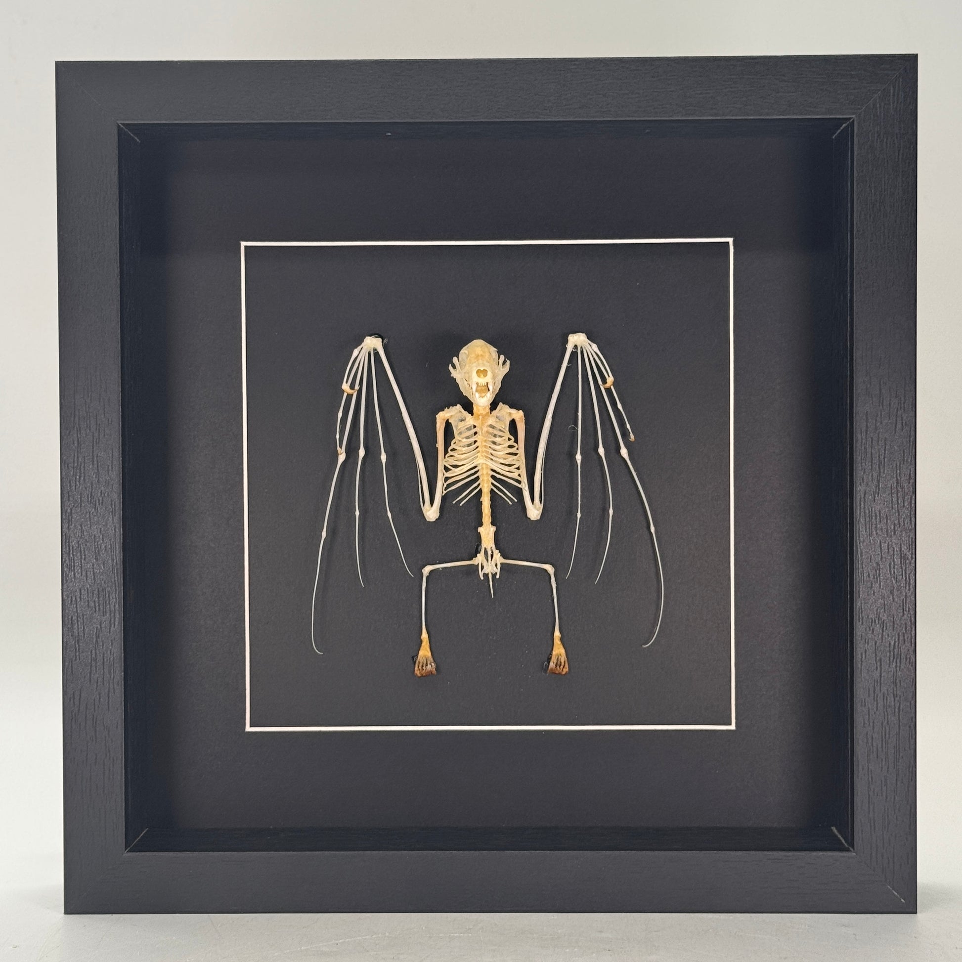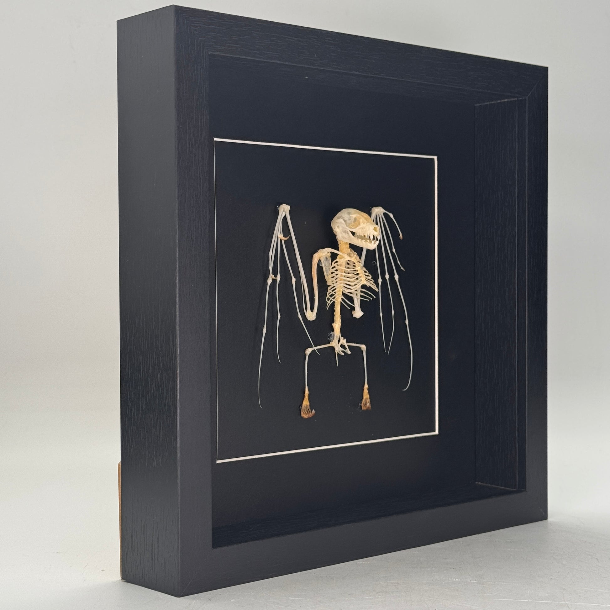 Uniek vleermuisskelet van de soort Cynopterus minutus, zorgvuldig gepresenteerd in een luxe diepe lijst van 25 × 25 cm. Dit authentieke skelet is afkomstig uit Indonesië en biedt een fascinerend kijkje in de anatomie van deze bijzondere vleermuissoort.