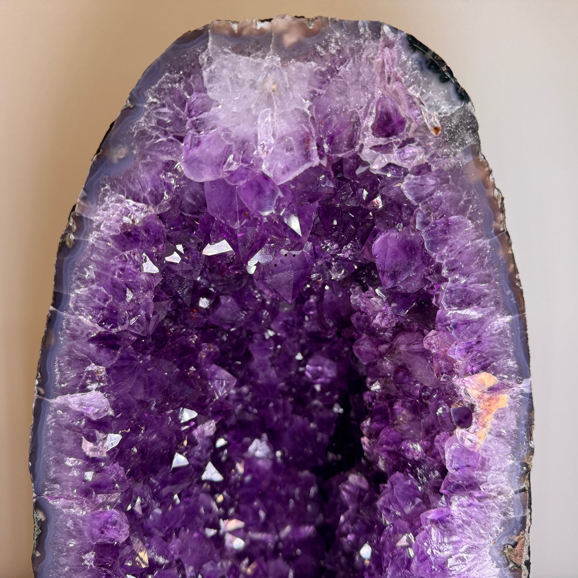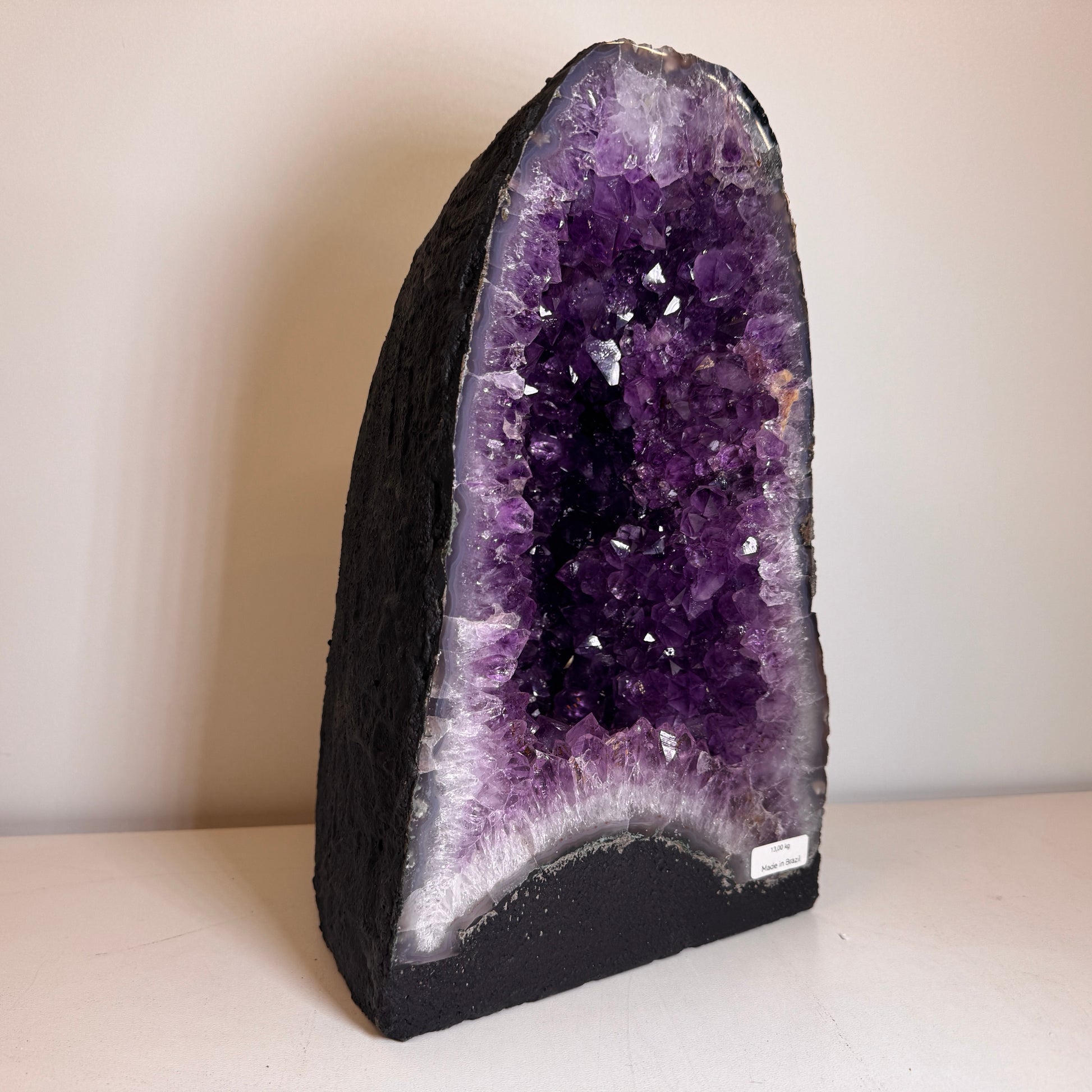 Deze indrukwekkende amethist komt uit Uruguay, bekend om zijn uitzonderlijke kwaliteit en diepe paarse kristalpunten. Dit unieke stuk heeft prachtige, grote amethistpunten met mogelijke hematiet-insluitingen, wat zorgt voor extra schittering en karakter.