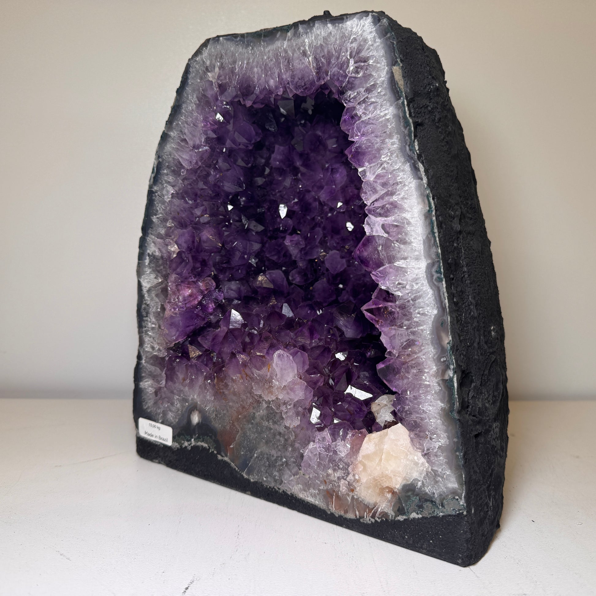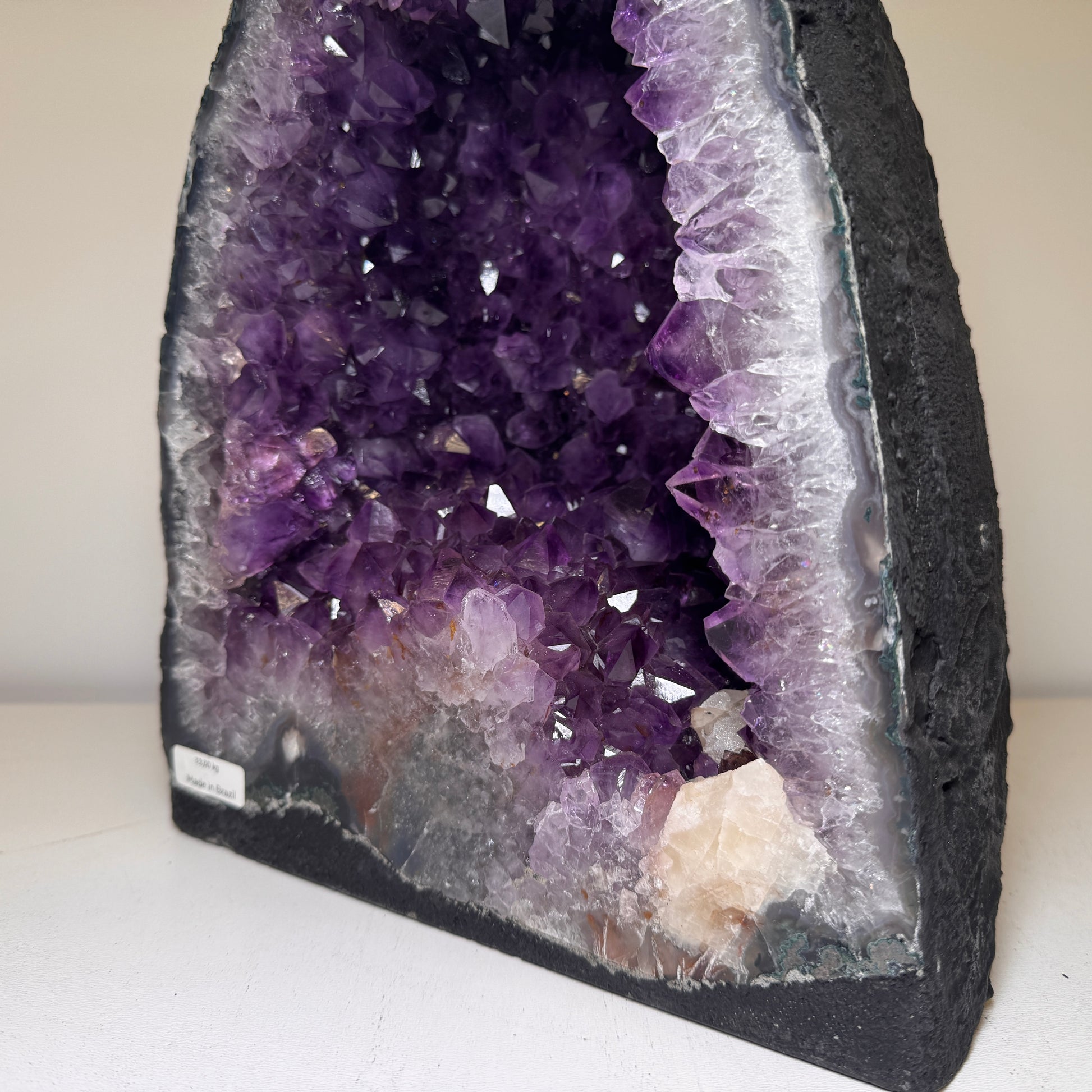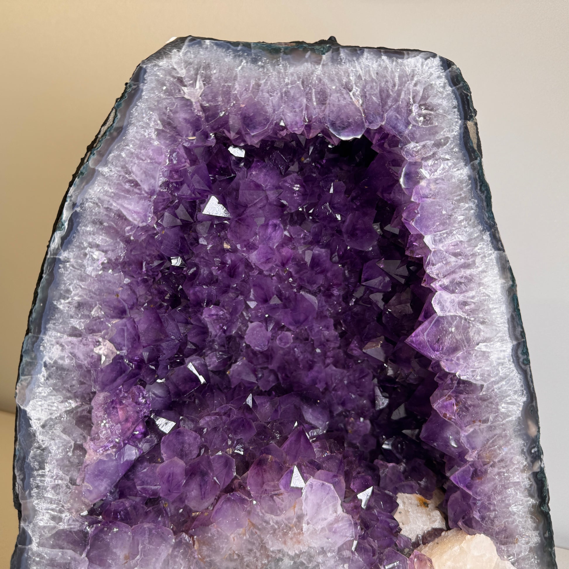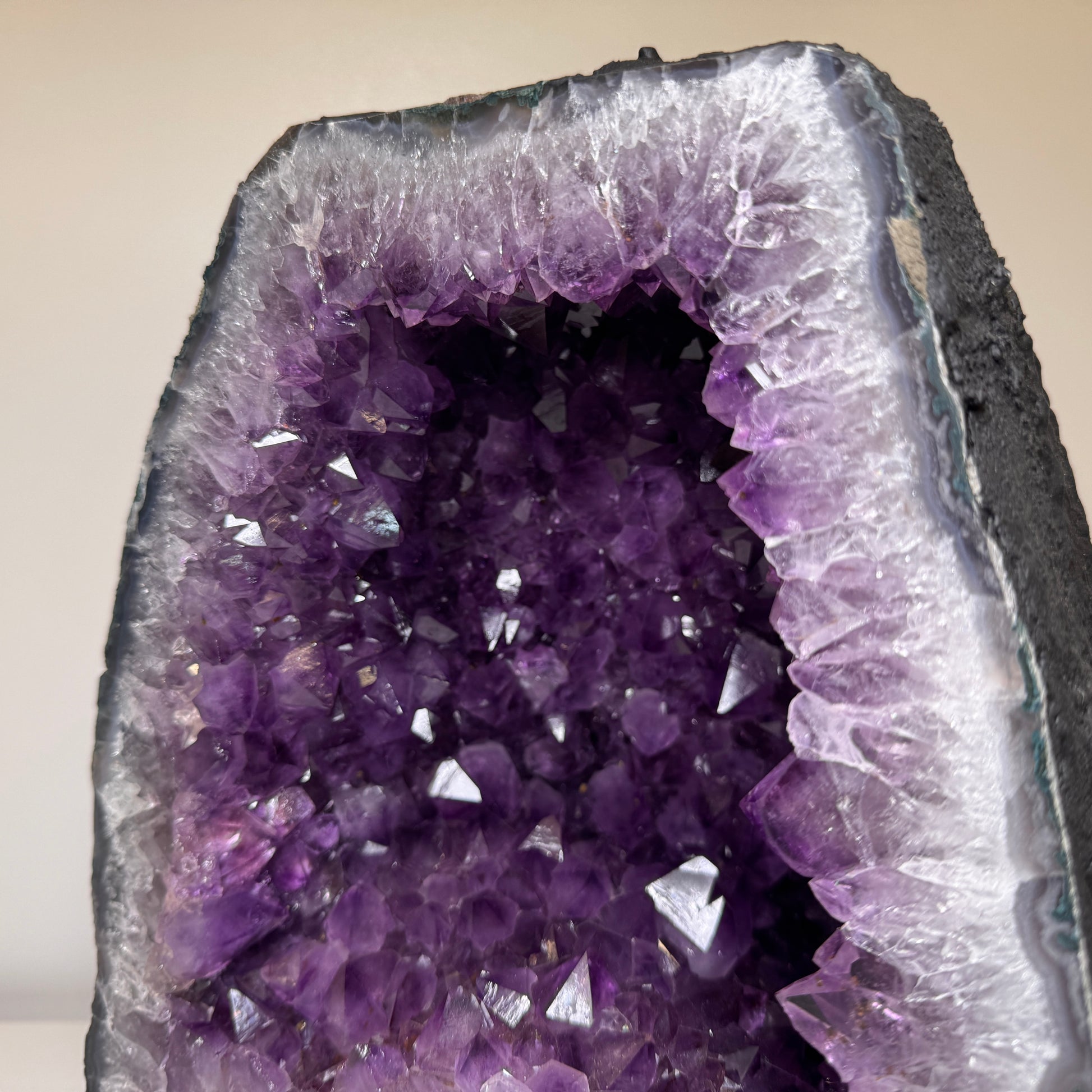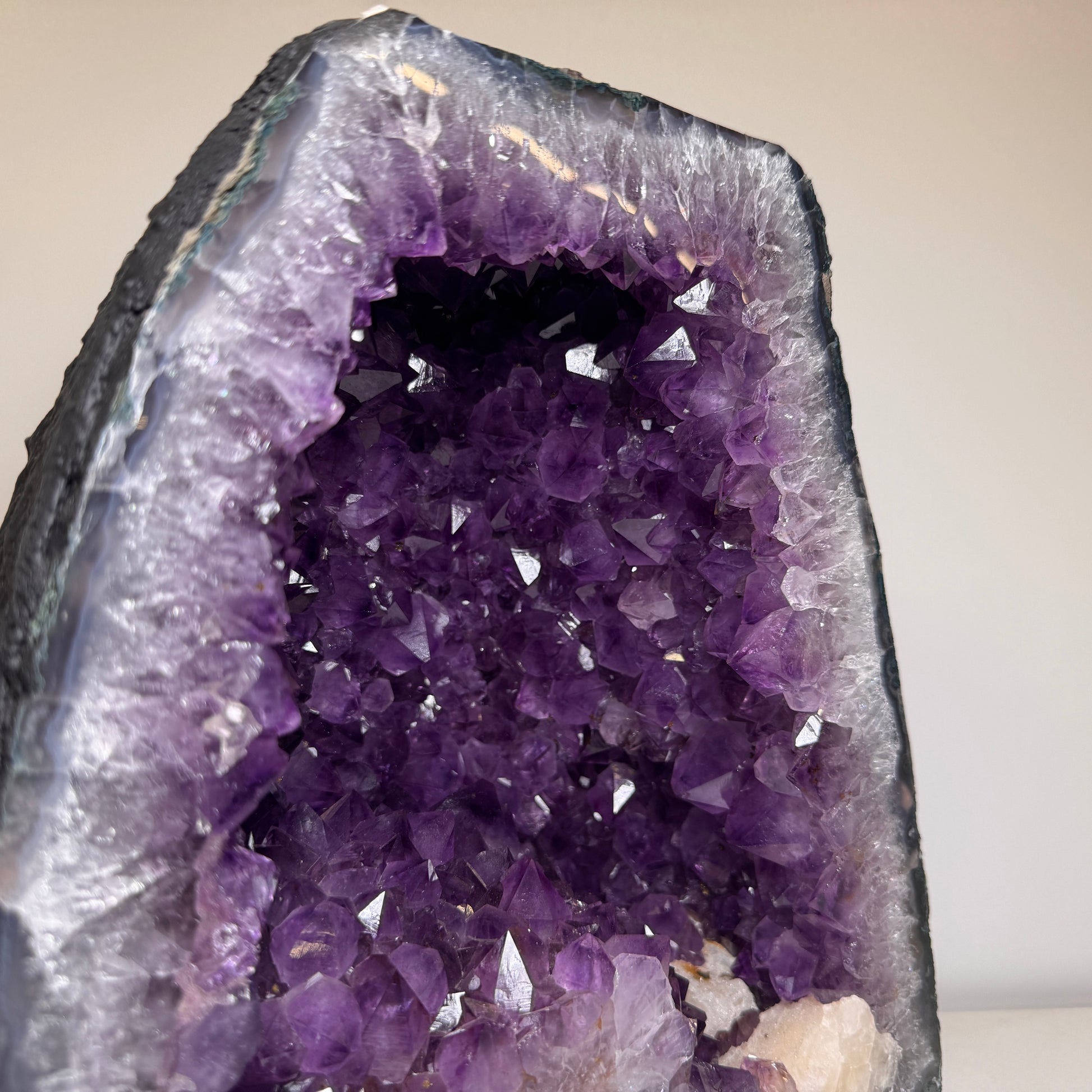 Deze indrukwekkende amethist komt uit Uruguay, bekend om zijn uitzonderlijke kwaliteit en diepe paarse kristalpunten. Dit unieke stuk heeft prachtige, grote amethistpunten met mogelijke hematiet-insluitingen, wat zorgt voor extra schittering en karakter.