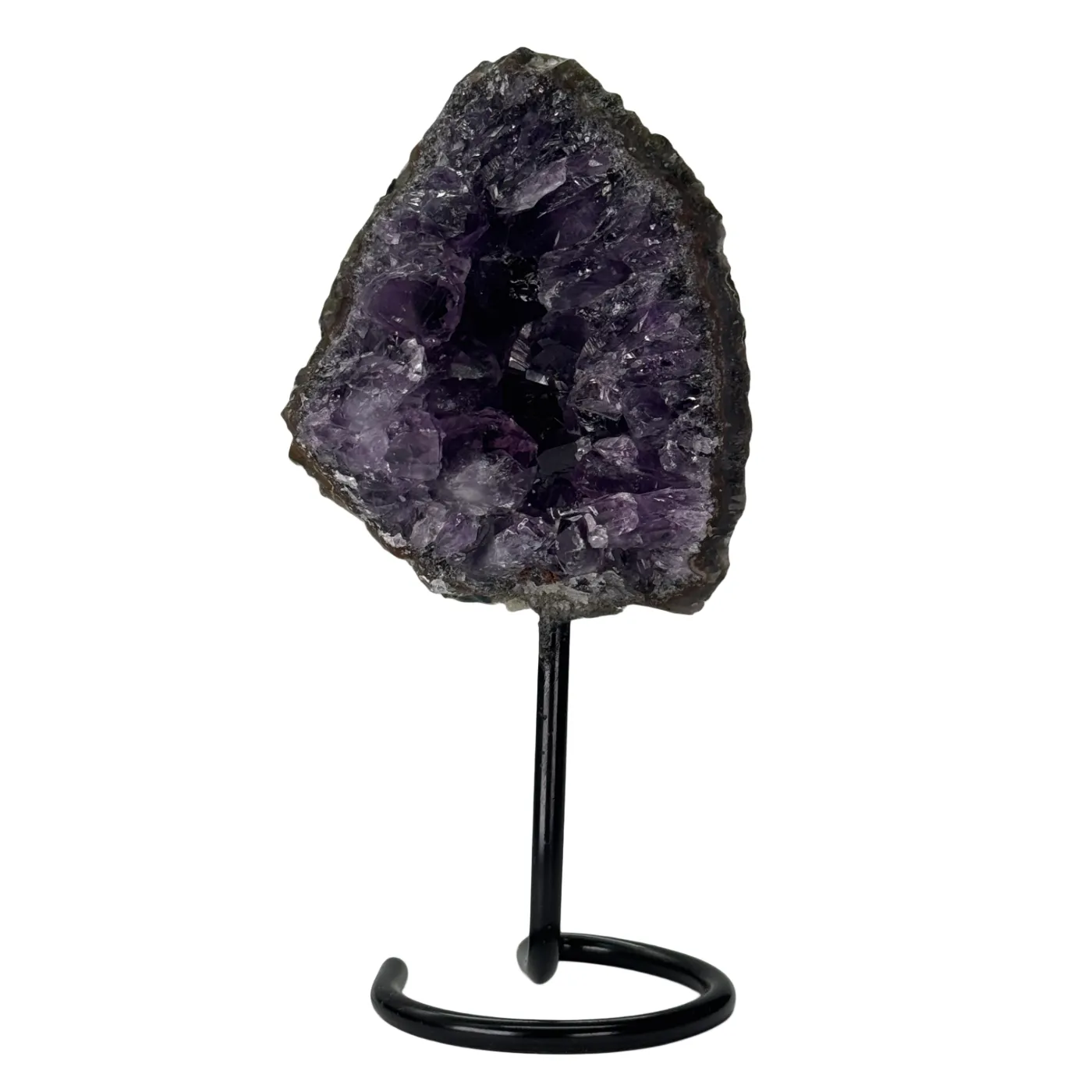 Prachtige ruwe amethist cluster op een metalen voet met zwarte coating. Deze amethist heeft een diepe donkerpaarse kleur en is volledig onbewerkt, rechtstreeks afkomstig uit Brazilië. Door de natuurlijke vorm en intense kleur is dit een stijlvolle en unieke decoratie voor elk interieur.