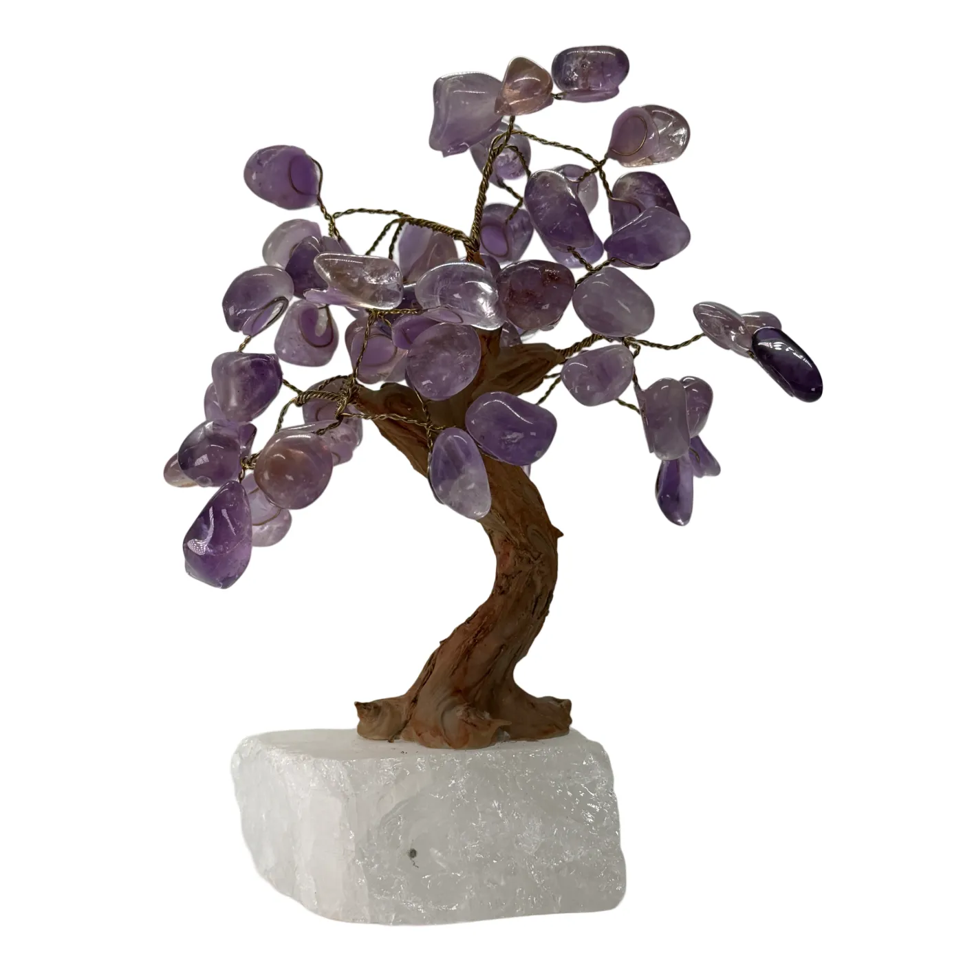 Dit decoratieve edelsteen boompje is voorzien van gepolijste edelsteen bladeren en staat op een natuurlijke bergkristal voet. De boompjes zijn verkrijgbaar in verschillende soorten edelstenen, allemaal gepolijst en afkomstig uit Brazilië. De voet is gemaakt van echte bergkristal; bij de rozenkwarts variant is de voet uitgevoerd in rozenkwarts; bij de citrien variant is de voet uitgevoerd in oranje calciet