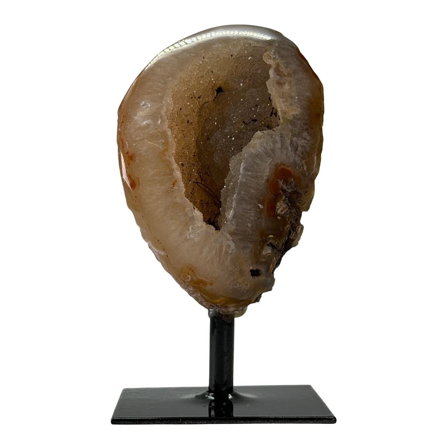 Deze prachtige kleine agaat rots is geplaatst op een standaard en heeft schitterende druzy kristallen die mooi glinsteren. De randen van de agaat zijn gepolijst, waardoor de natuurlijke kleuren, lijnen en structuur extra goed zichtbaar zijn. De steen is volledig natuurlijk en afkomstig uit Brazilië, wat elk exemplaar uniek maakt.