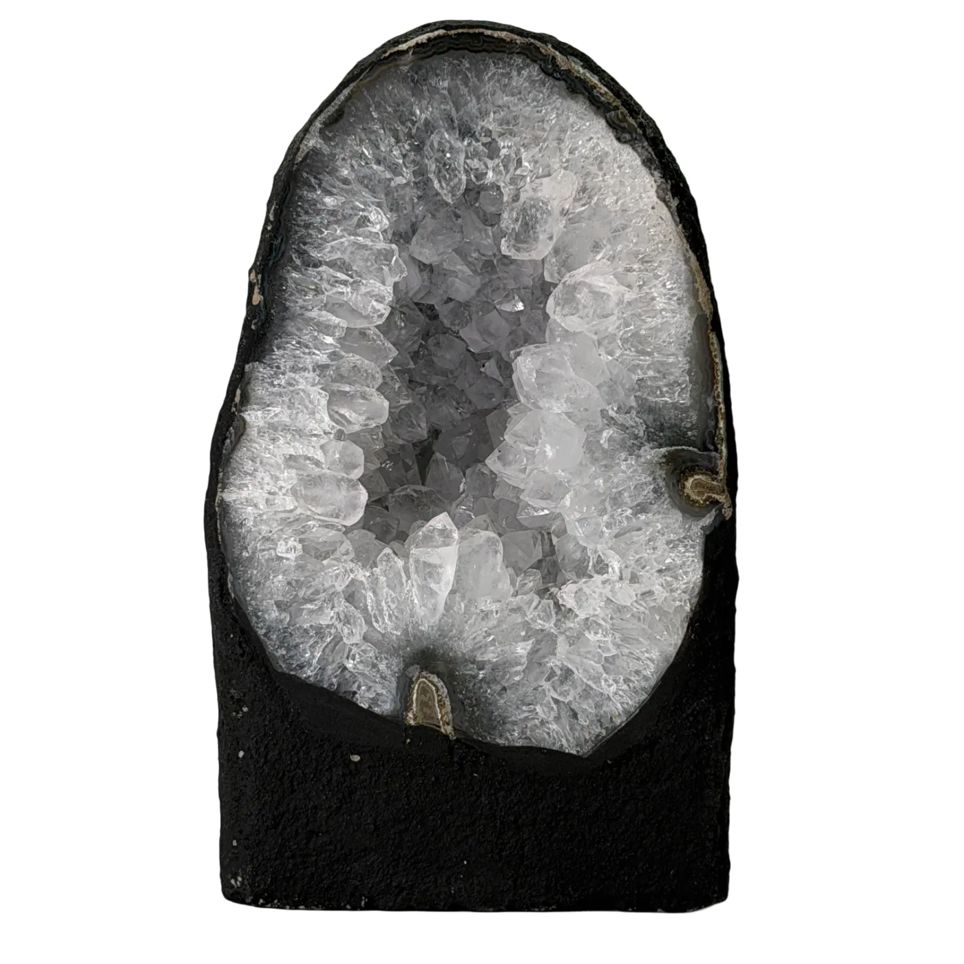 Elegante amethist geode in kathedraalvorm met een lichte tot witte kristalkleur. De fijne kristallen schitteren subtiel en geven de steen een zachte, verfijnde uitstraling.