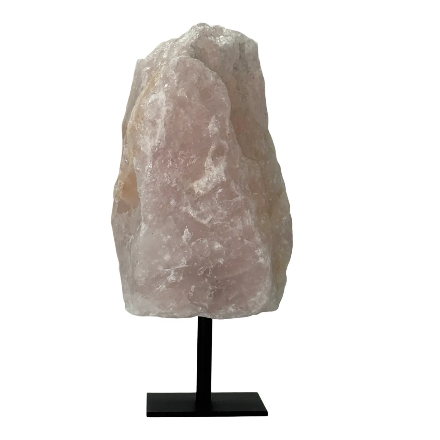 Deze ruwe rozenkwarts is volledig natuurlijk en onbewerkt, afkomstig uit Brazilië. Rozenkwarts staat bekend als de steen van de liefde en wordt vaak geassocieerd met rust, harmonie en een kalmerende werking. Dankzij de metalen standaard is dit stuk perfect om neer te zetten als subtiele, natuurlijke decoratie in huis of op kantoor.