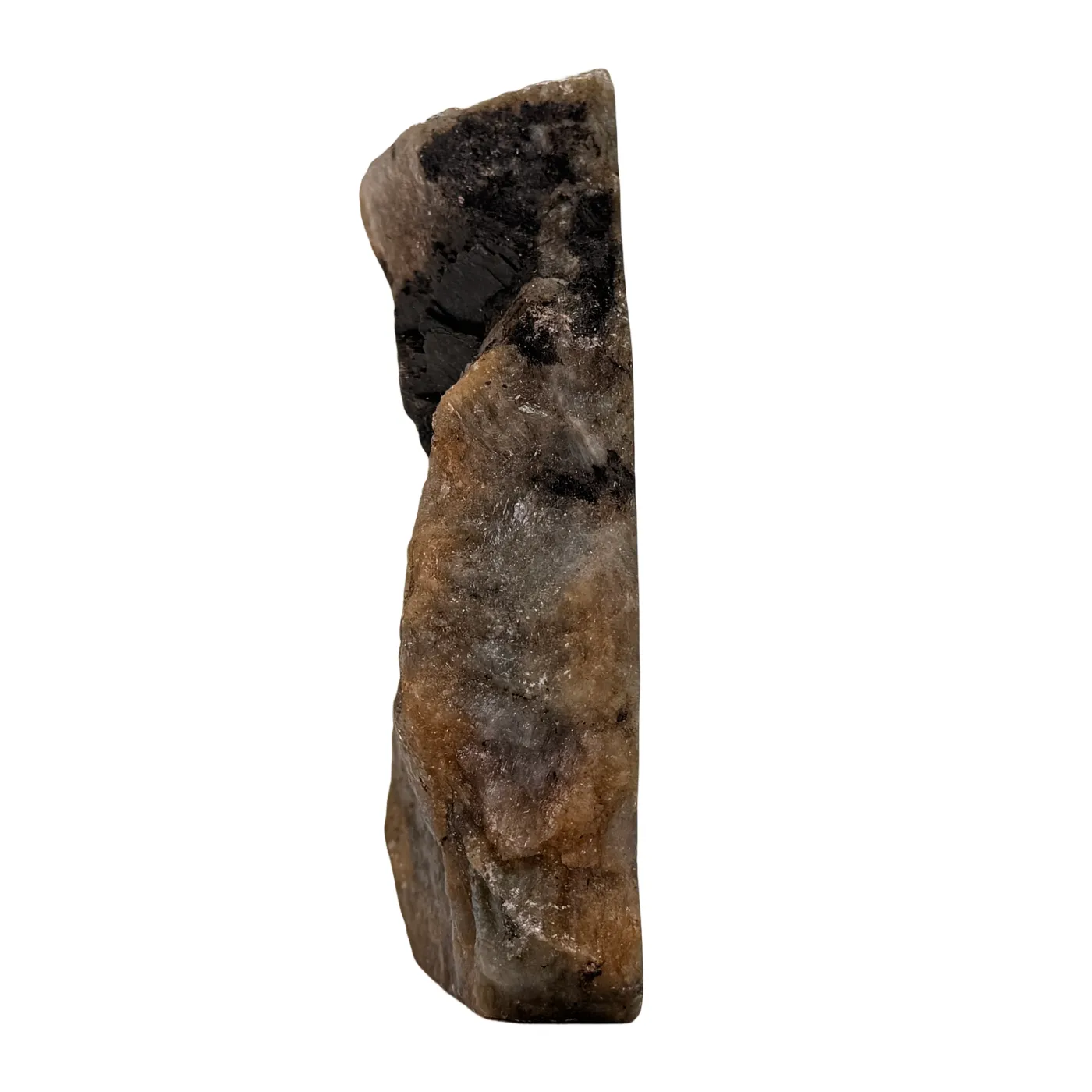 Prachtige bijzondere labradoriet uit Madagaskar. De steen is half ruw en half gepolijst, waardoor de natuurlijke structuur prachtig contrasteert met de gladde, glanzende vlakken. Dankzij de polijsting komt de karakteristieke blauwe flash indrukwekkend tot leven en toont de steen zijn unieke kleuren en patronen.