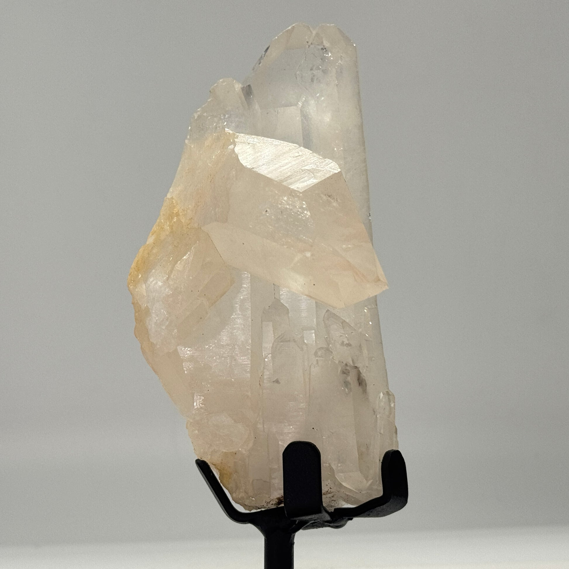 De steen heeft een heldere tot wit-transparante kleur en schittert prachtig in het licht. Elk stuk is uniek en zorgvuldig geplaatst op een zwarte metalen standaard, waardoor het zowel een krachtig spiritueel object als een stijlvolle decoratie vormt.