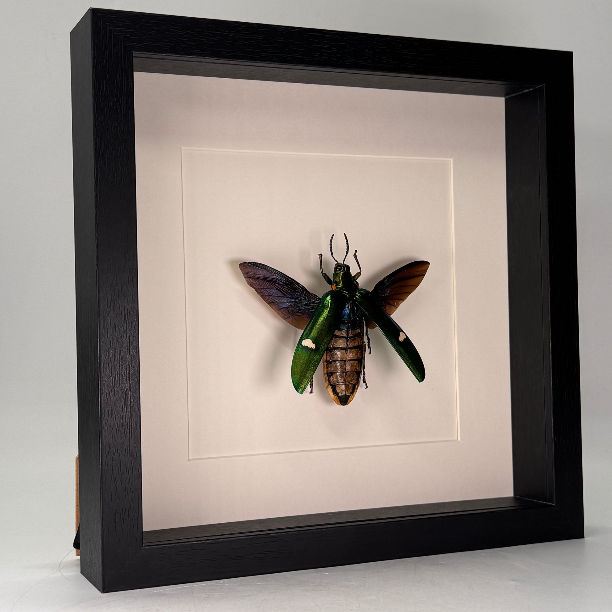 Het insect is vakkundig geprepareerd en gepresenteerd in een zwarte diepe houten lijst met wit passe-partout, waardoor de kleuren nog sterker naar voren komen. Een echte eyecatcher voor verzamelaars en liefhebbers van unieke natuurdecoratie.